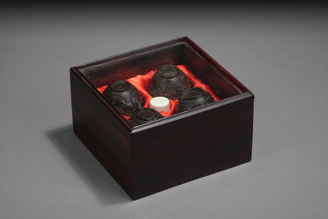 Rising from a short and slightly flared foot, each wine cups is intricately carved from coconut shells, and the exterior is decorate in shallow relief of bamboo, trees, and flowers, all bordered between two dotted bands each encircling bottom and mouth rim. Age related wear and slight damage. Qing Dynasty, Qianlong period.