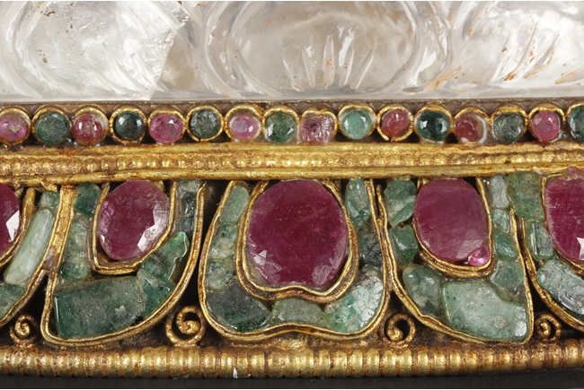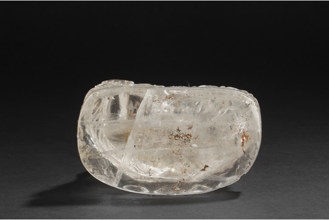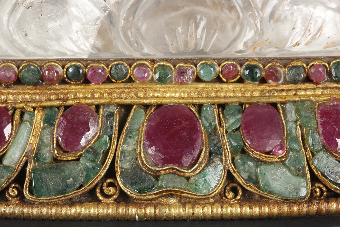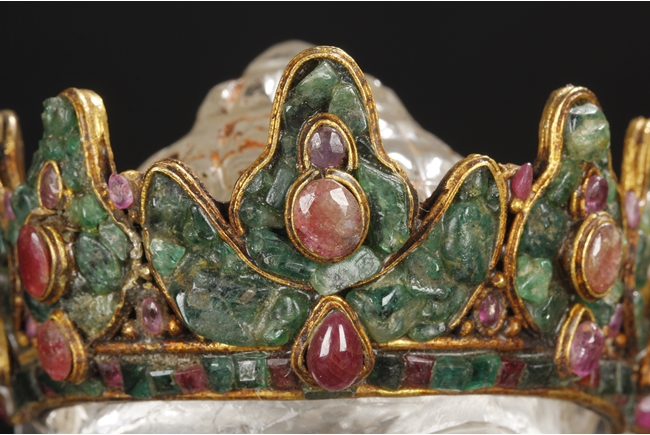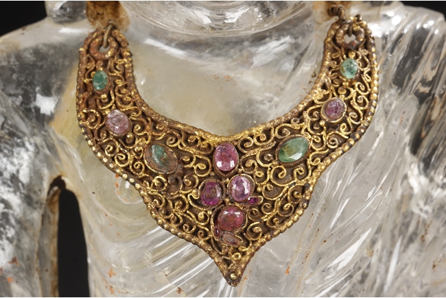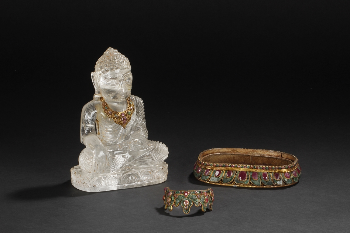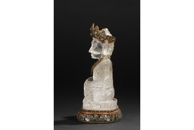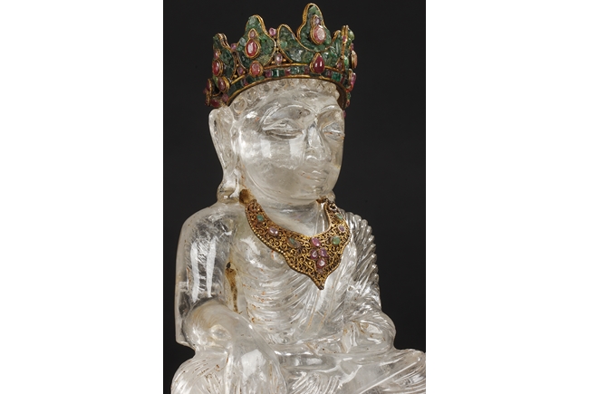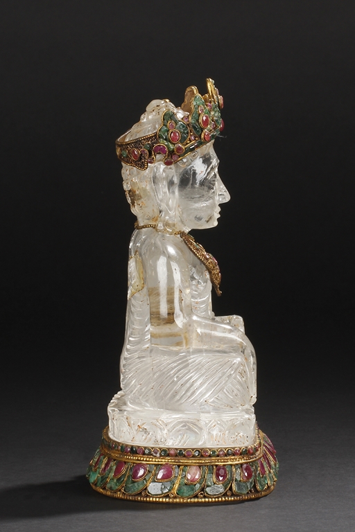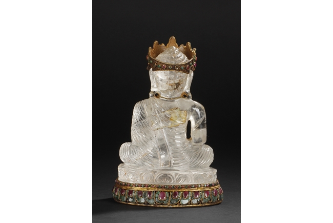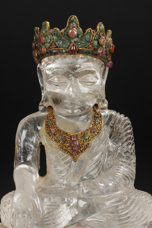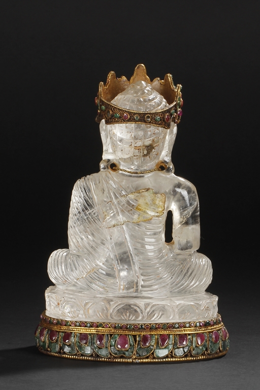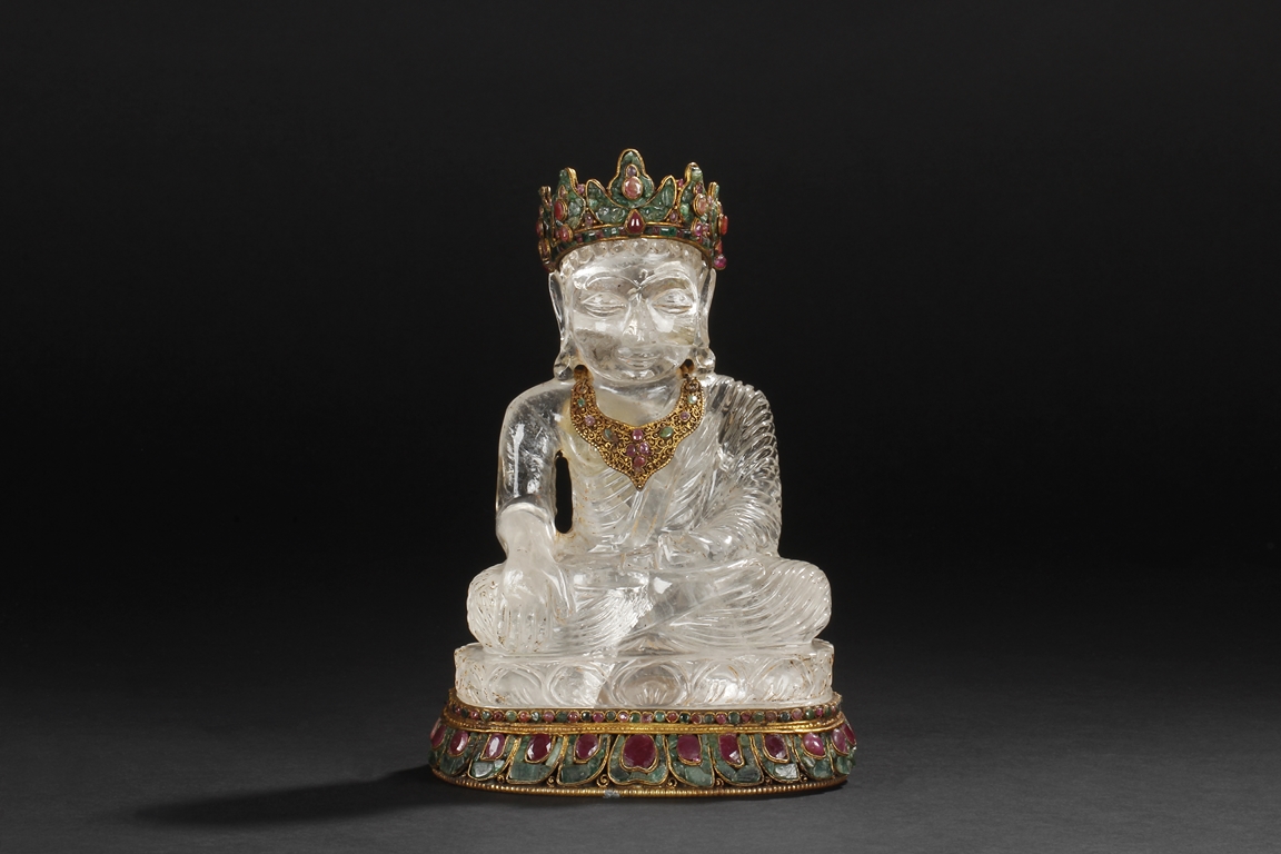 Seated on a crystal carved lotus base, this Bodhisattva figure is depicted with a serene manner with a downcast eyes. His hair is tied in ushnisha hidden by a gilt bronze crown adorned with gems. Wearing a loose shawl, his chest is covered by a jeweled gilt bronze necklace. The figure along with the crystal base as a whole is supported by a gilt bronze stand adorned with gems, including ruby, pink tourmaline, and green crystal. Qing Dynasty period.