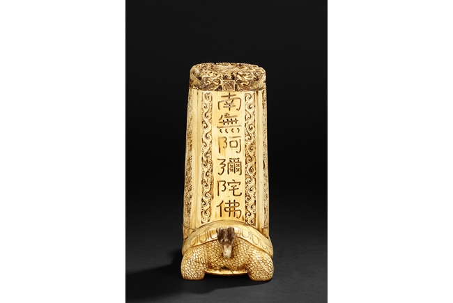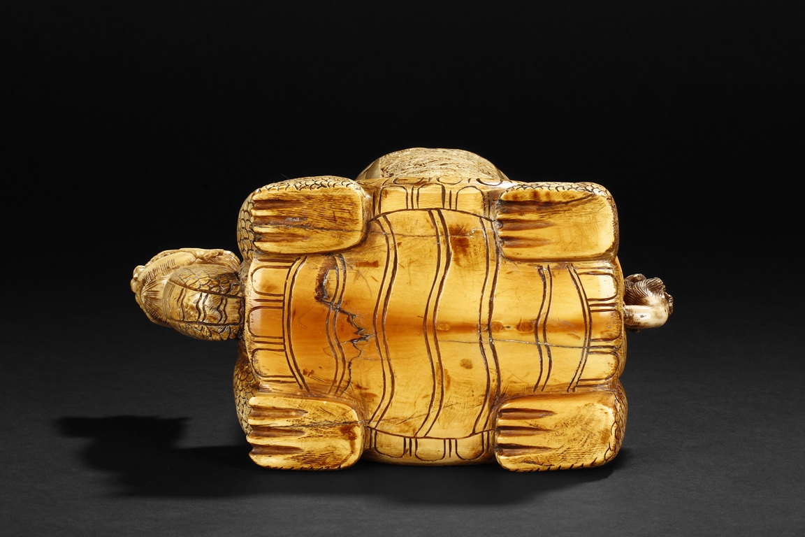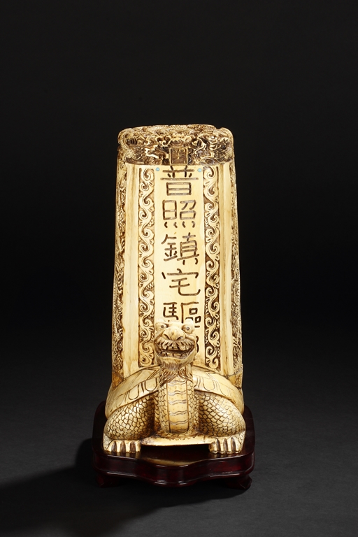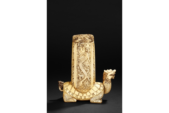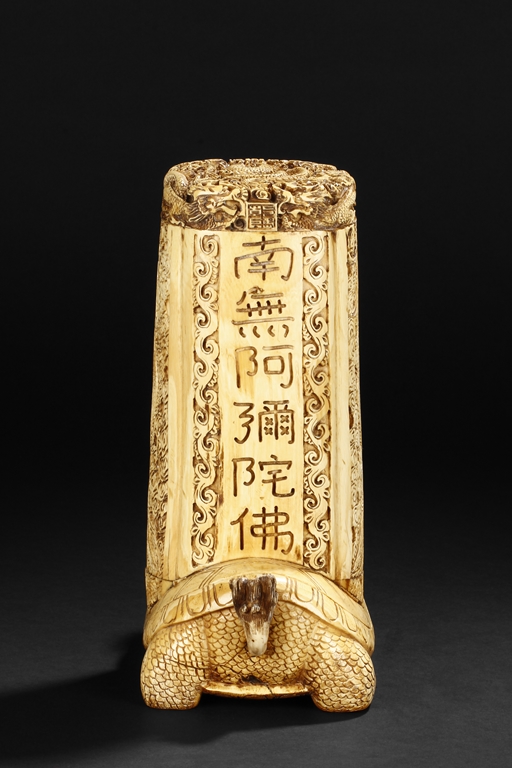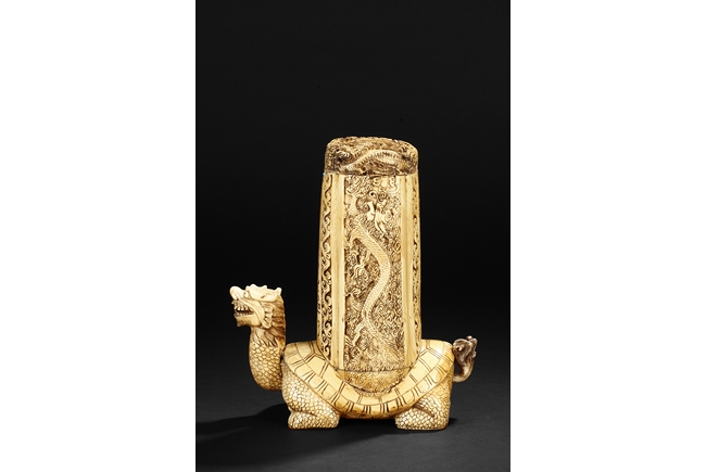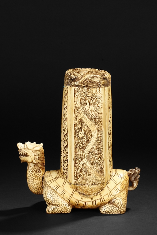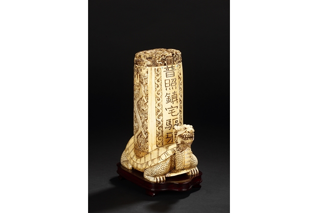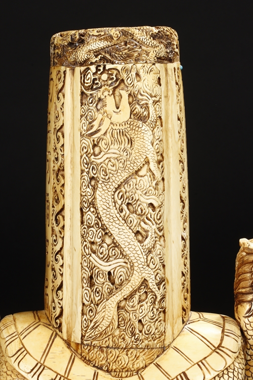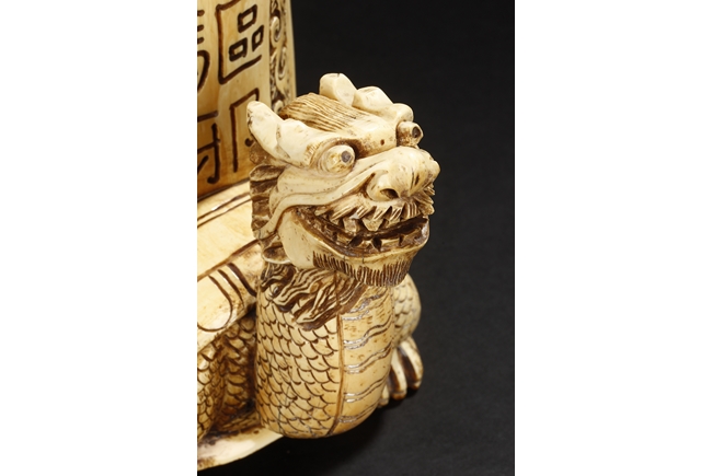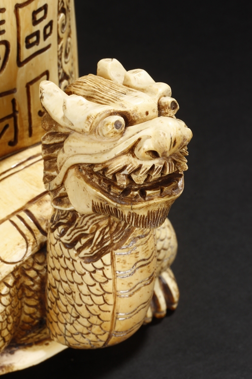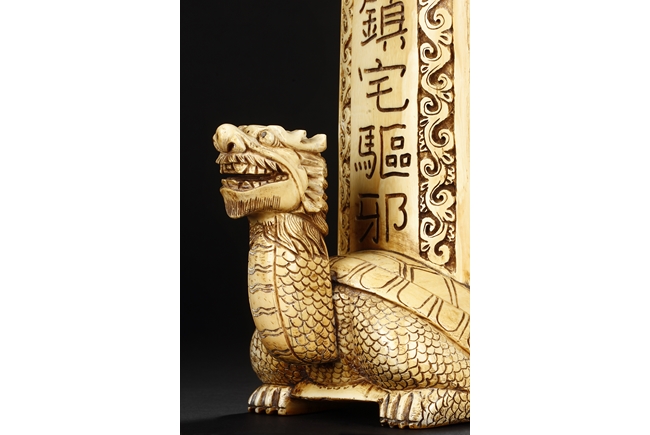 The carving depicts a large turtle carrying a rectangular dragon pillar on its back. The pillar has Chinese characters on the front and back, the sides relief carved with four-claw dragons flying upwards amidst clouds chasing after flaming pearl, the top rests three curled dragons, with a stamp mark in front. Age related wear. Early Republic period.