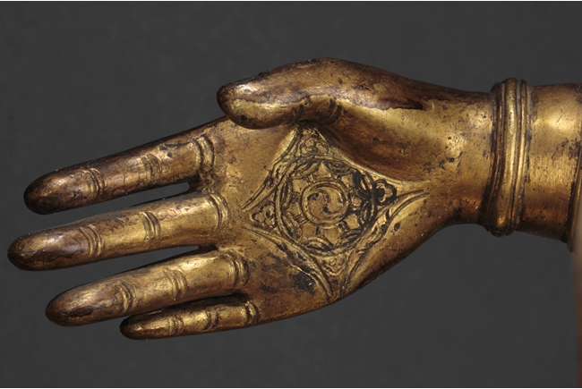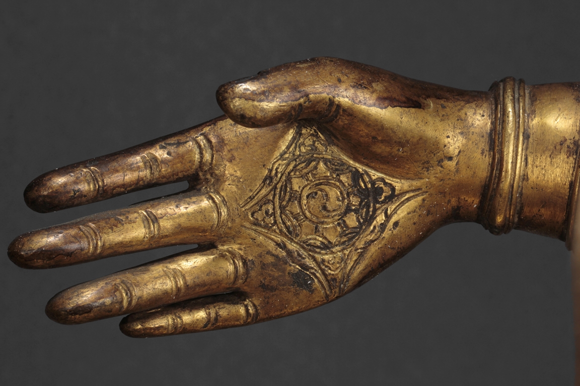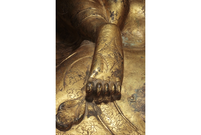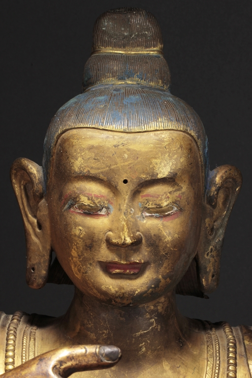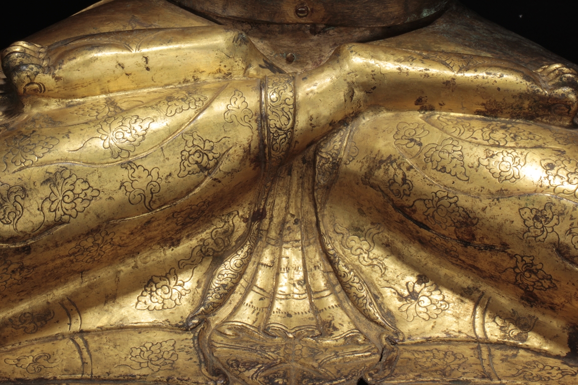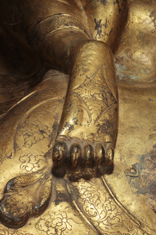 Seated in dhyanasana, the Buddha's right palm bent inwards at chest level, left hand also bent inwards, thumb touching the middle finger, and index finger pointing outwards. The Buddha's pants decorated with delicate flower patterns, beaded jewelry on his bare chest, similar armbands and wrist bands on both arms, the palms and bottom of feet with similar motif. Early Qing Dynasty Period.