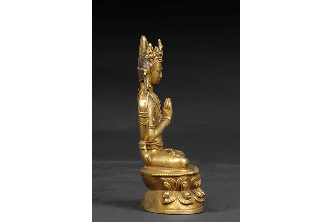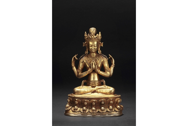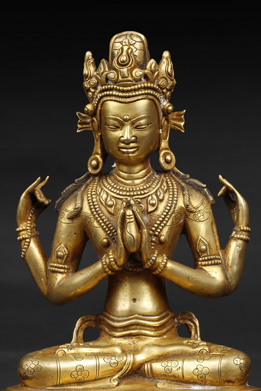Seated in dhyanasana on a double lotus throne, his two hands clasped together with a ritual ornament in-between, and other two hands in apana mudra. wearing many ornated bead strands around neck and arm, the Avalokitesvara is shown with a stern expression. Qing Dynasty period.