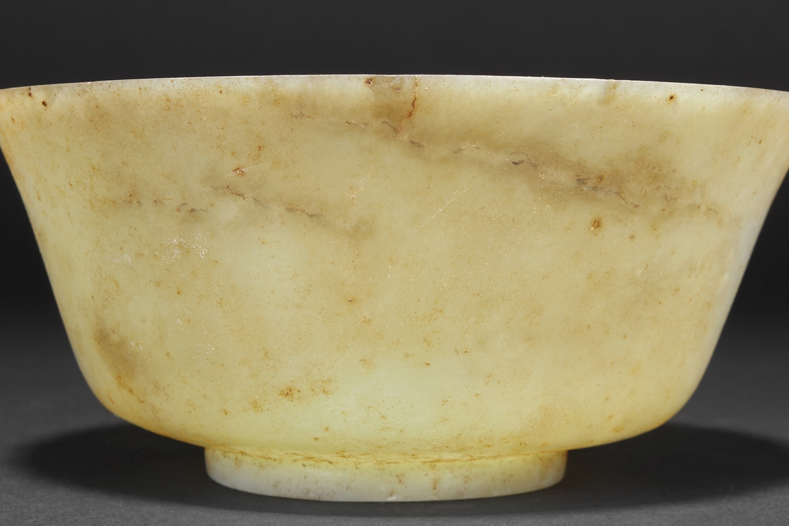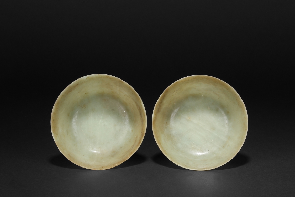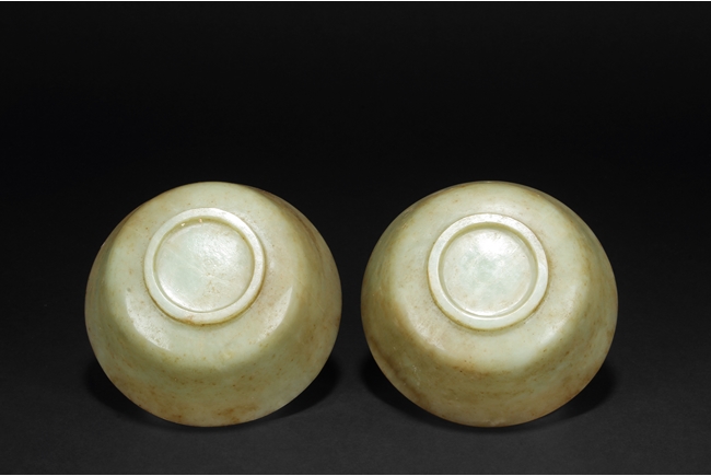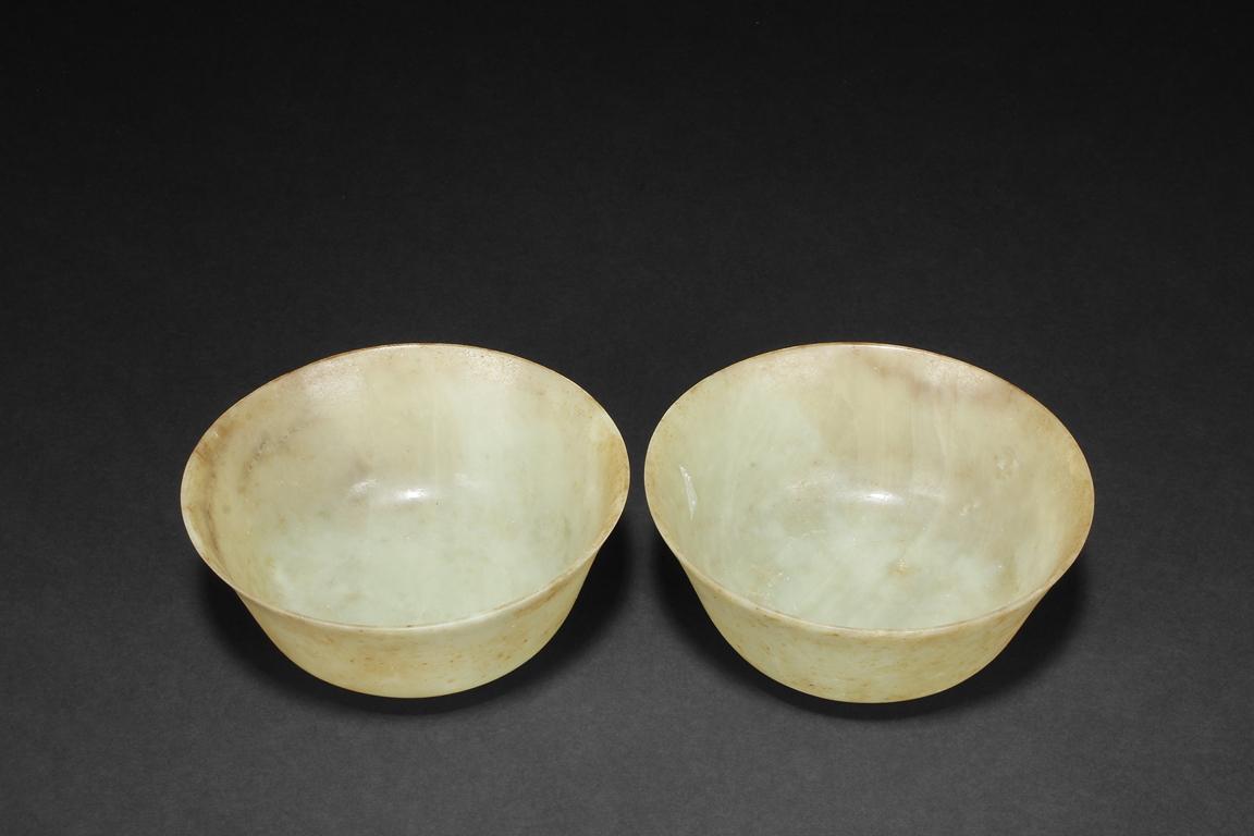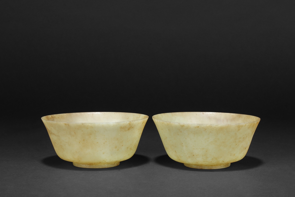 Supported on a short circular foot, each bowl rises from a deep flared sides to a wide everted mouth rim. The bowl is of both yellowish-white and russet tone, with markings and veins of russet tone both on interior and exterior. Qing Dynasty period.