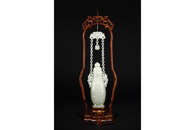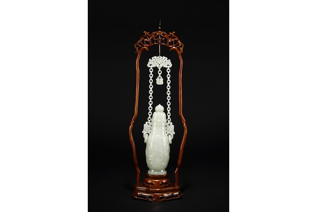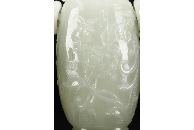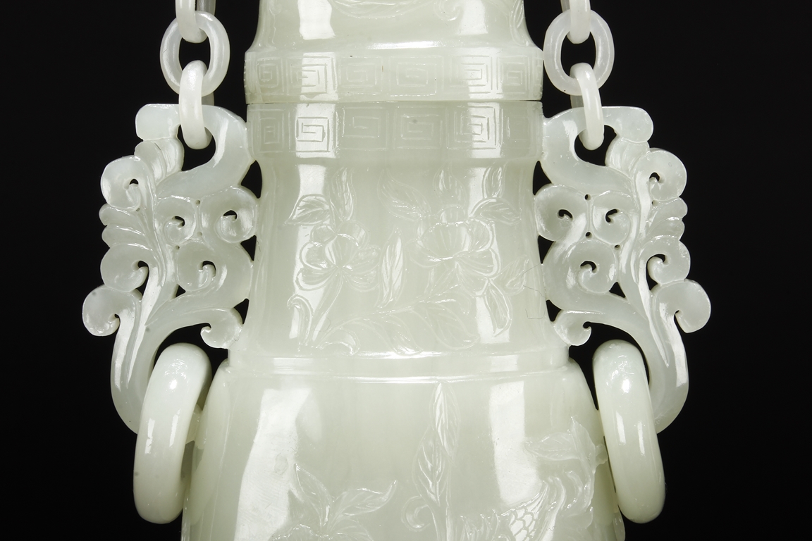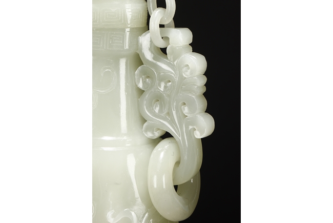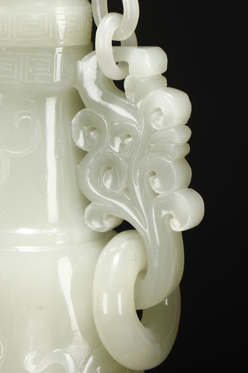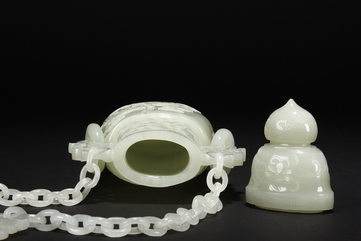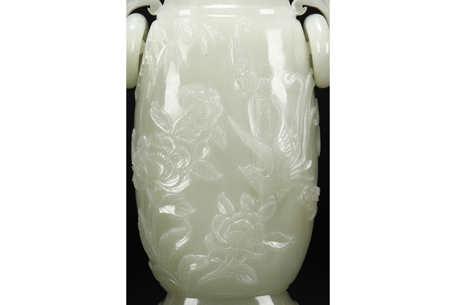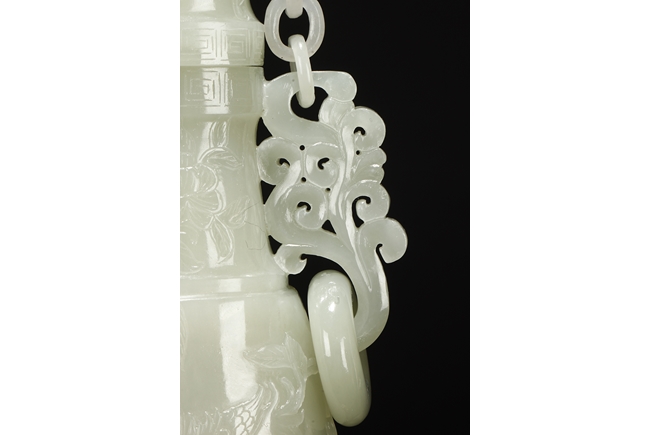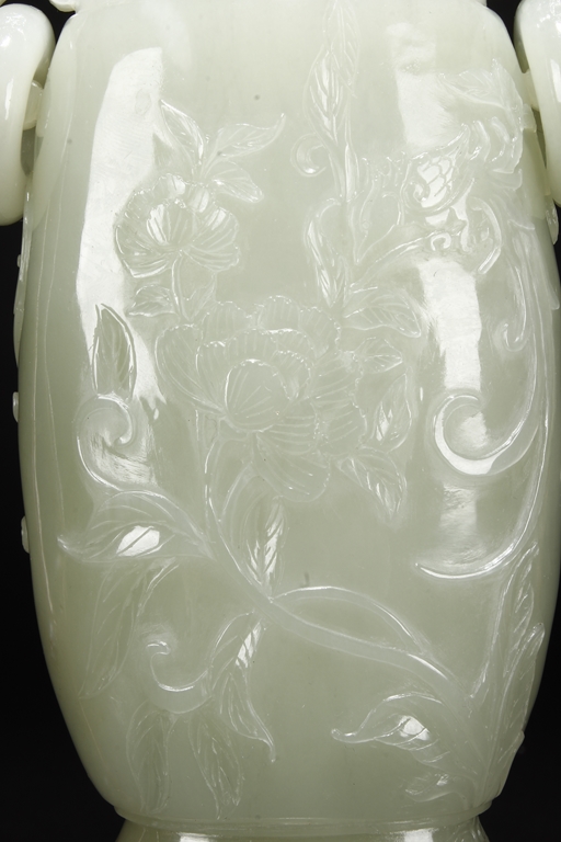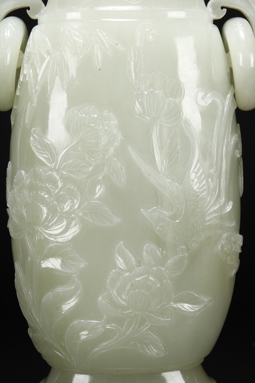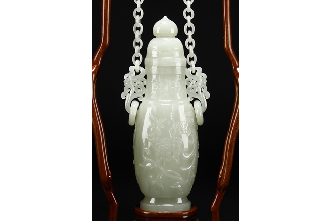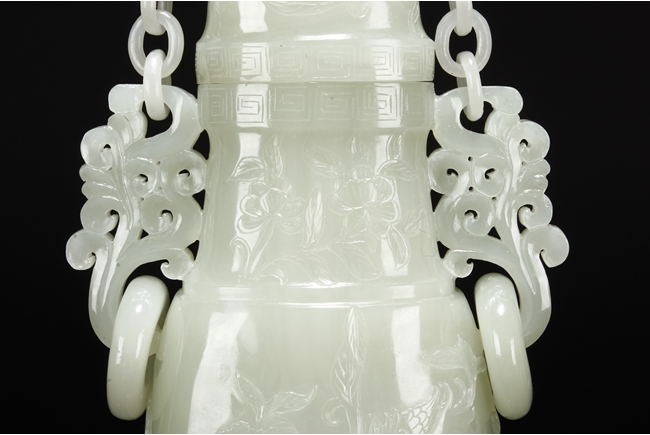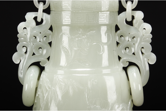Of flattened hu form, the vase is delicately carved in shallow relief with rose-heads, foliage, bamboo, and magpie in body and neck, along with a band of key-fret pattern above the neck. The neck is flanked by a pair of elaborate openwork ring handles connected with a linked loose chain to a openwork pendant. The vase is surmounted by a domed cover with a bud finial. The stone is of white and pale tone.