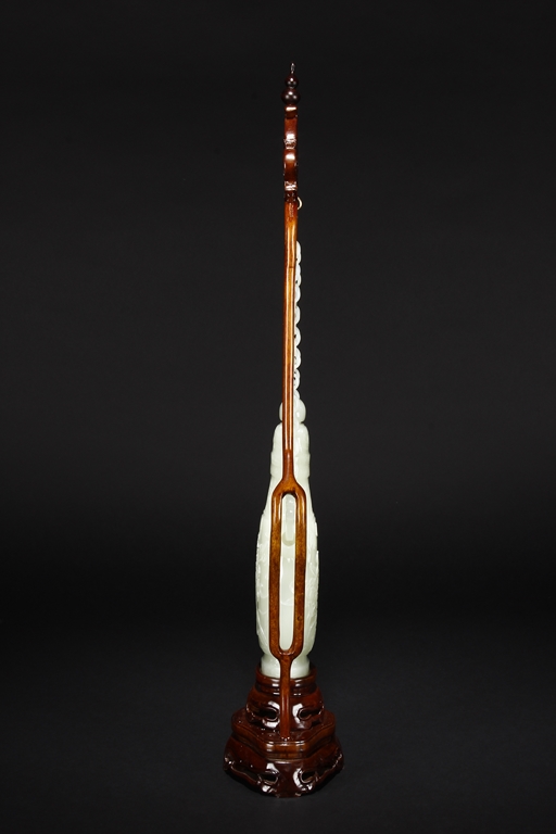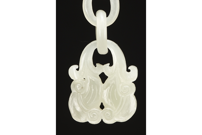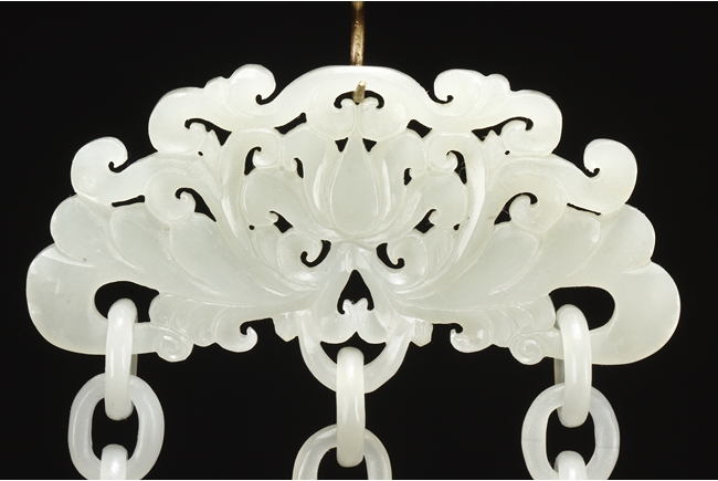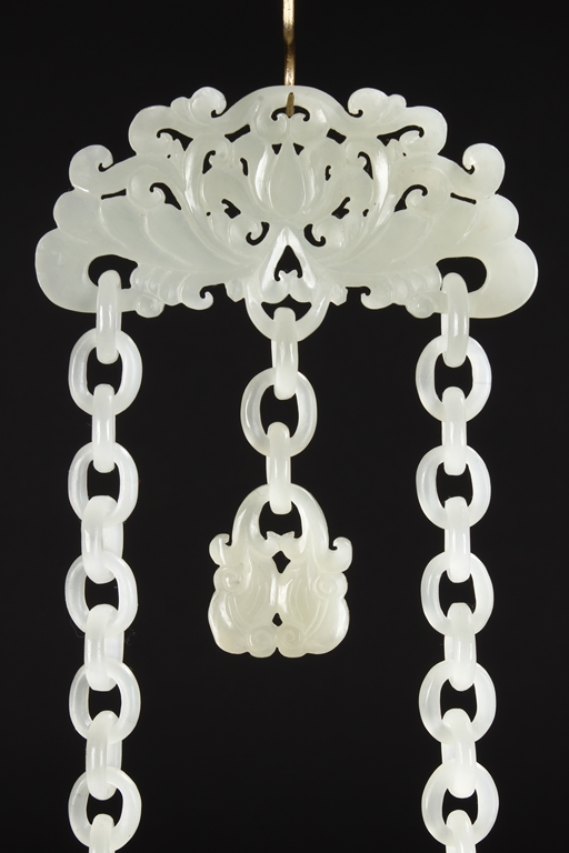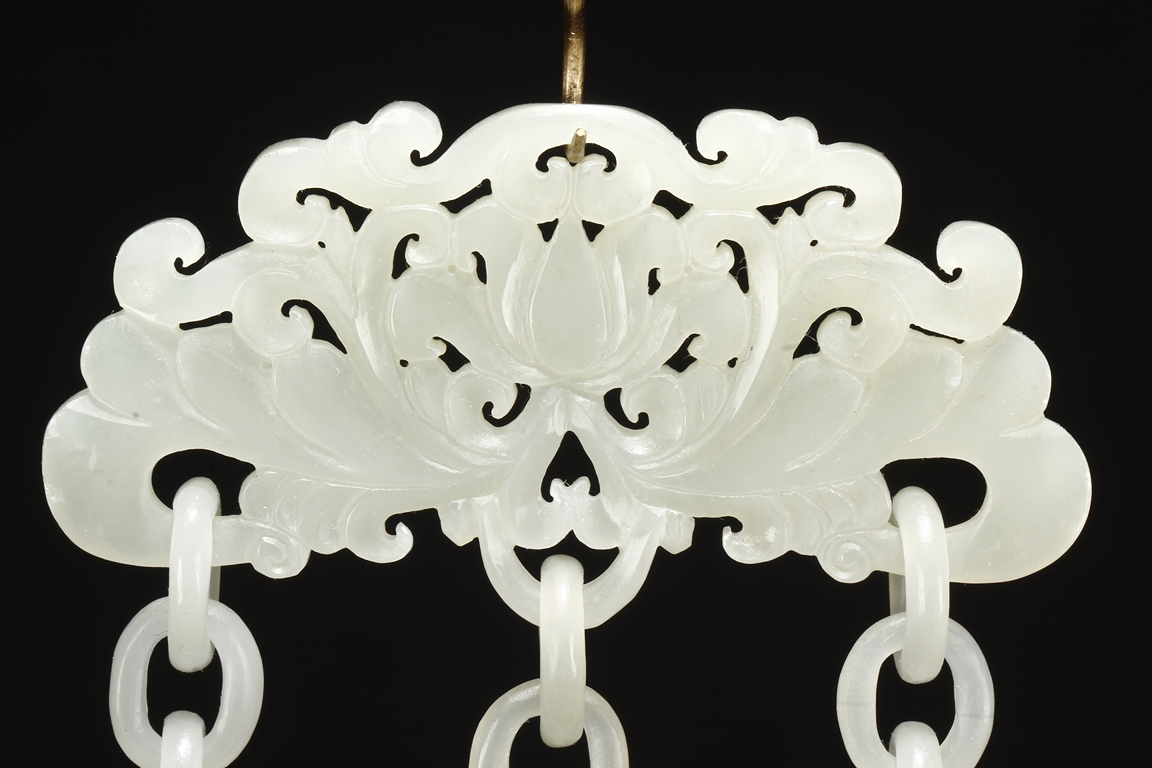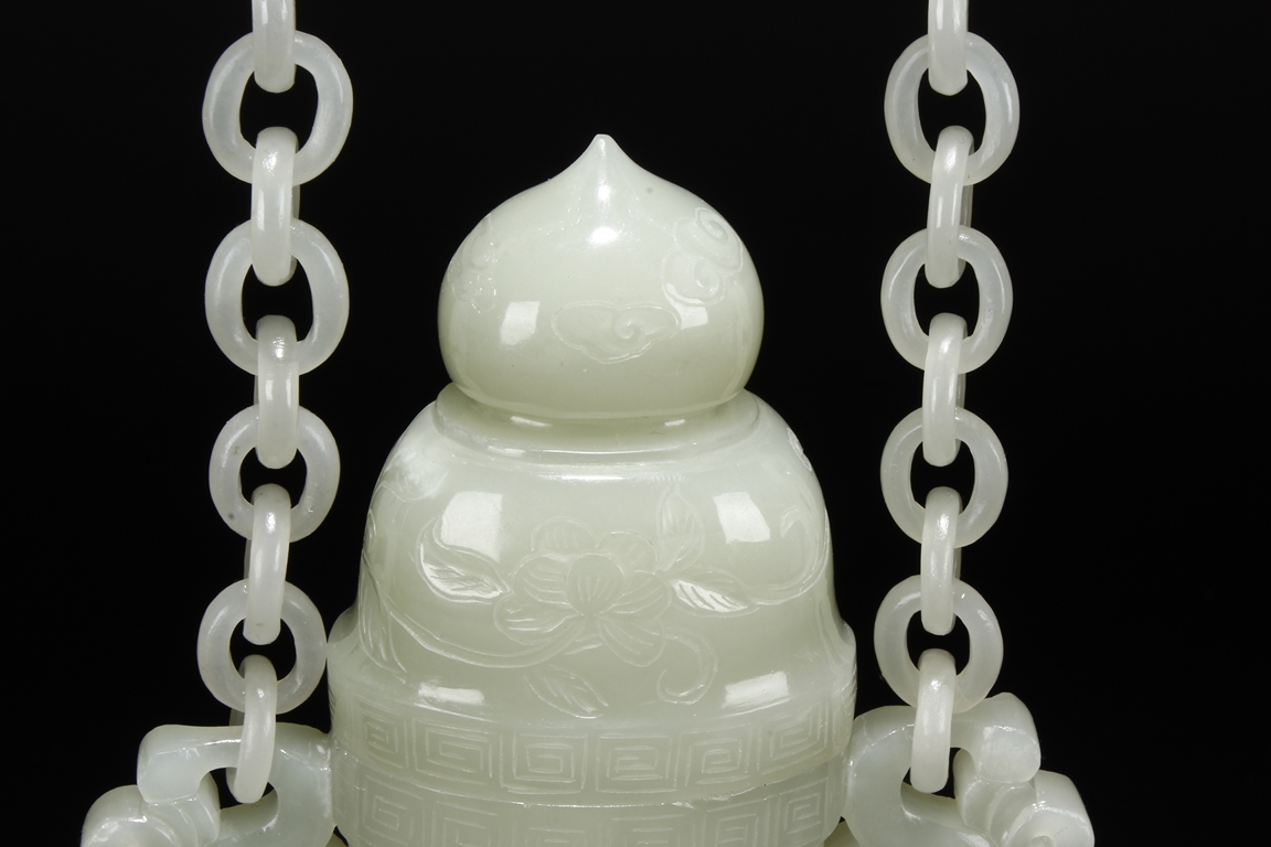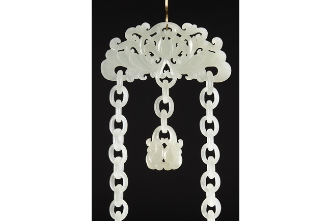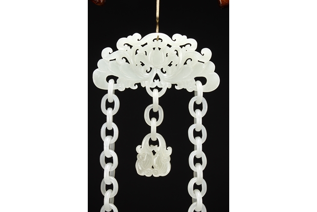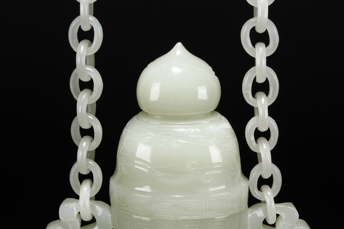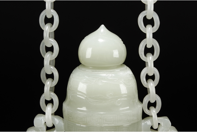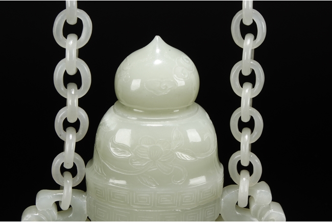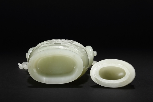 Of flattened hu form, the vase is delicately carved in shallow relief with rose-heads, foliage, bamboo, and magpie in body and neck, along with a band of key-fret pattern above the neck. The neck is flanked by a pair of elaborate openwork ring handles connected with a linked loose chain to a openwork pendant. The vase is surmounted by a domed cover with a bud finial. The stone is of white and pale tone.