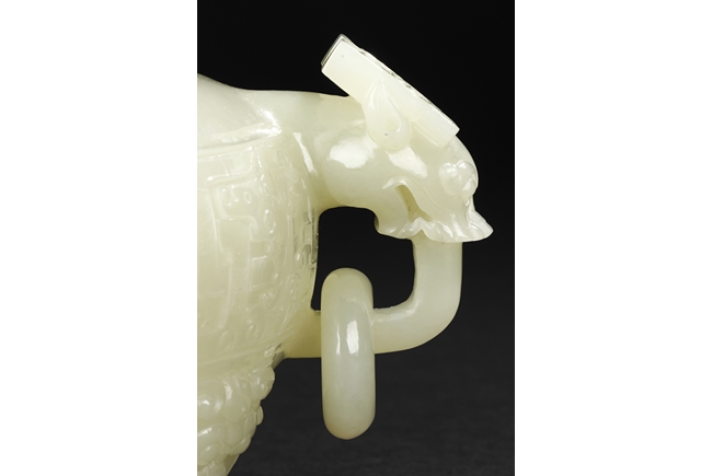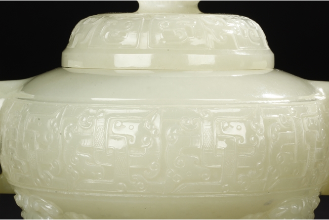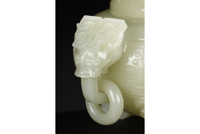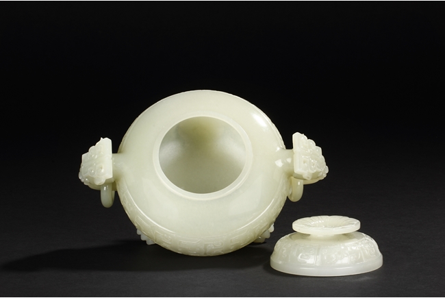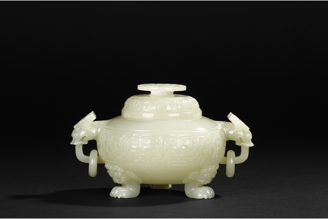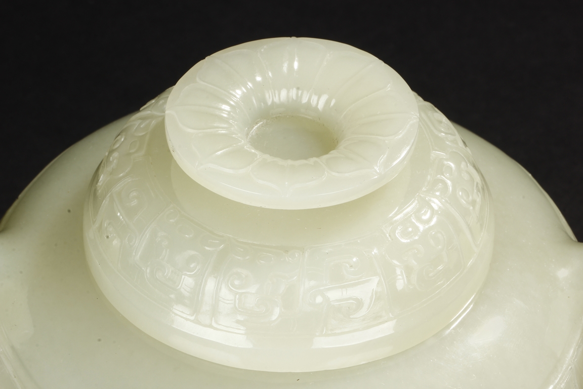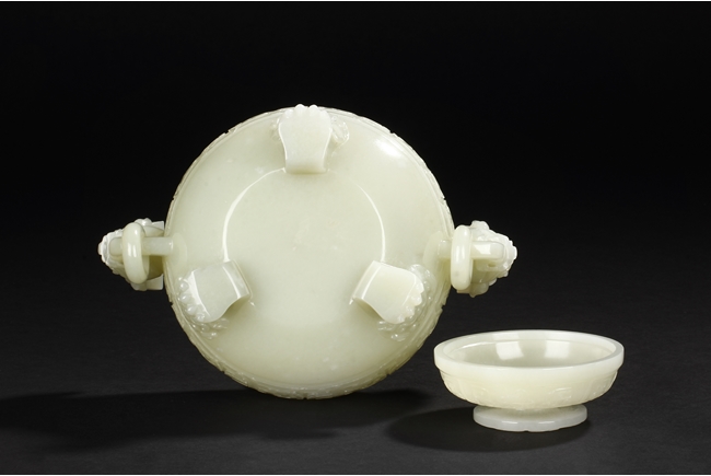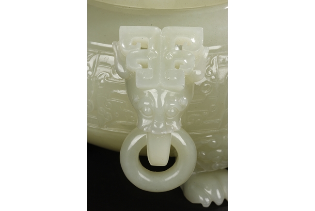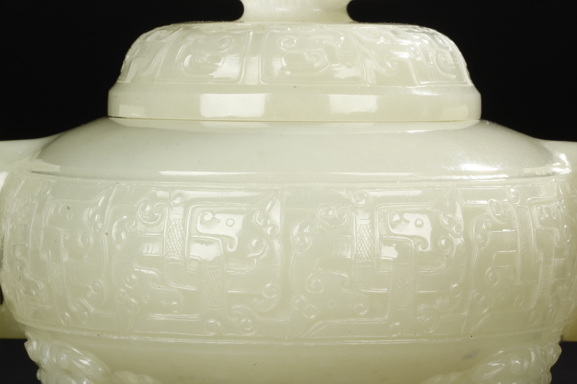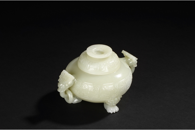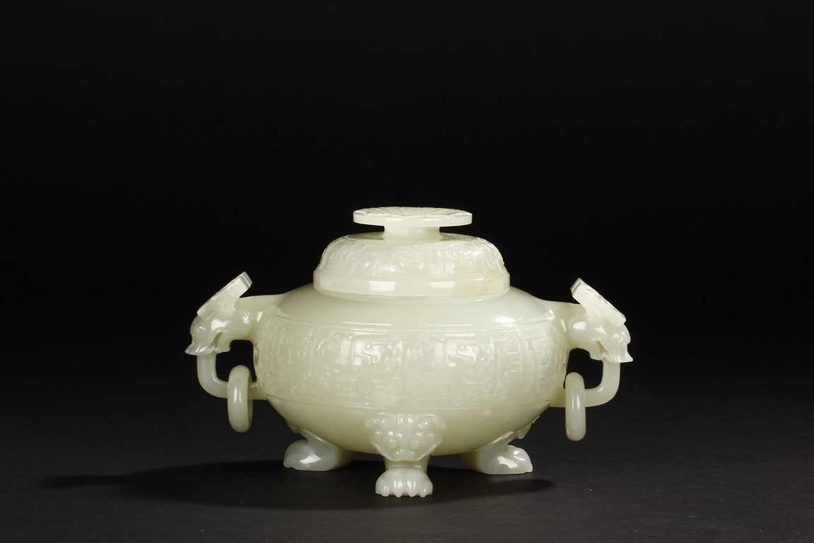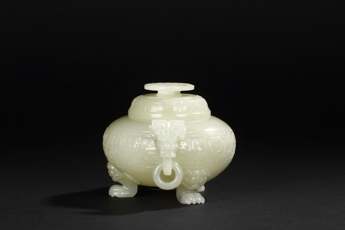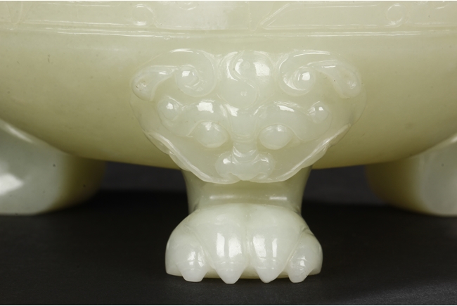 This compressed bulbous censer is supported by three paw-shaped legs emerging from lion heads and flanked by a pair of extending mythical beast ring handles to each side. The body is decorated by a low relief continuous band of mythical beast designs and is repeated on the domed cover. The cover is surmounted by a flaring finial modeled as open-form leaves. The stone is of overall white tone. 19th Century.