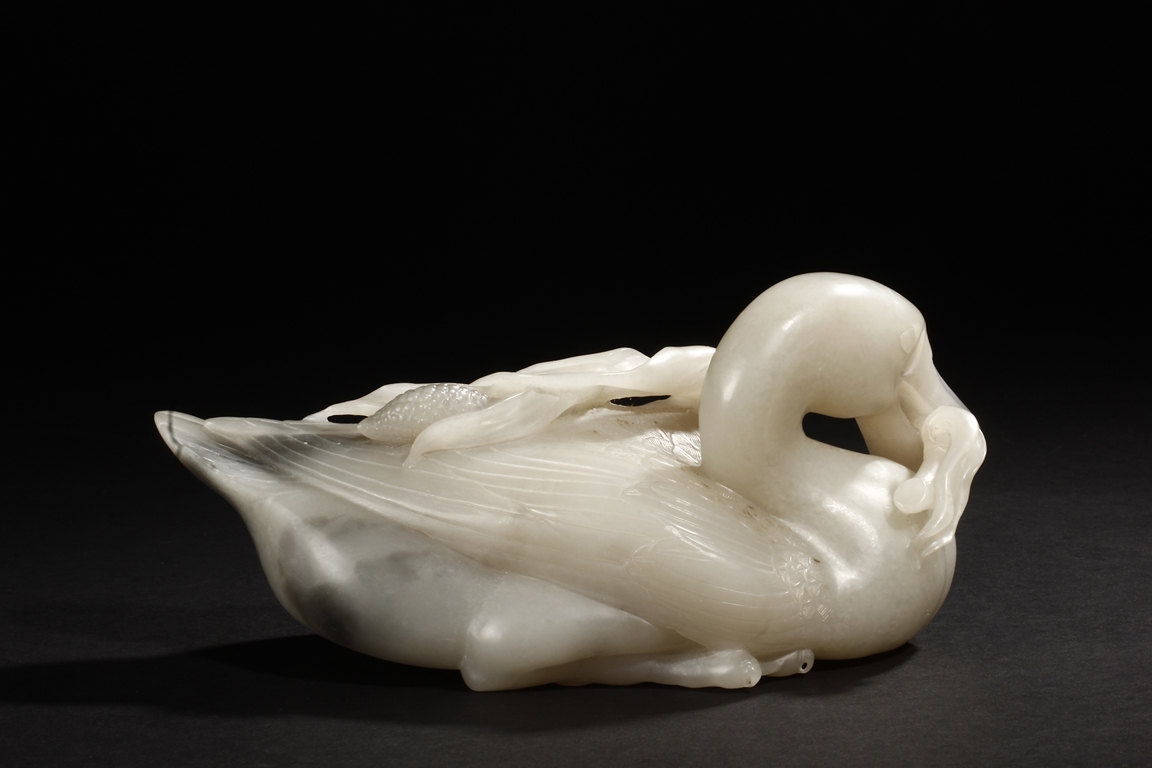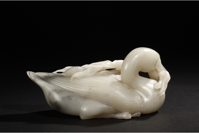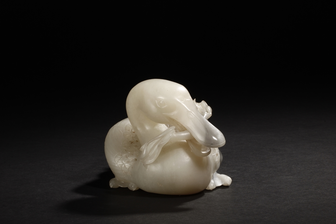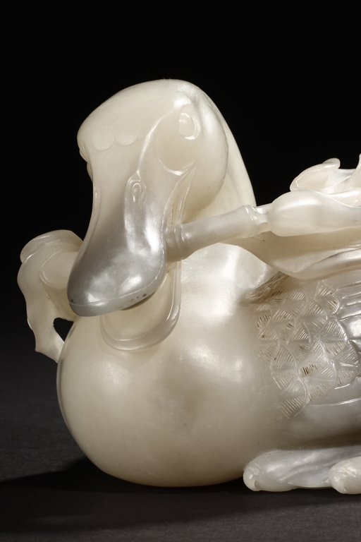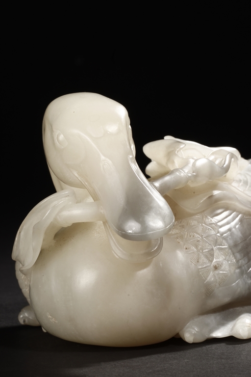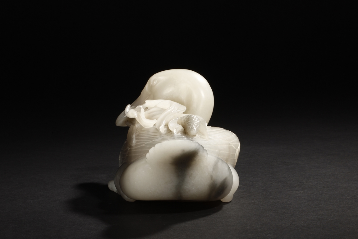 The recumbent duck is finely carved with its mouth grasping a leafy corn branch, its wing and tail feathers are highly detailed with incised lines, the eyes are realistically carved in low relief, its body flanked by two delicately carved webbed feet. The stone is of white and gray tone with black inclusions. Republic period.