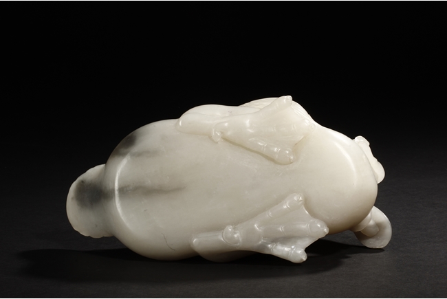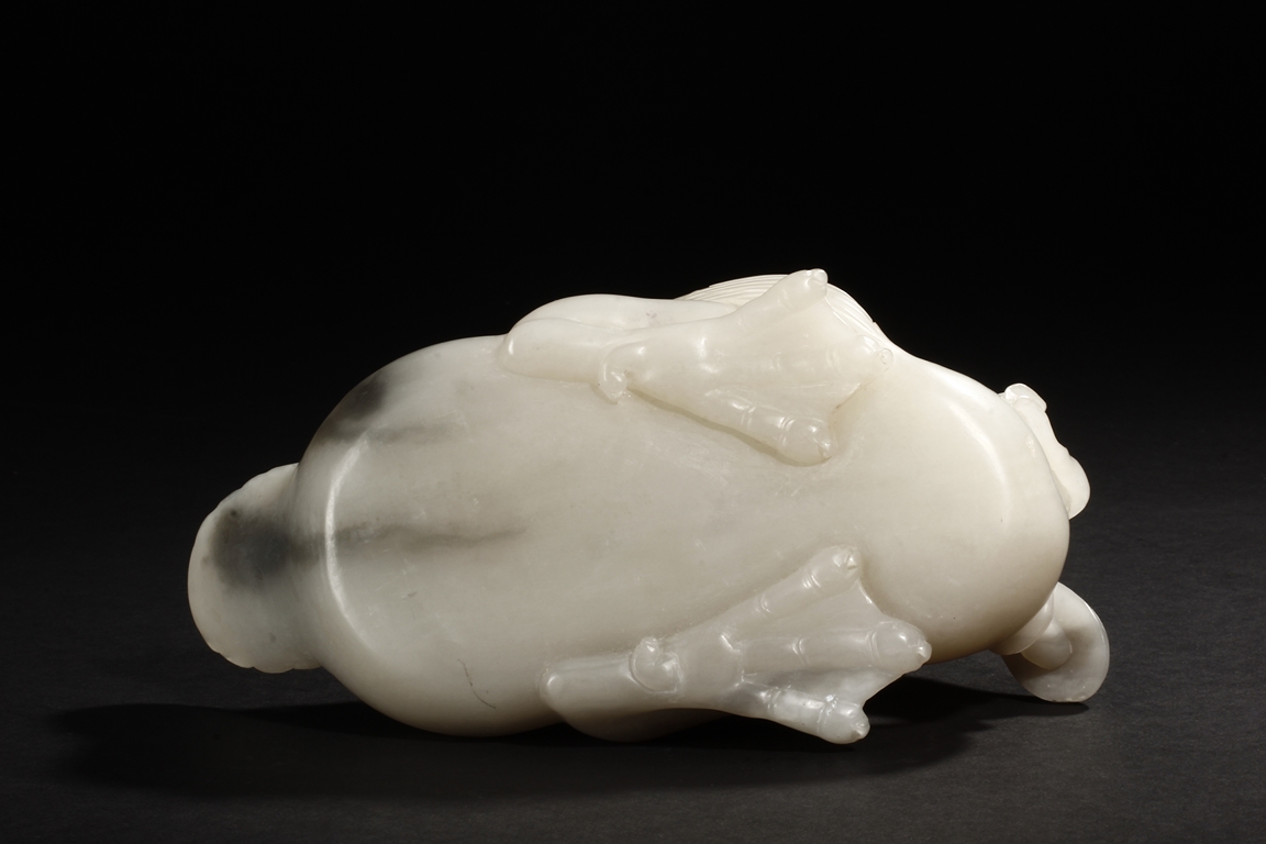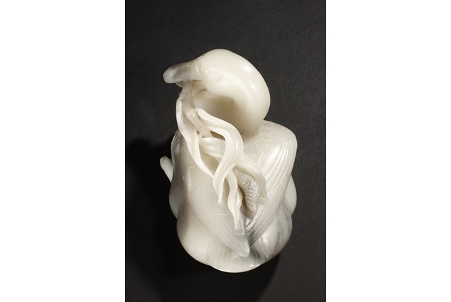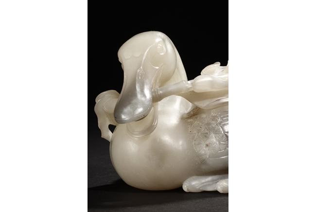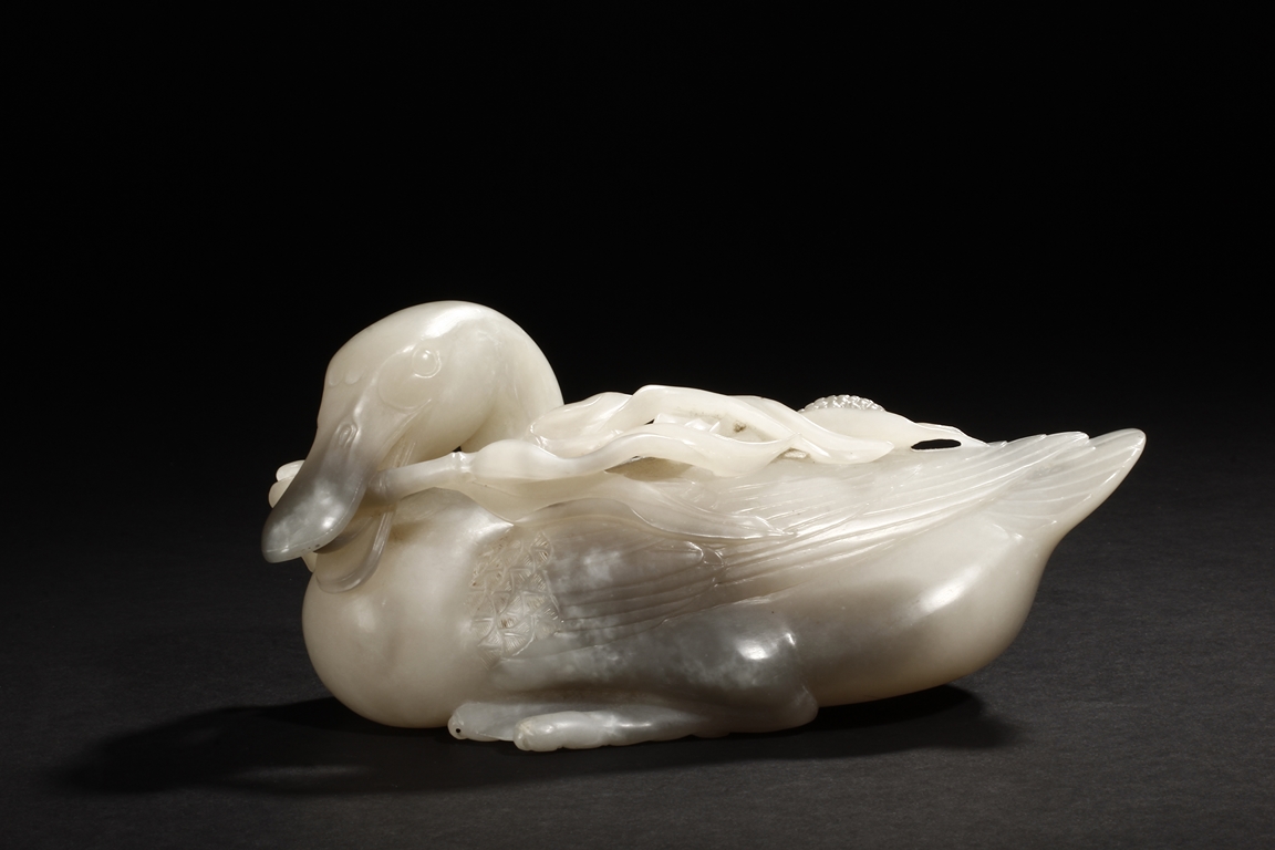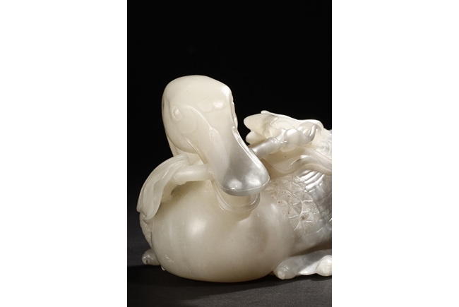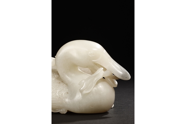The recumbent duck is finely carved with its mouth grasping a leafy corn branch, its wing and tail feathers are highly detailed with incised lines, the eyes are realistically carved in low relief, its body flanked by two delicately carved webbed feet. The stone is of white and gray tone with black inclusions. Republic period.