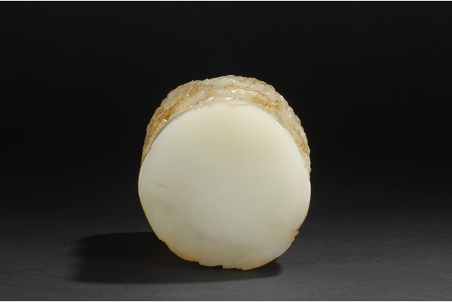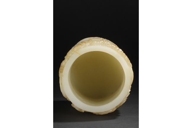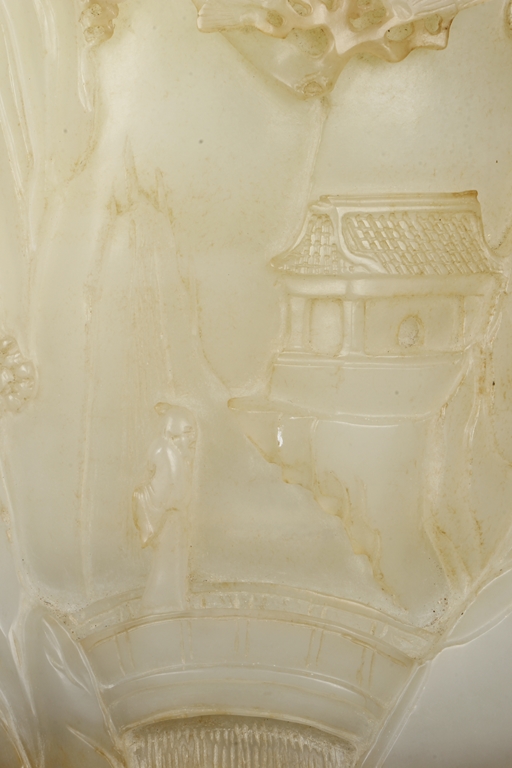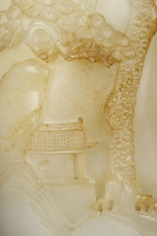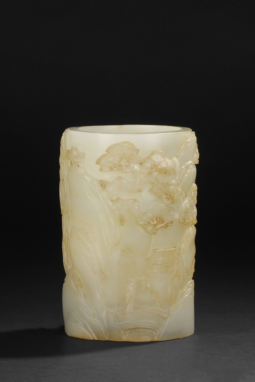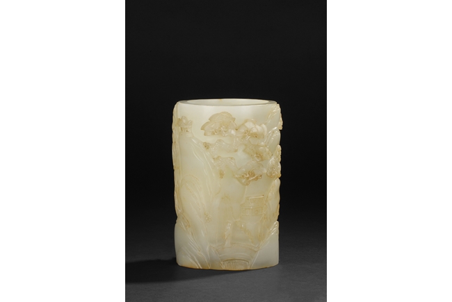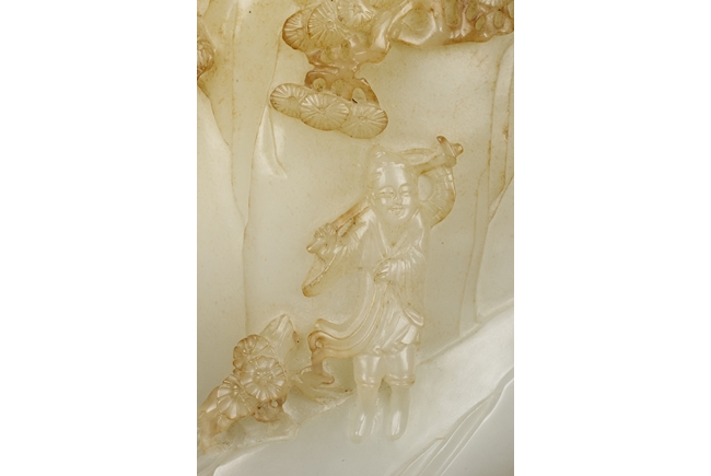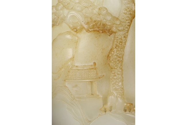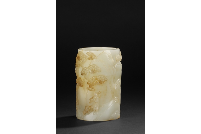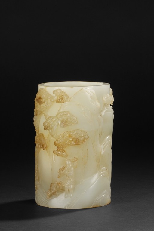 Of cylindrical shape, this brush pot is carved and pierced in medium relief with a mountainous landscape scenes where a scholar wandering upon a bridge amongst the mountains on one side and a hermit holding a hoe next to pine trees and chrysanthemum on the other side. The stone is of overall white tone with russet markings and inclusions.