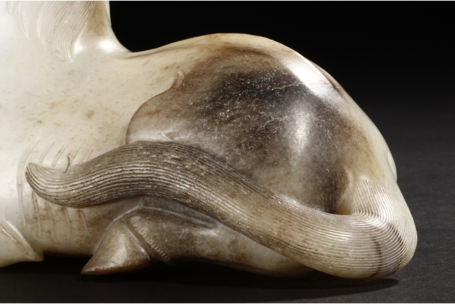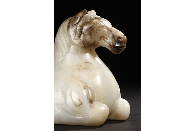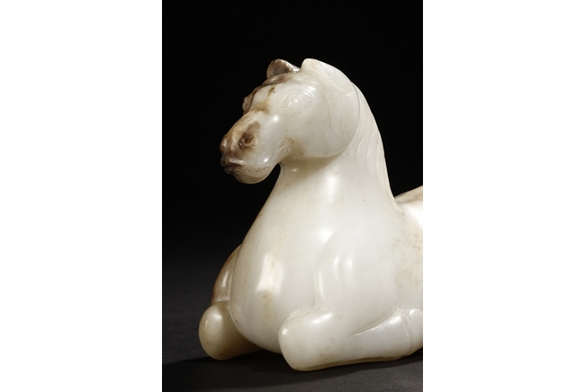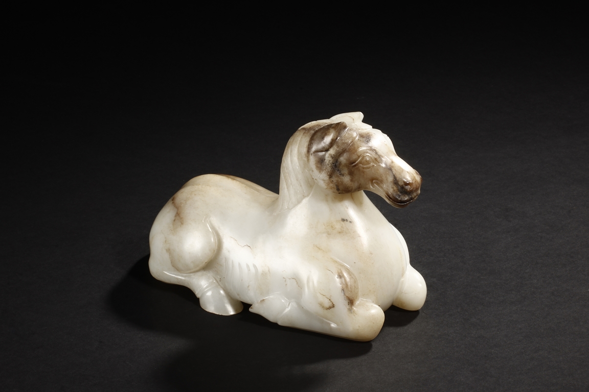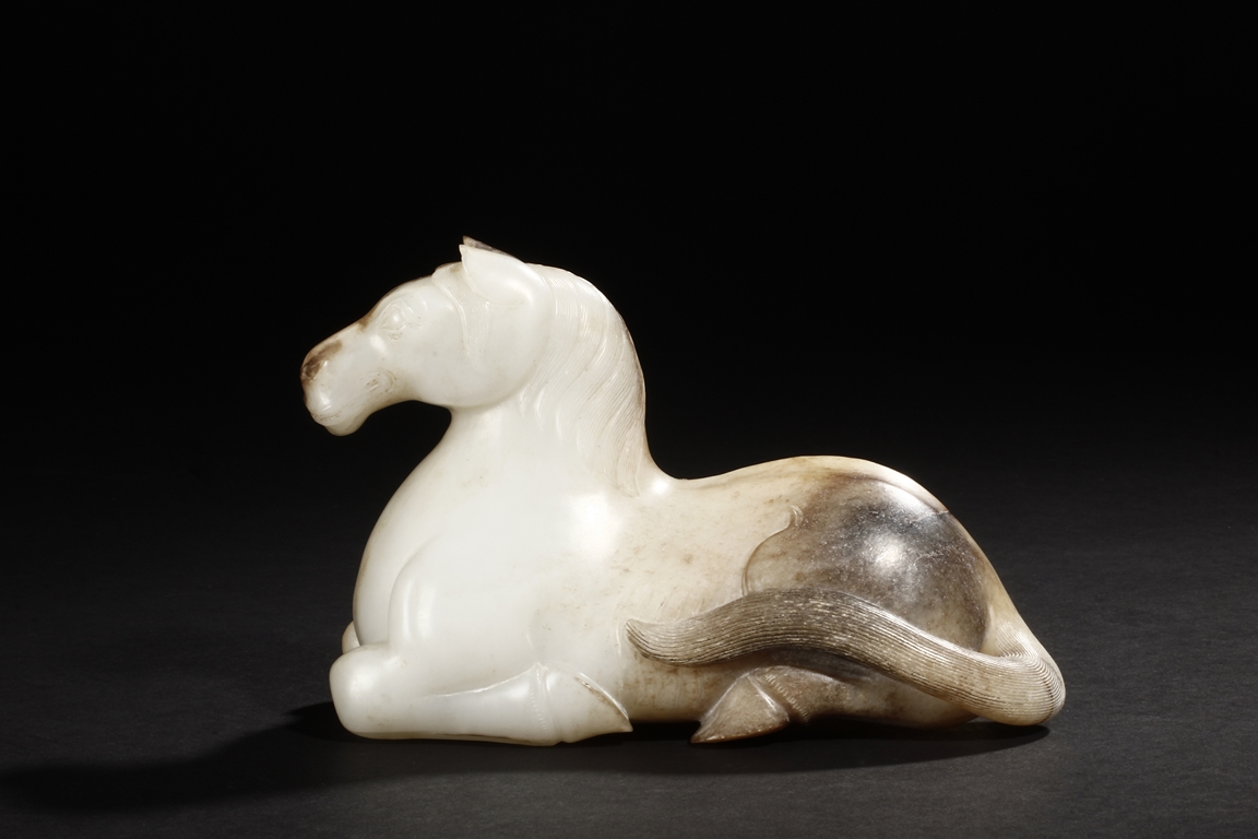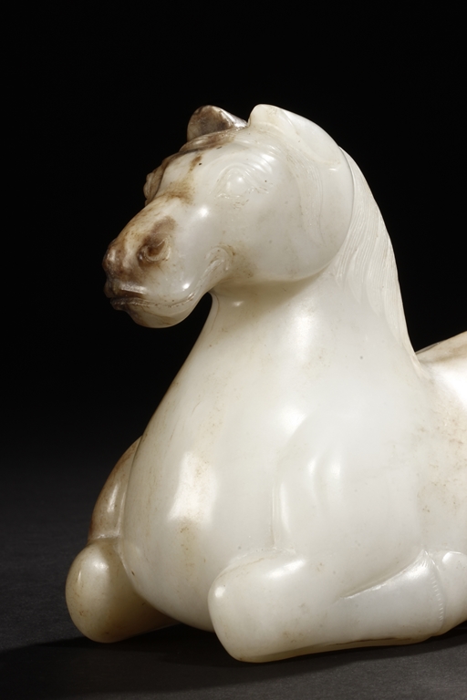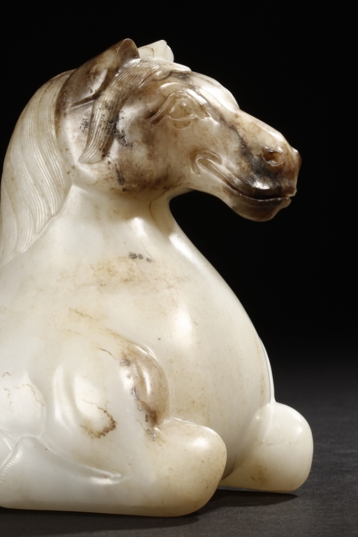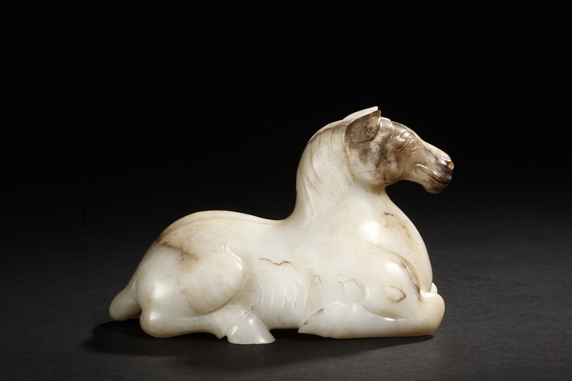 This recumbent horse is finely carved with four legs tucked under its belly, with its head held forward, the eyes are delicately highlighted in low relief and manes are highly detailed with incised lines. The stone is of white tone, with mottled russet veins and inclusions.