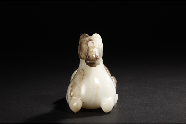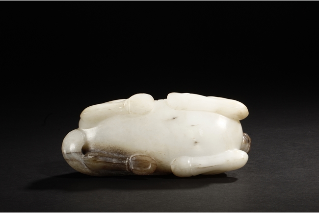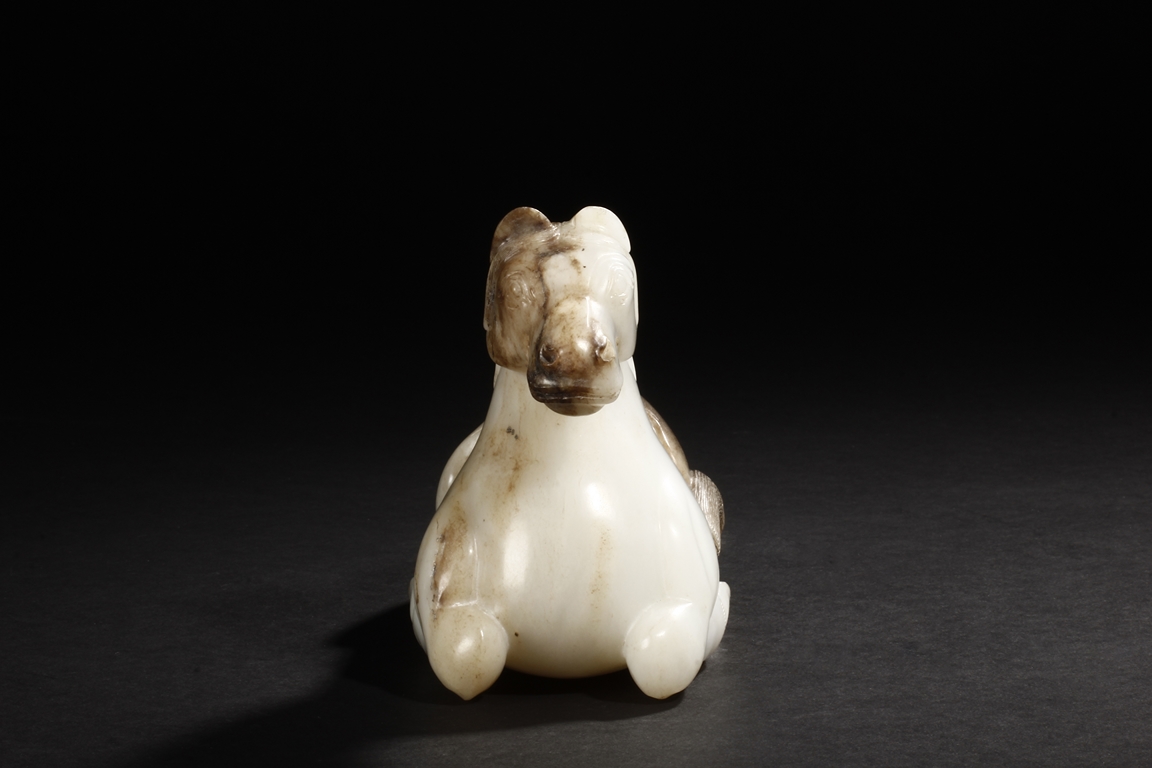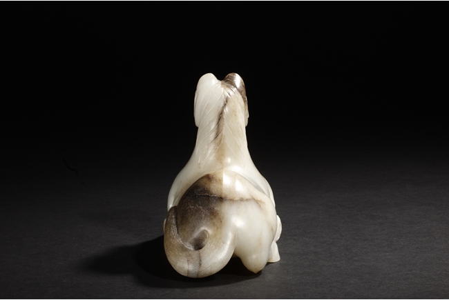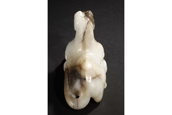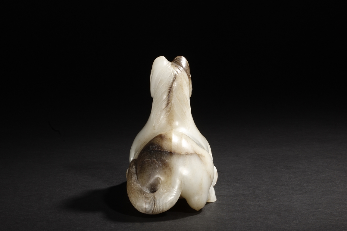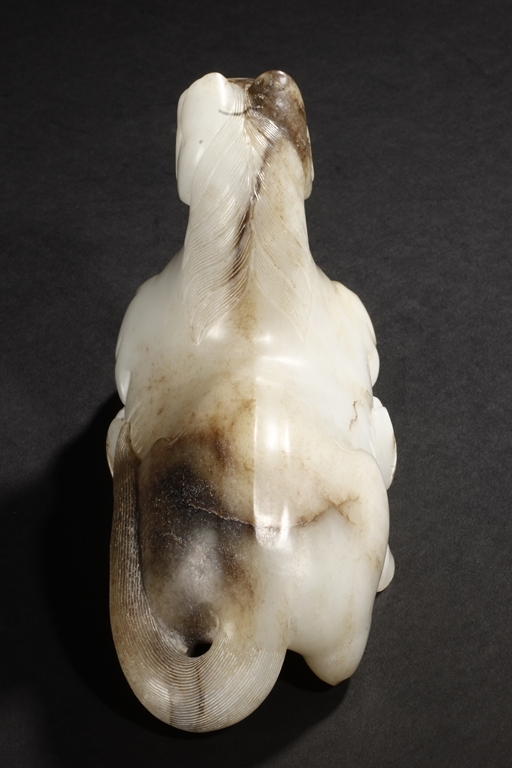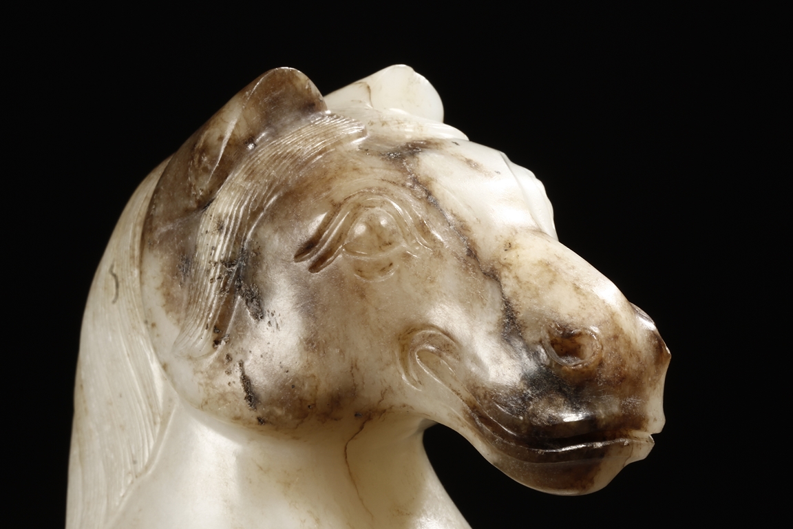 This recumbent horse is finely carved with four legs tucked under its belly, with its head held forward, the eyes are delicately highlighted in low relief and manes are highly detailed with incised lines. The stone is of white tone, with mottled russet veins and inclusions.