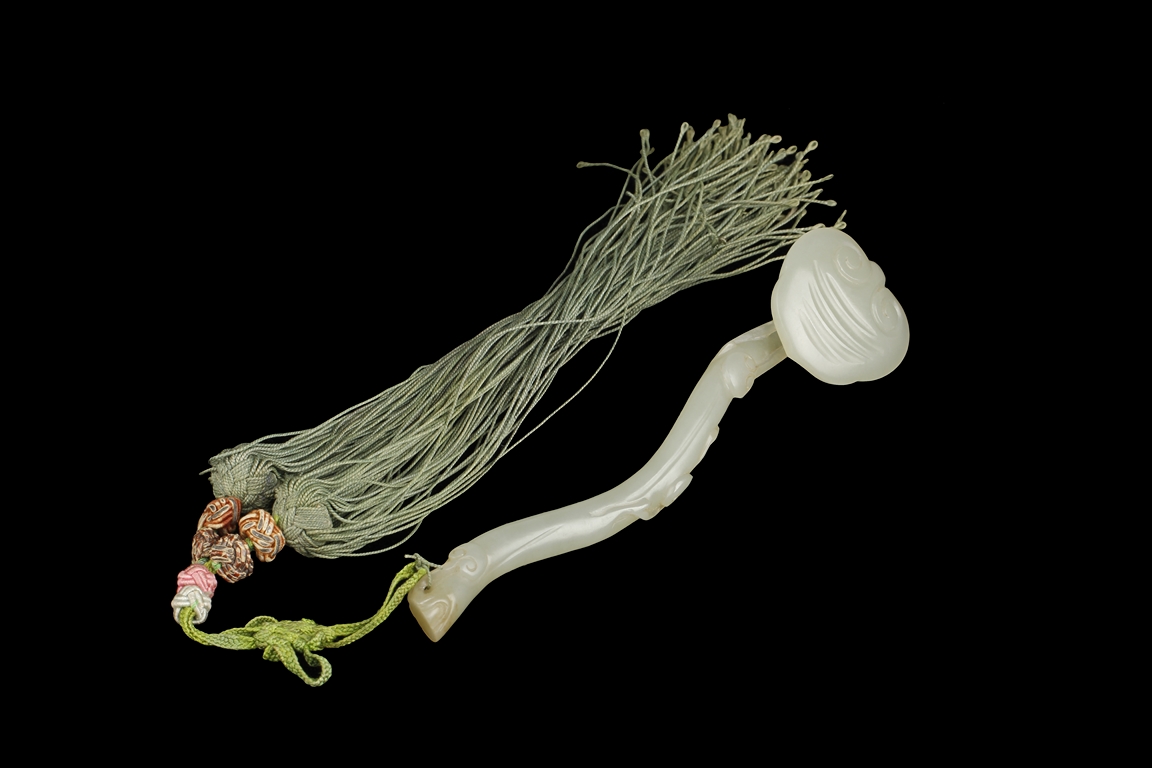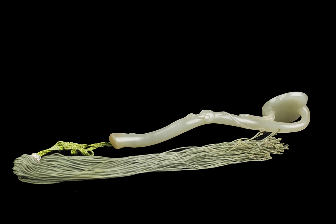 The jade Ruyi scepter is carved as a stem of lingzhi fungus. The branch of smaller lingzhi acts as shaft and terminates in the larger lingzhi-formed ruyi head; stone is of smooth white color, with slight russet inclusions. Includes tassel. Qing Dynasty period.
