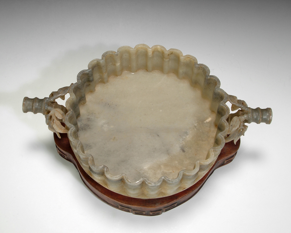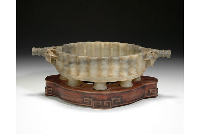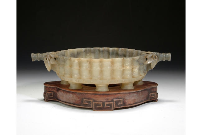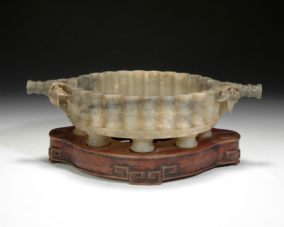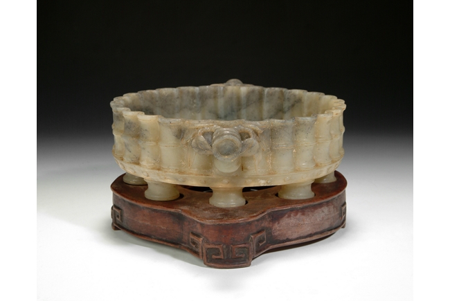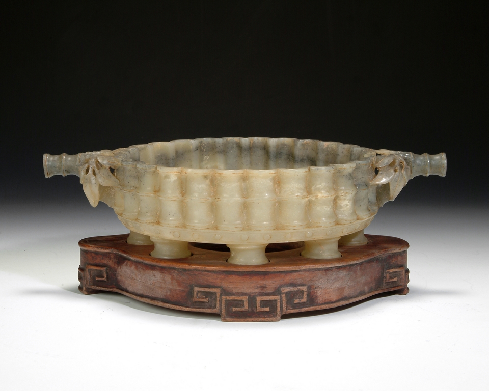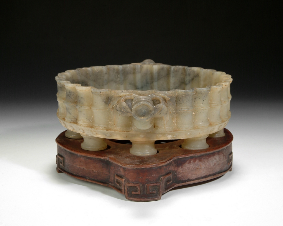 Of circular sectioned, this carved jade brush washer is impressively carved in the form of bundled bamboo stalks. The body is flanked by two leafy bamboo-shaped handles and raised from eight circular bamboo trunk feet. The feet and body are bordered by a circular band of nipple motif. The piece is supported by a huanghuali stand with stylized cloud motif from republic period. Ming Dynasty period.