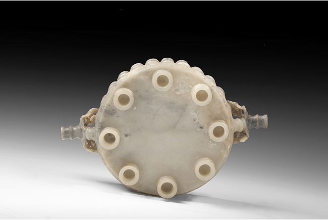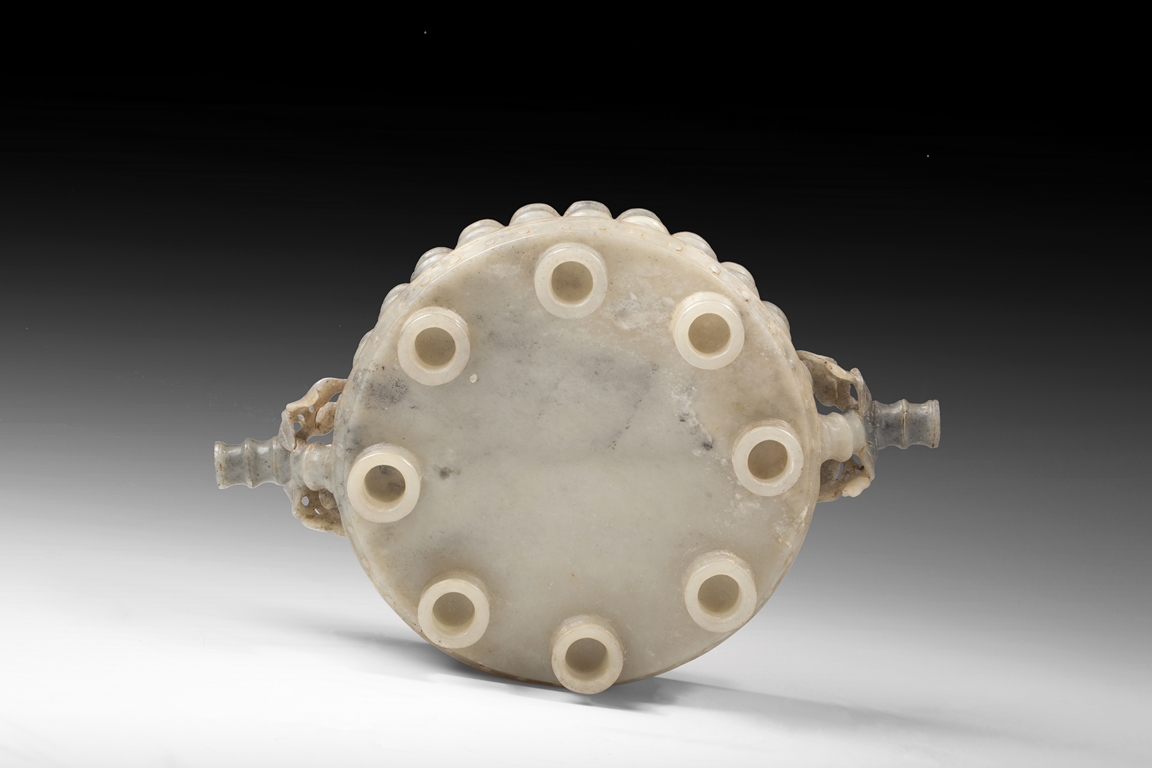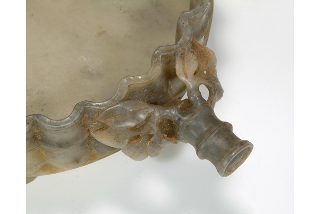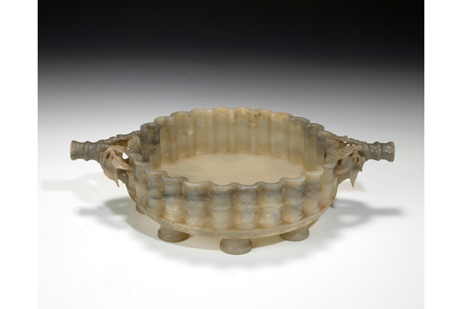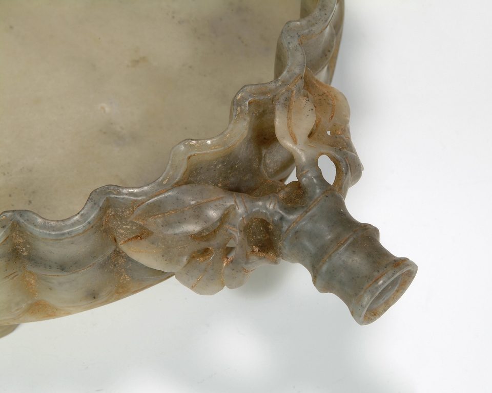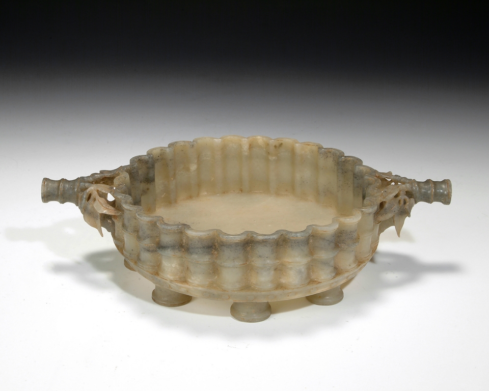 Of circular sectioned, this carved jade brush washer is impressively carved in the form of bundled bamboo stalks. The body is flanked by two leafy bamboo-shaped handles and raised from eight circular bamboo trunk feet. The feet and body are bordered by a circular band of nipple motif. The piece is supported by a huanghuali stand with stylized cloud motif from republic period. Ming Dynasty period.