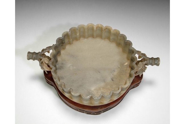 此玉雕水洗 做工精緻,用料大方,構思獨特,風格古樸,時代感強,歷屆拍賣會上十分少見,值得收藏。底座為黃花梨,民國早期後配。