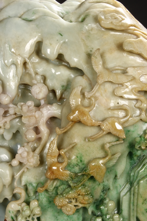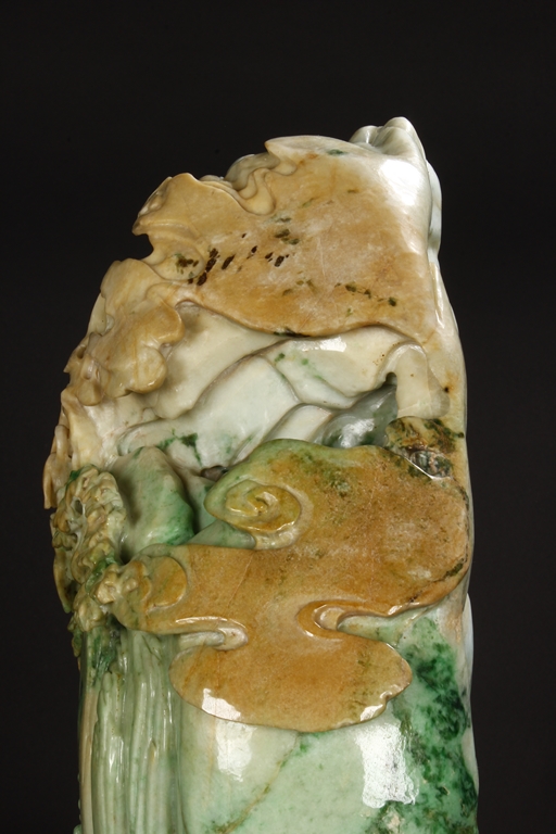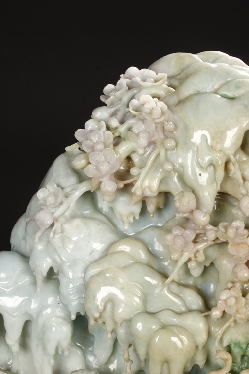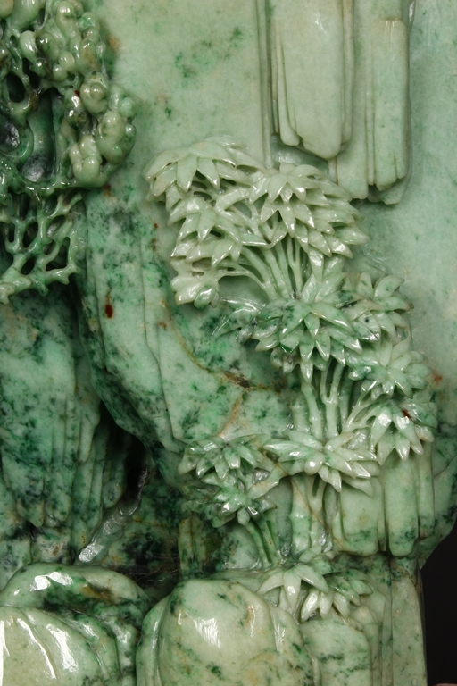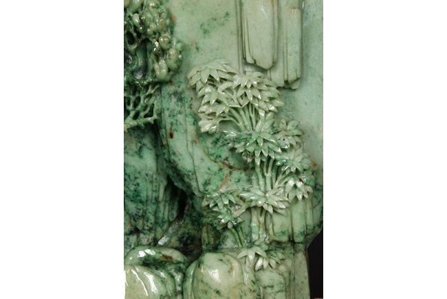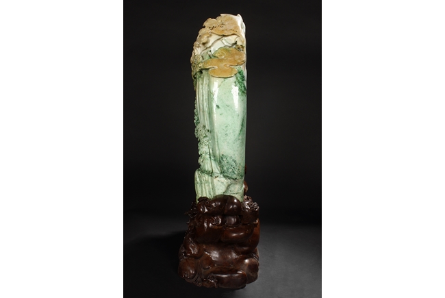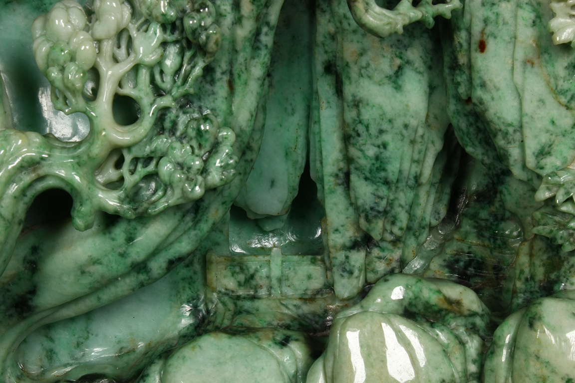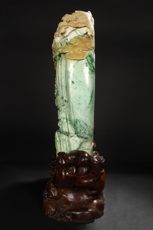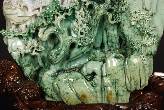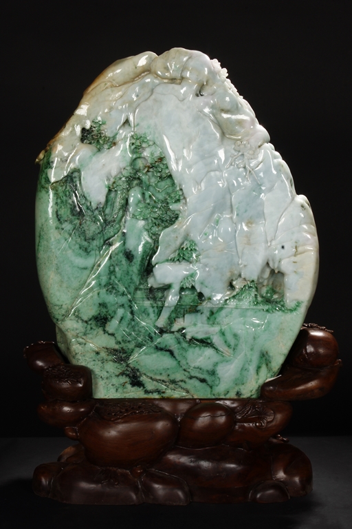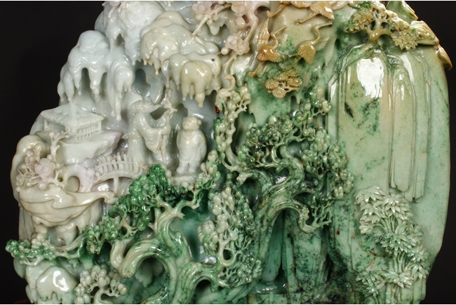 此翡翠玉雕山子,器型巨大,天然,厚重,四面滿雕工,用料考究,佈局結構合理,雕工細緻,所雕人物,山水,樹木,小橋,樓閣等,均體現了雕刻家的精湛技藝及對美好生活的展望。此翡翠玉雕山子曾經與1978年在哈佛大學博物館展出。由聖地亞哥張先生夫婦提供。