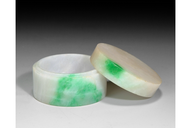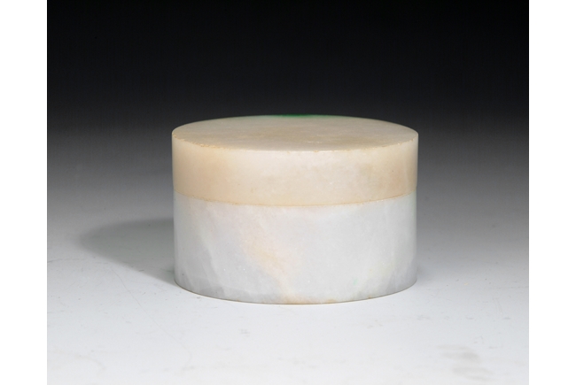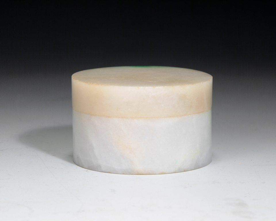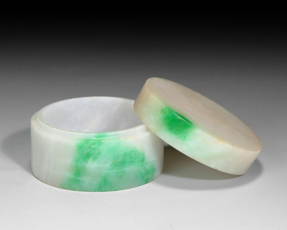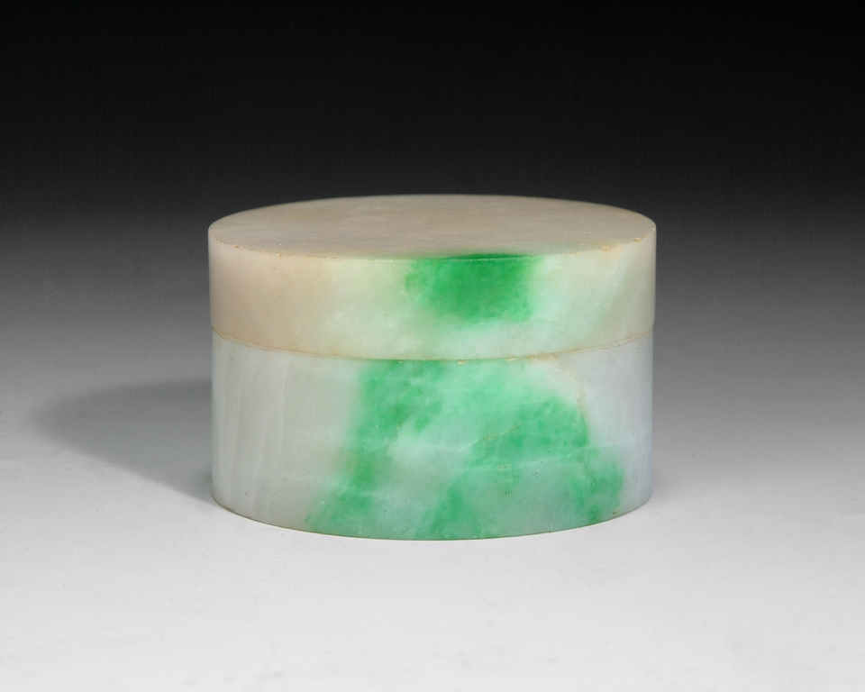 Of circular section, this cover box is finely carved out of a solid jadeite stone. The stone is translucent with patches of bright apple green color. Qing Dynasty period.