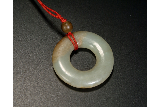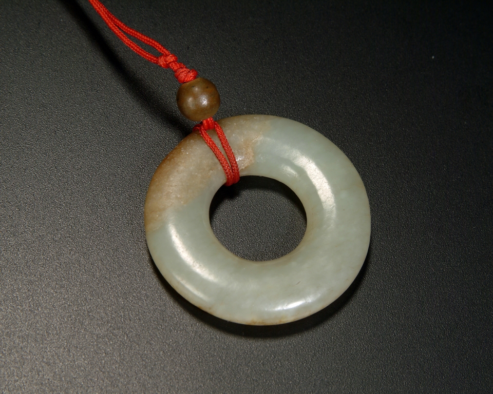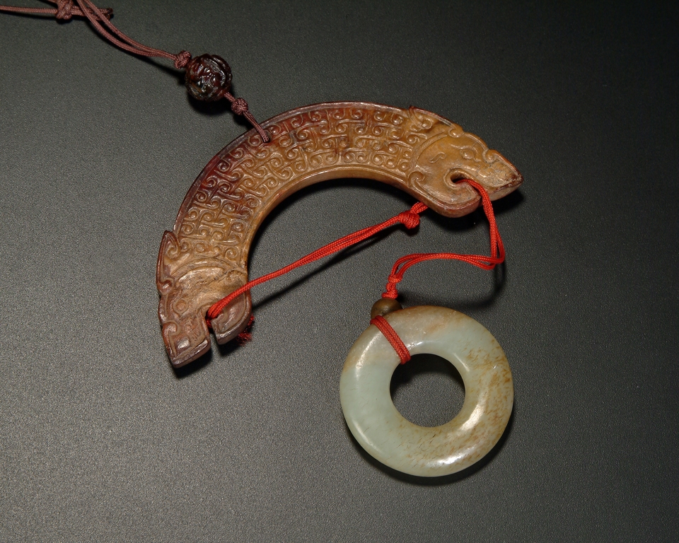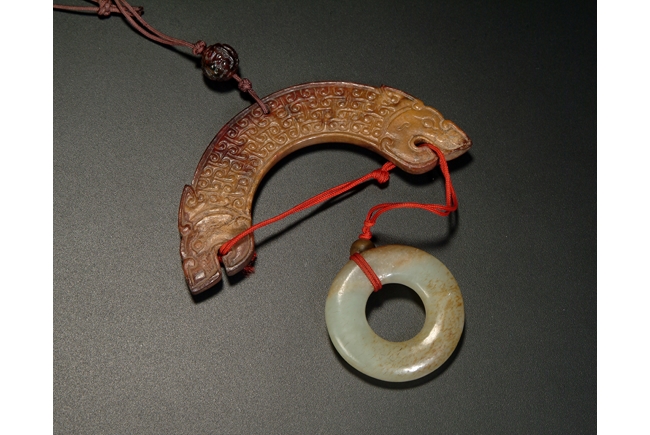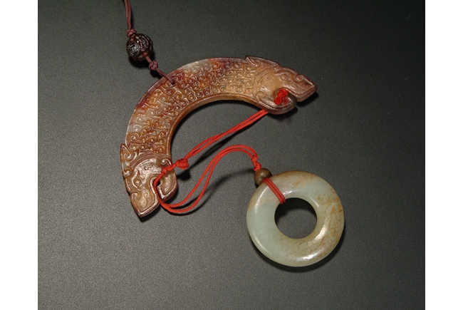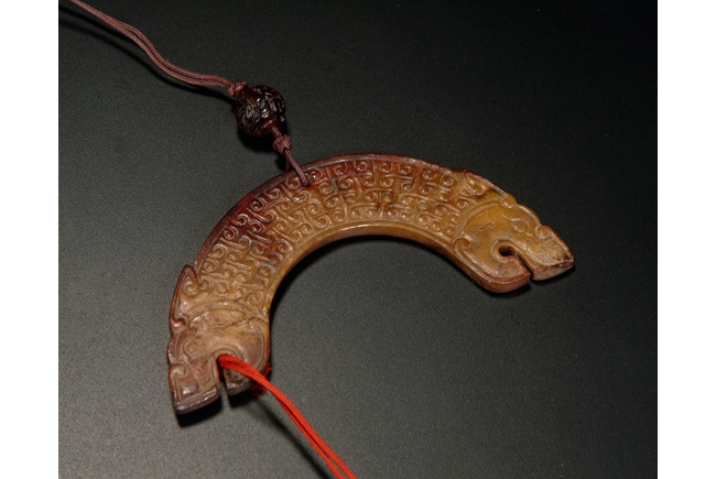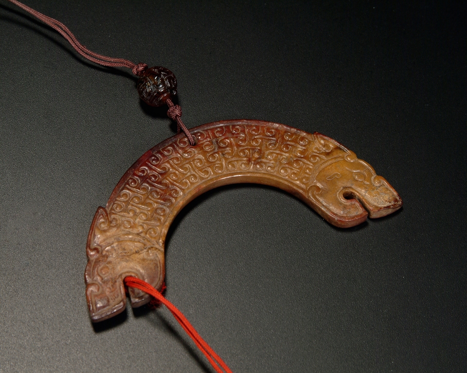 This carved archaic jade Huang is in the shape of a twined dragon, and the body is decorated in low relief with cloud scroll patterns.
