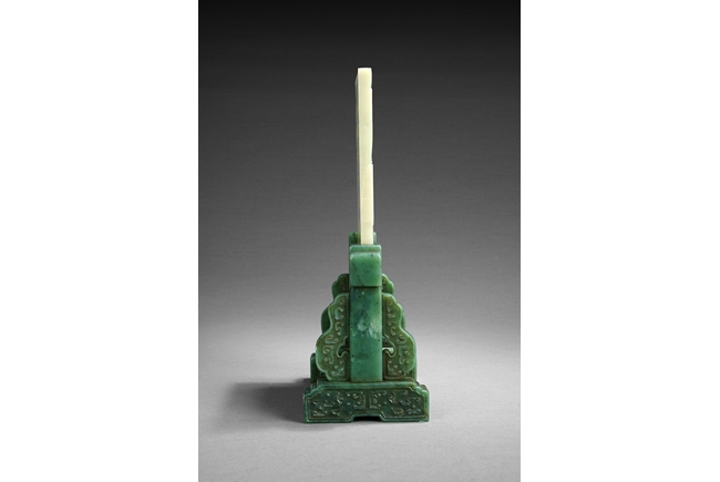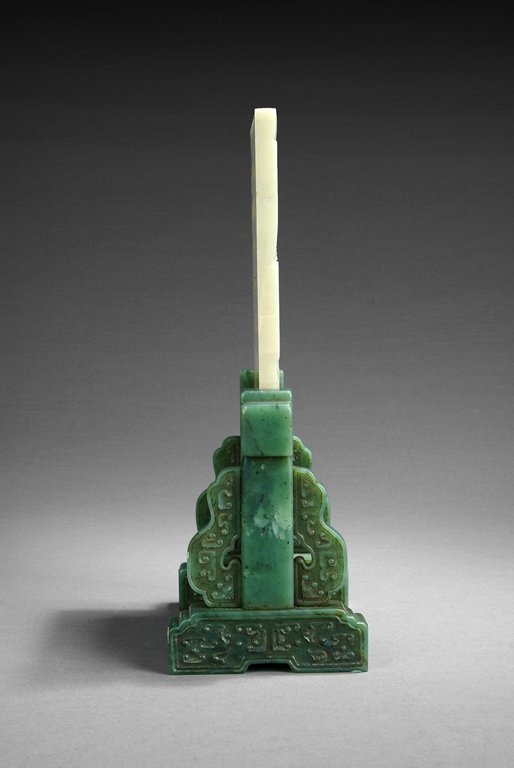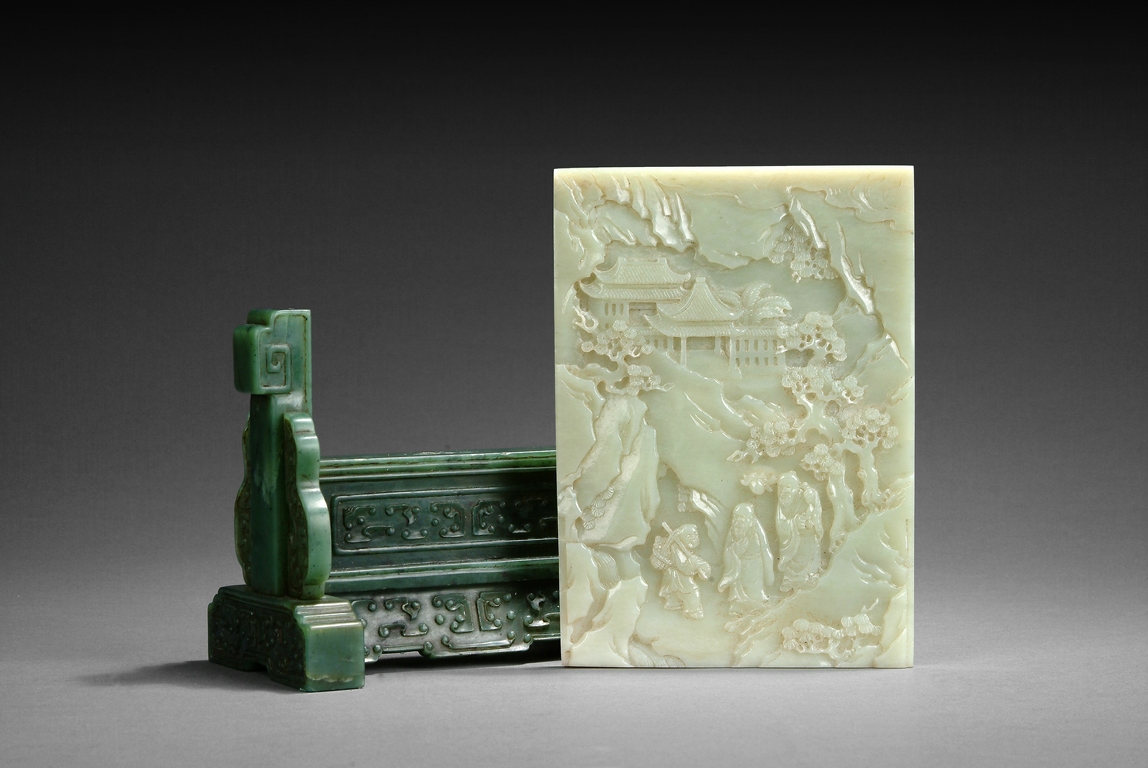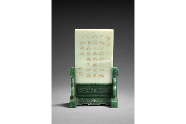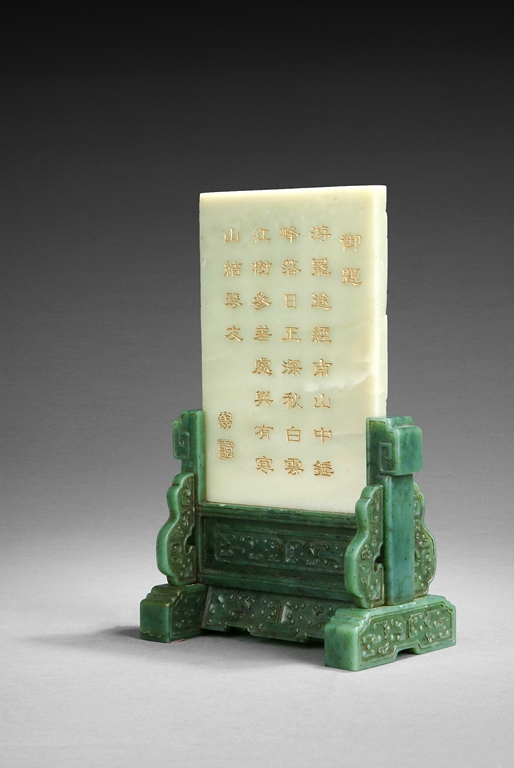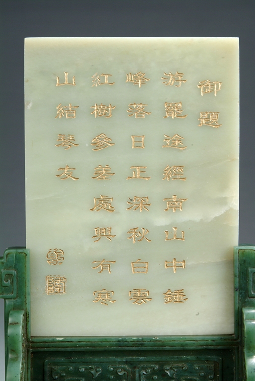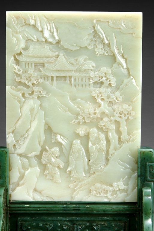 Carved to one side in relief depicting a mountain scene, showing mountains, village, trees, and two elders with a child, the other side with a Chinese poem calligraphy writing, all fitted on a dark green-spinach stand, intricately carved with dotted patterns. Qing Dynasty period. A similar jade table screen with larger dimensions (Height 34.7cm, width 23.5 cm) is illustrated in “Jade: Ch’ing Dynasty Treasures from the National Museum of History, Taiwan”, Taiwan, 1997, pp. 82, no. 26. "