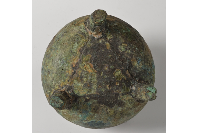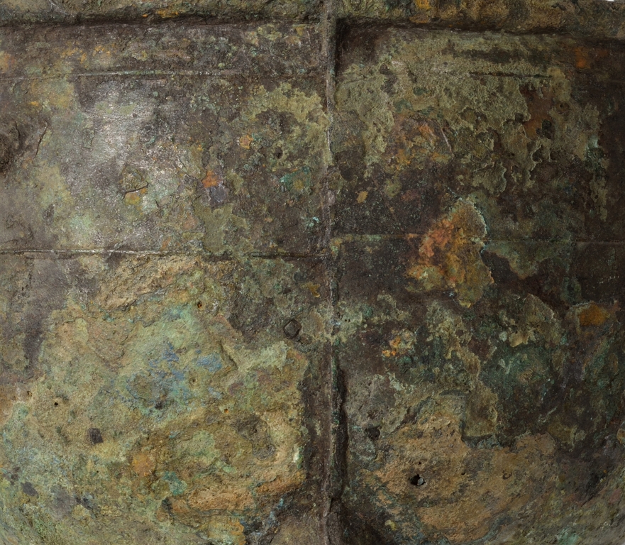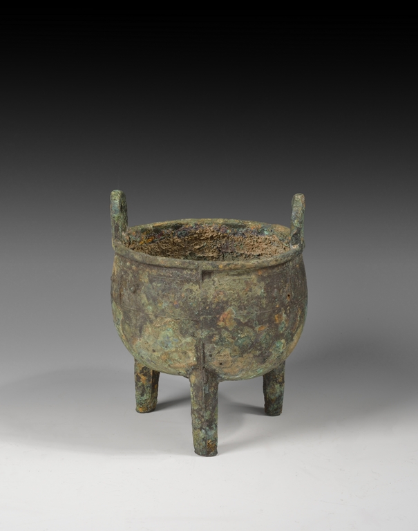 The vessel is of rounded form with very slight S-form profile.It has a swollen lower section and a pair of upright U-form handles to each side of the everted rim, all supported on three tall columnar legs. Extensive age-related encrustation is included. Western Zhou Dynasty period.
