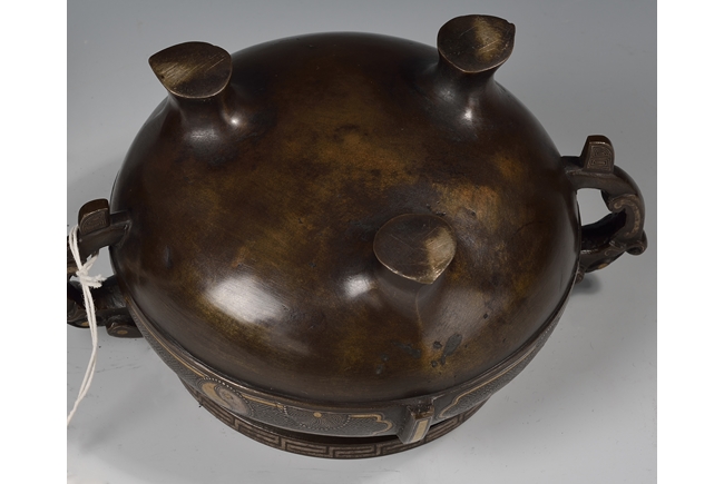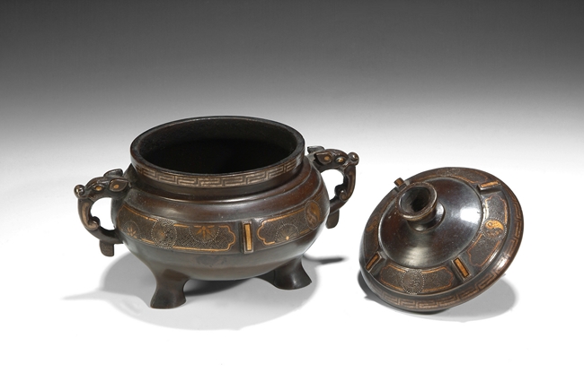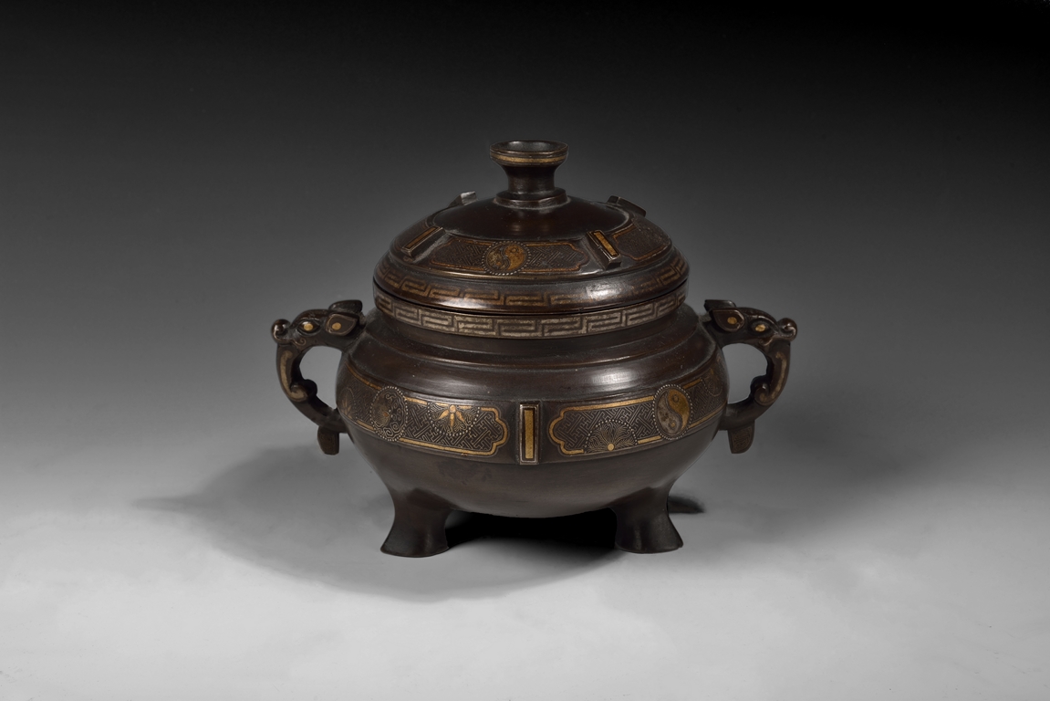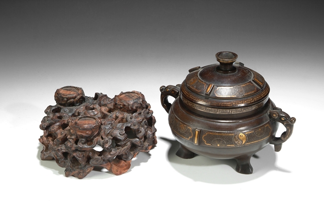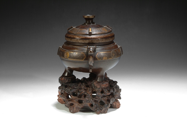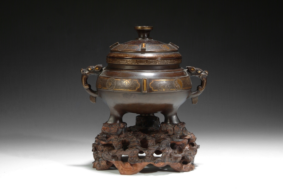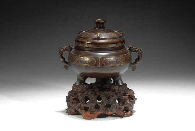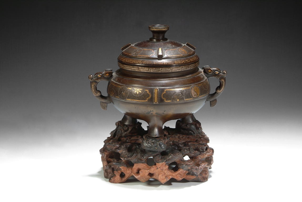 A bronze cast tripod censer with two animal head handles and finely inlaid with silver and gold, with the designs of Taichi and feather patterns. The piece is completed with a Zitan stand from republic period. Qing Dynasty period.