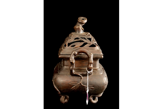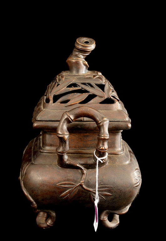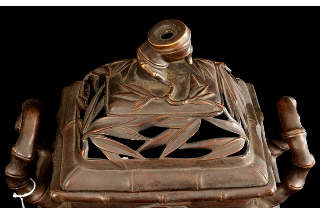 A cast bronze censer with the theme of bamboo branches. The base bears a four character "XUANDE" mark.