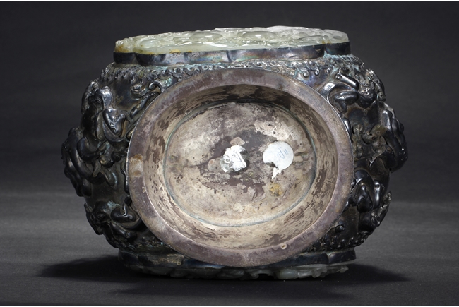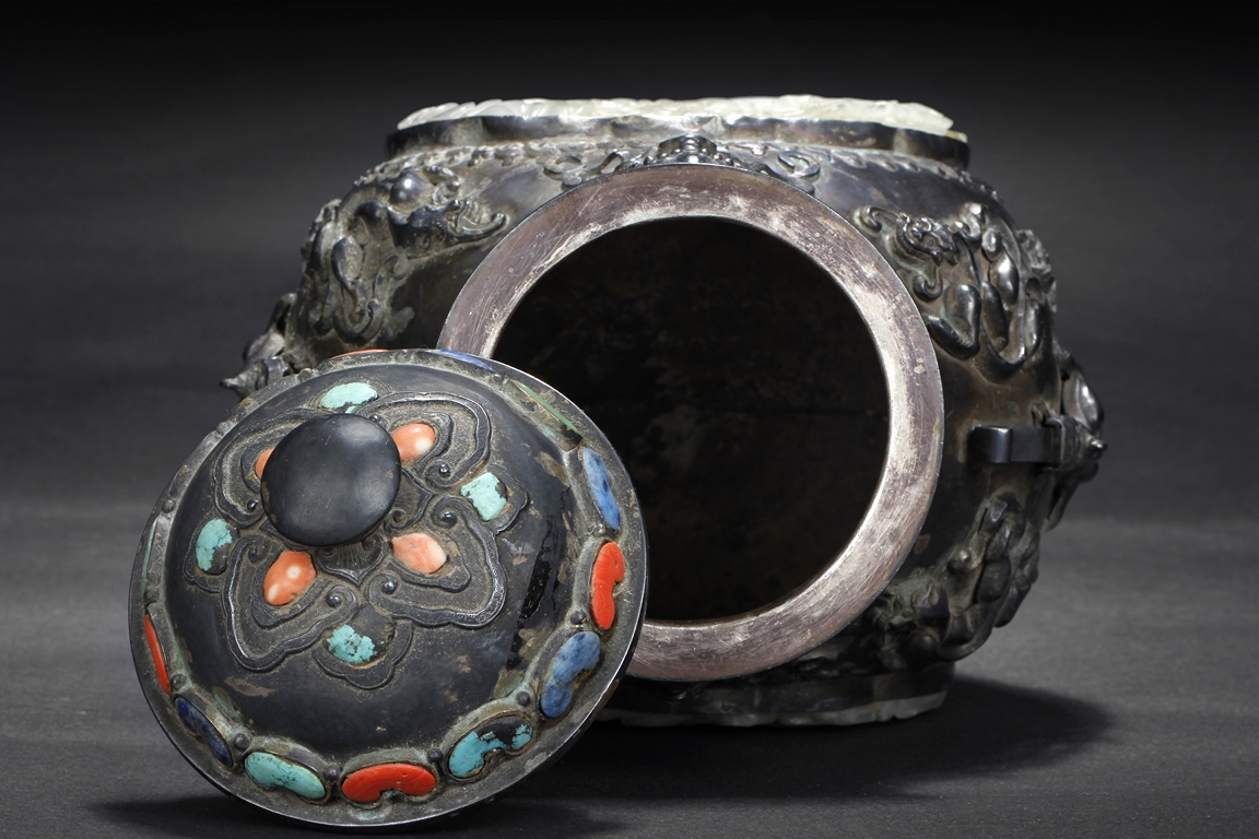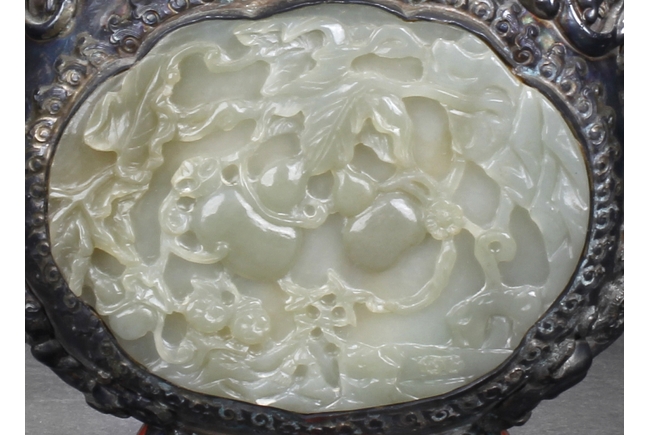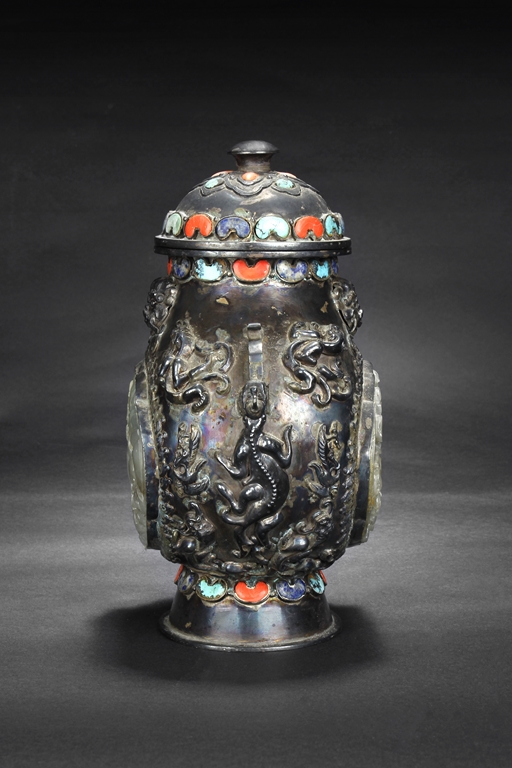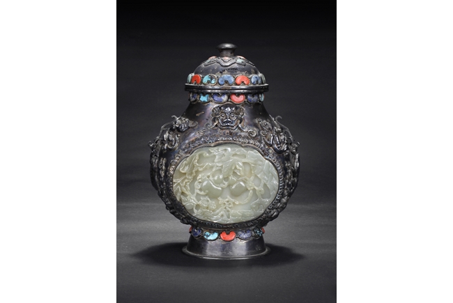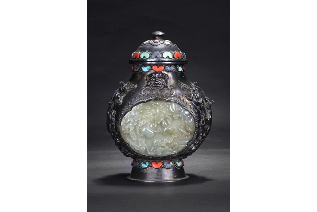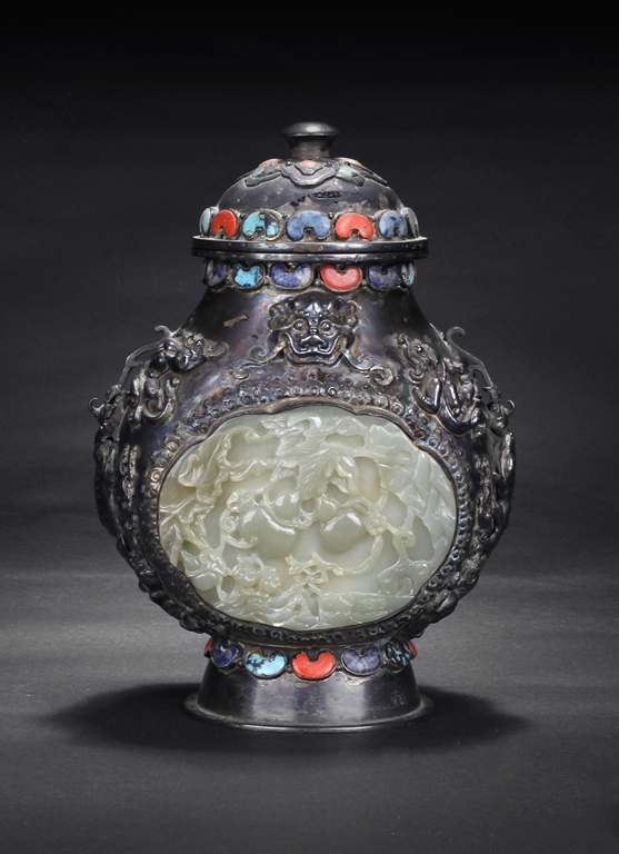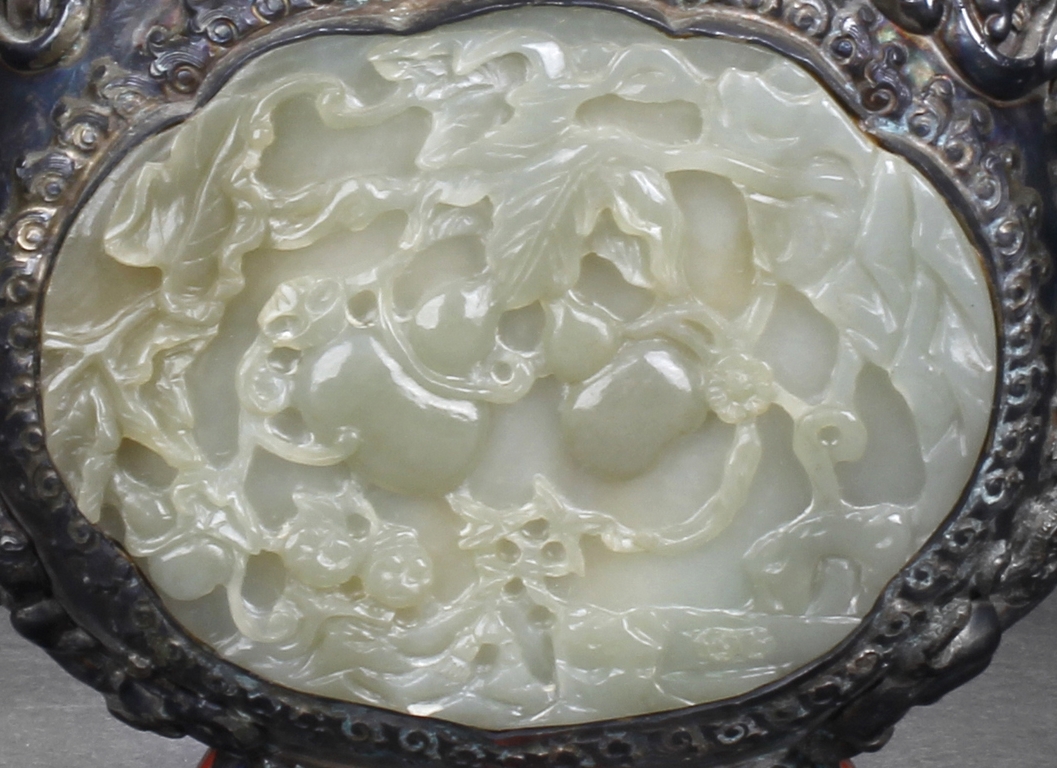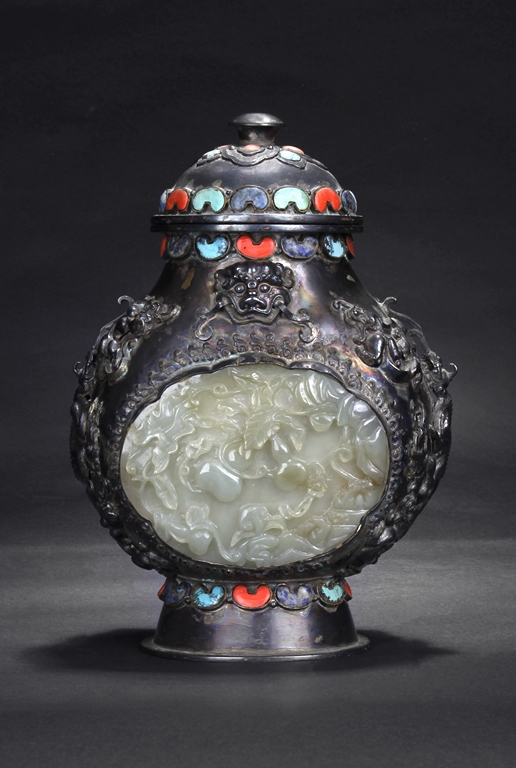 Of flattened ovoid form, well carved on the silver body with lion masks and Chilong, the middle oval shaped white jade plaque depicts gourd growing on branches with dense foliage, the bottom ring foot and top lid all decorated with lapis lazuli, turquoise, and coral. 18th century.
