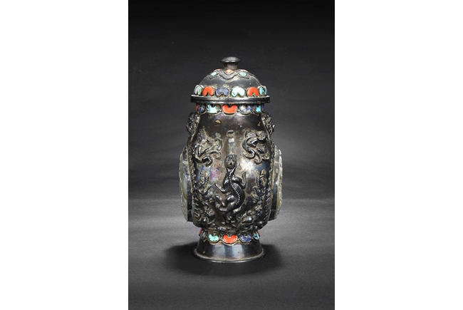 此銀雕雙耳扁壺,做工精細,形象規整,所鑲珊瑚,綠松石,白玉,均為上乘。施瑞獅,螭龍,均活潑,兇猛,值得收藏。
