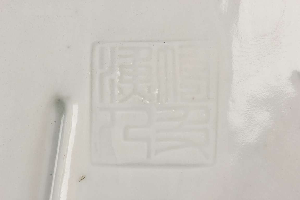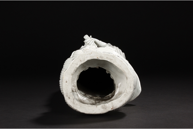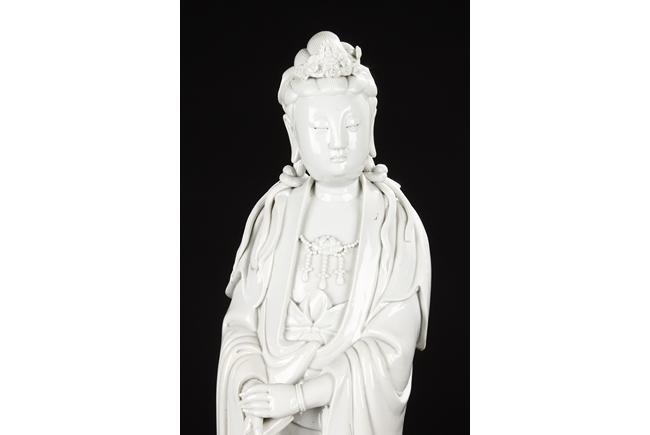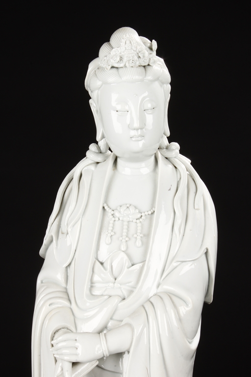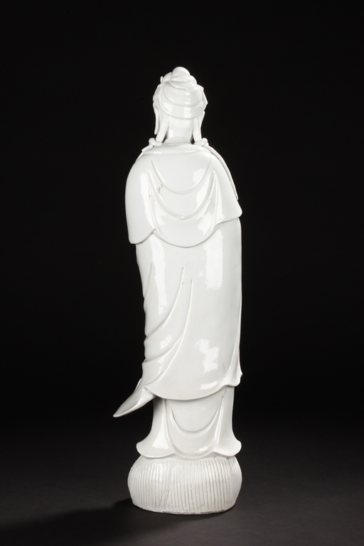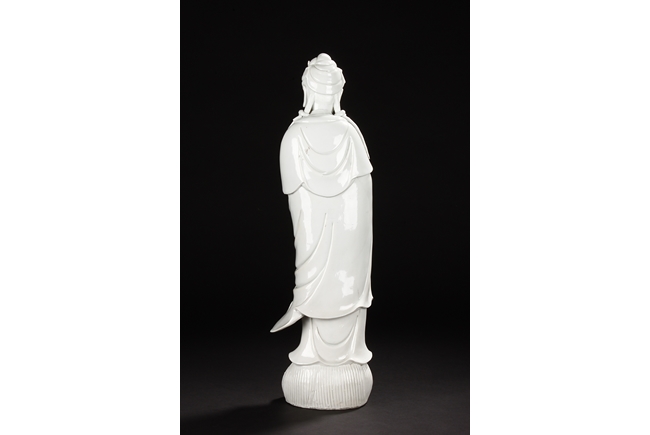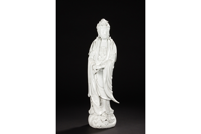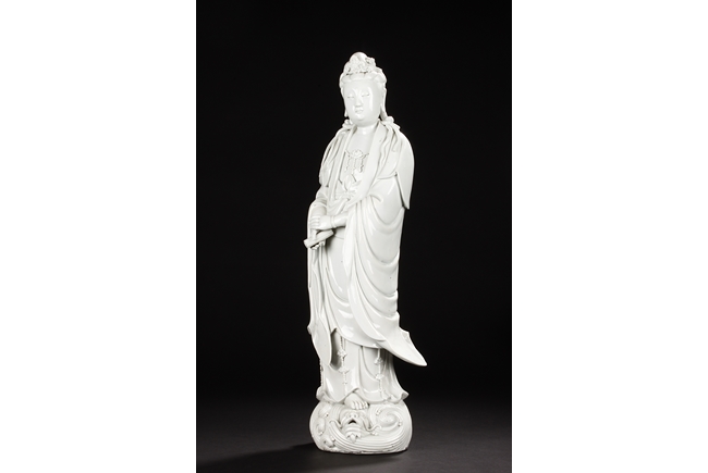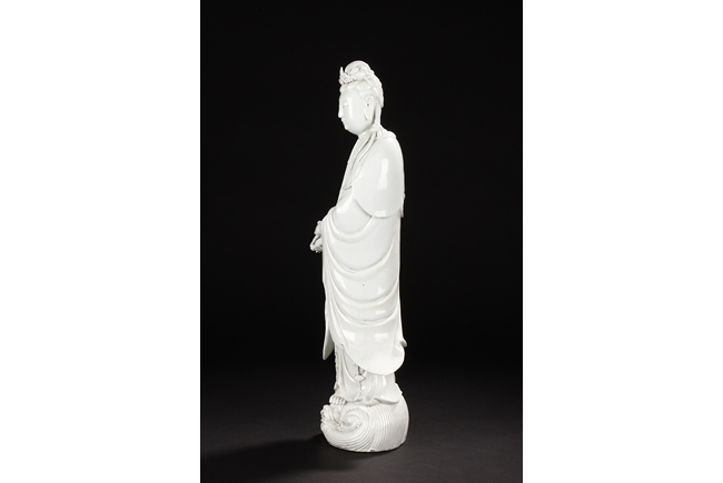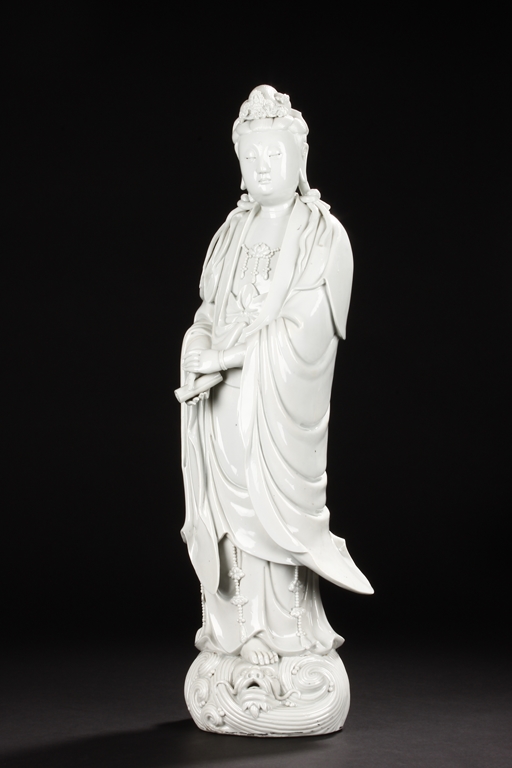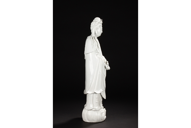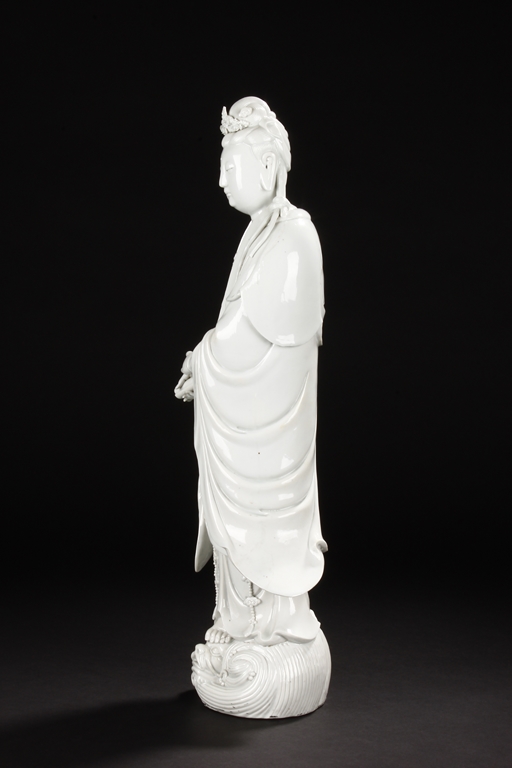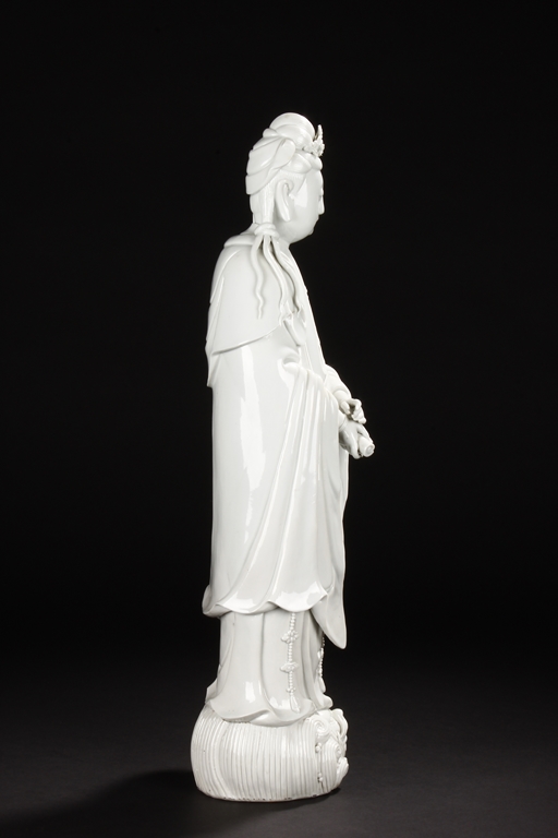 This well modeled Guanyin standing bare foot on a base of rippling applied and dragon head, her head slightly turning left and holding a scroll in her right hand, her face is depicted with a serene expression and downcast eyes and wearing a loose robe revealing her adorned chest, her hair is tied with a topknot, all under a fine white glaze.Qing Dynasty period.