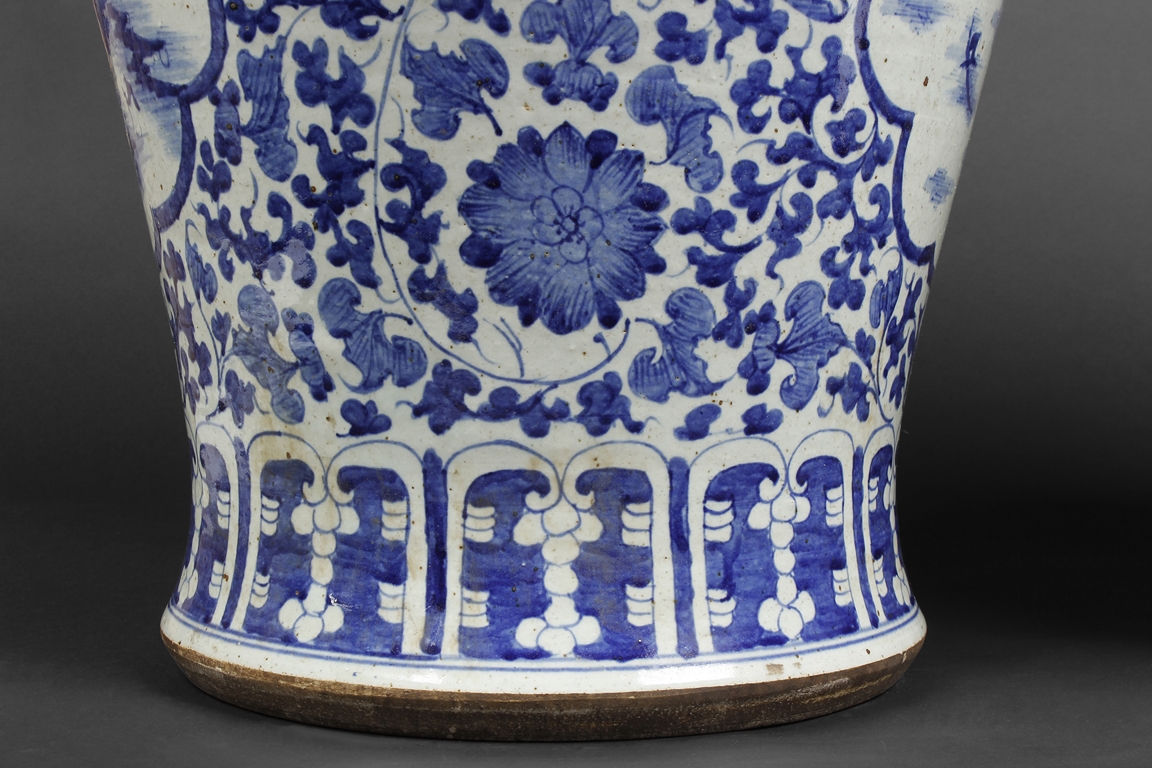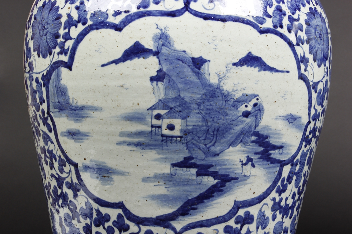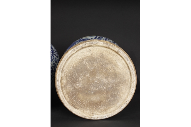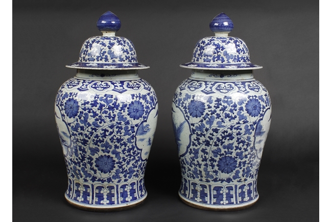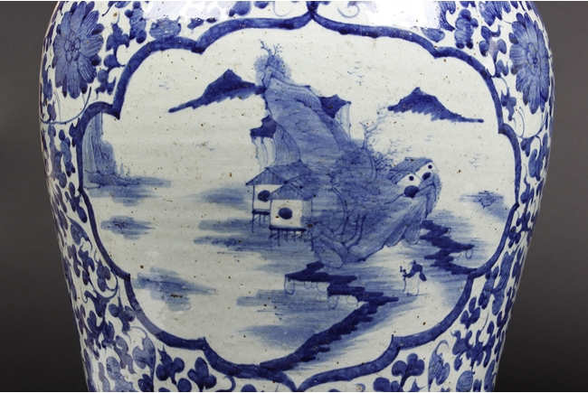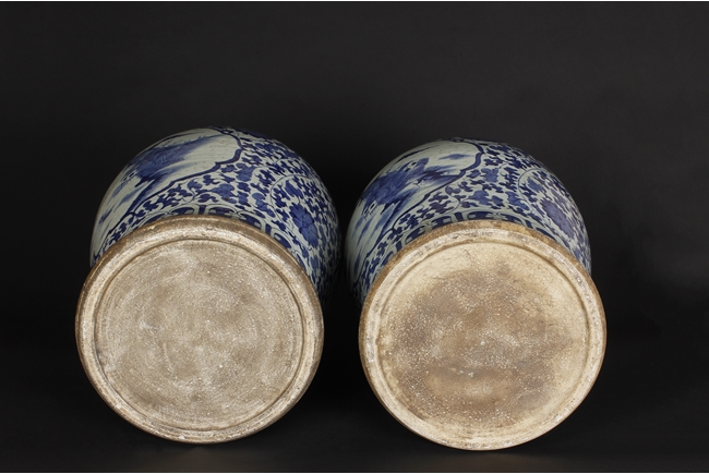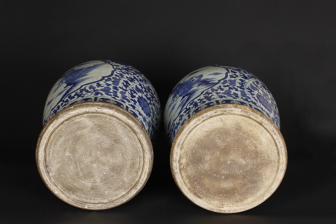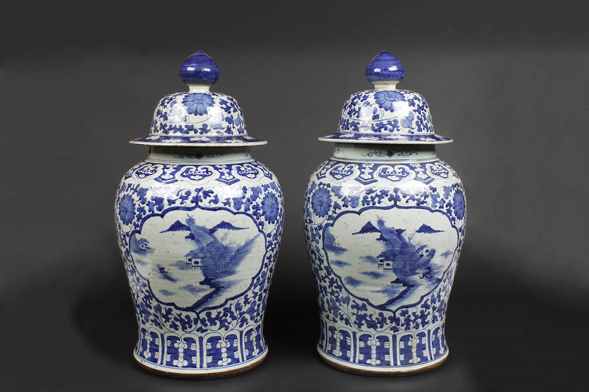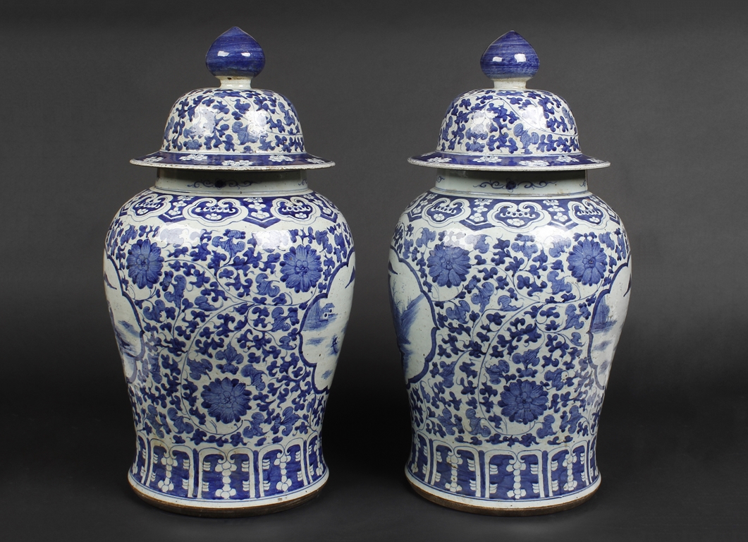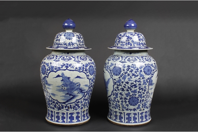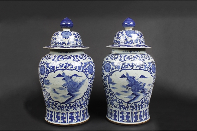 Well painted in cobalt blue with scrolling foliage encircling the body and landscape of houses and mountain river on both sides, the domed cover of this pair of jars is surmounted with a blue knop-shaped finial. Qing Dynasty period.