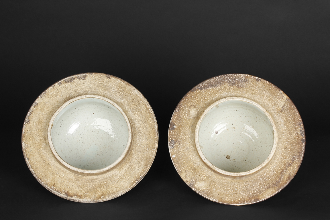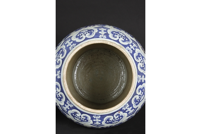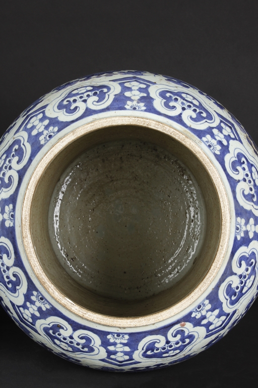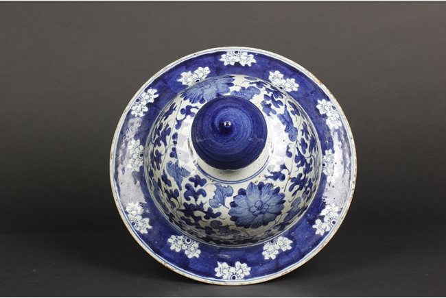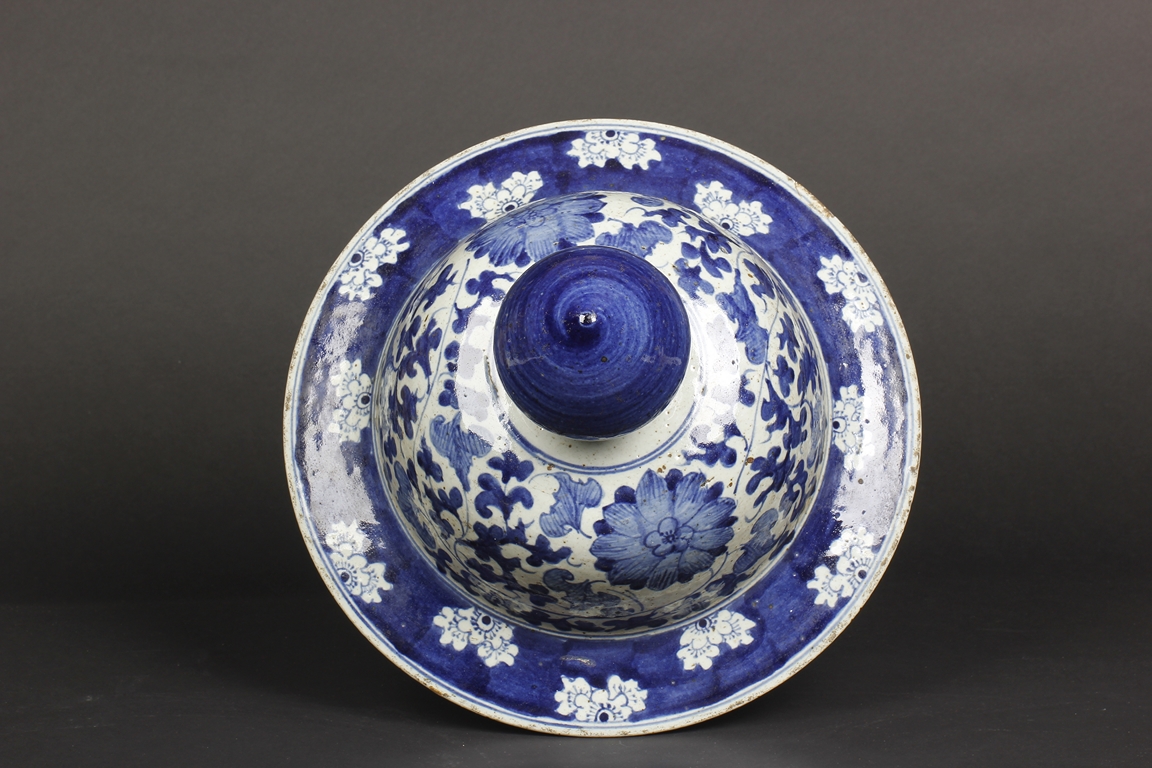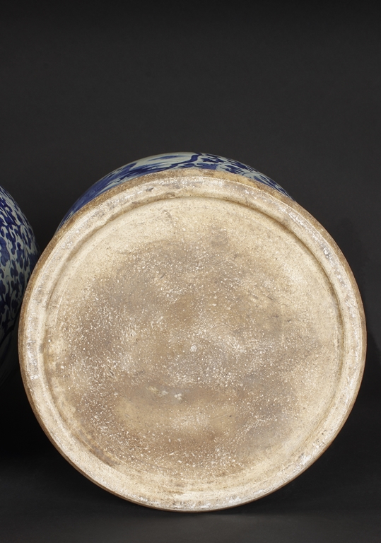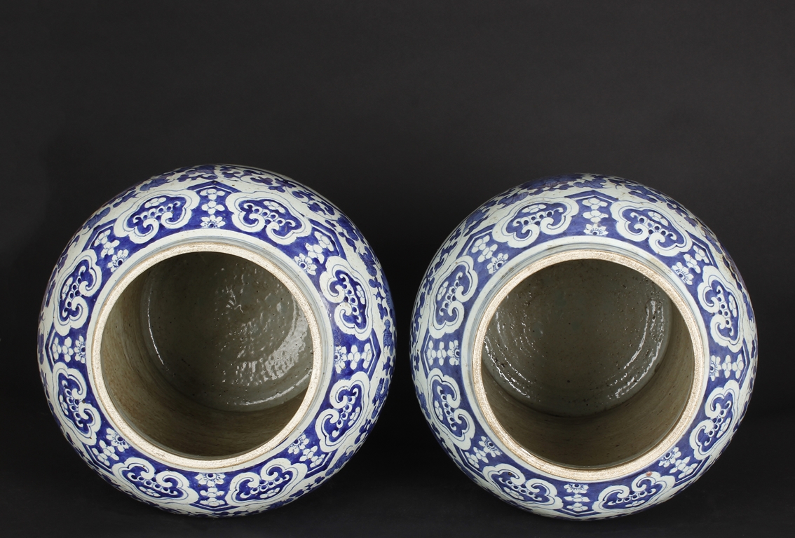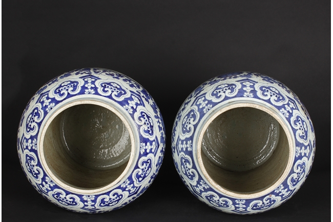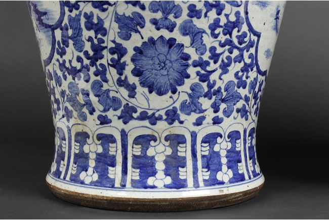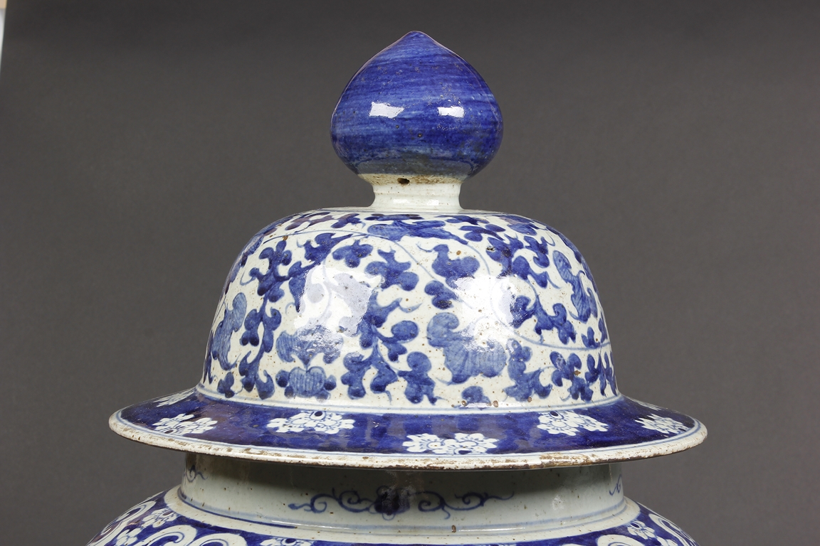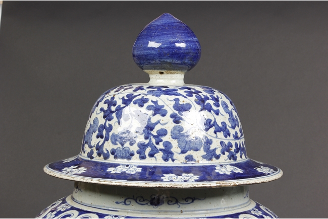 Well painted in cobalt blue with scrolling foliage encircling the body and landscape of houses and mountain river on both sides, the domed cover of this pair of jars is surmounted with a blue knop-shaped finial. Qing Dynasty period.