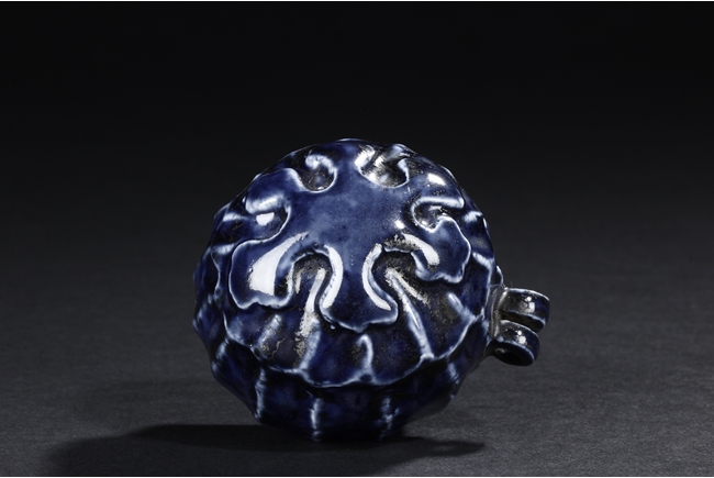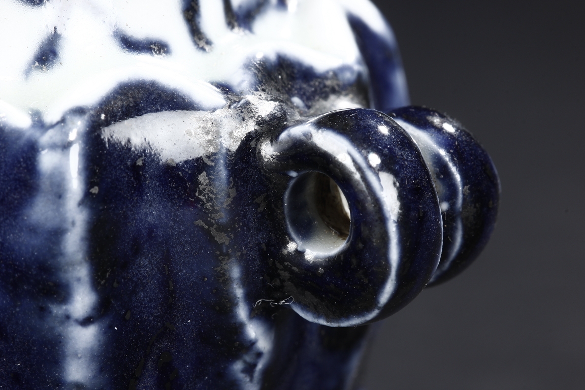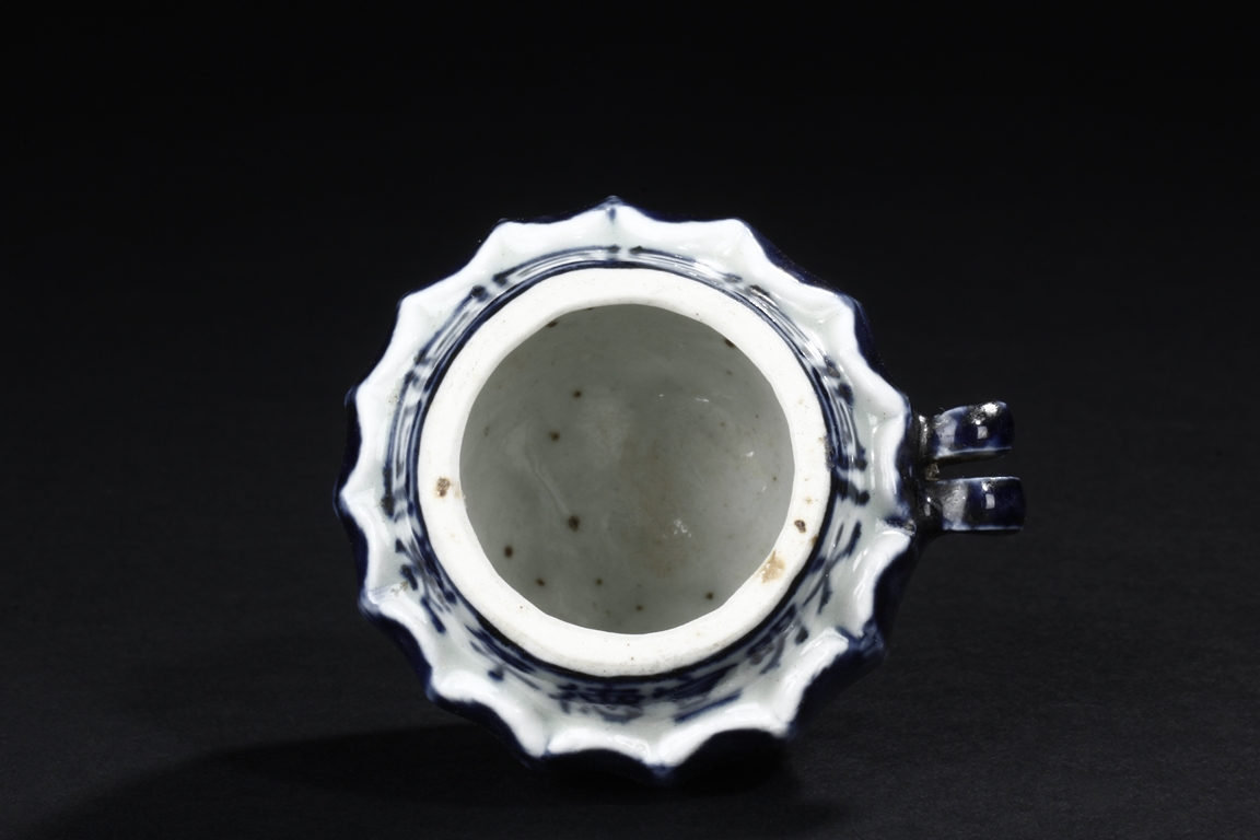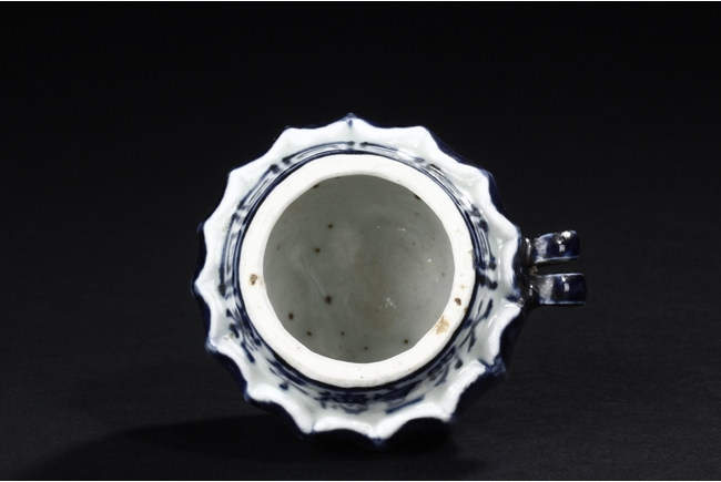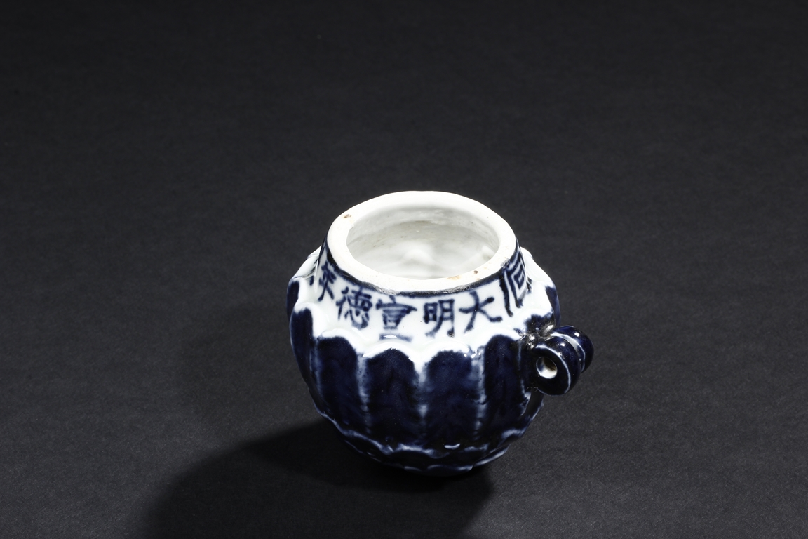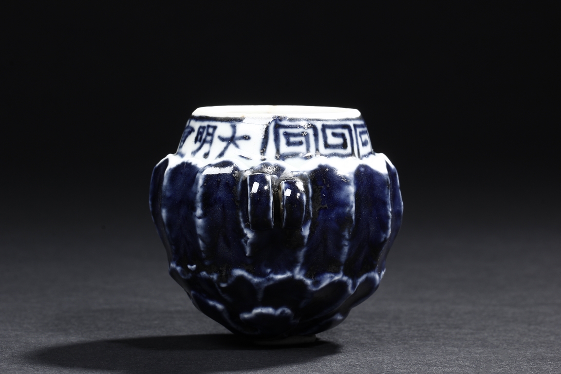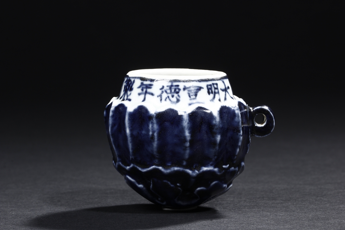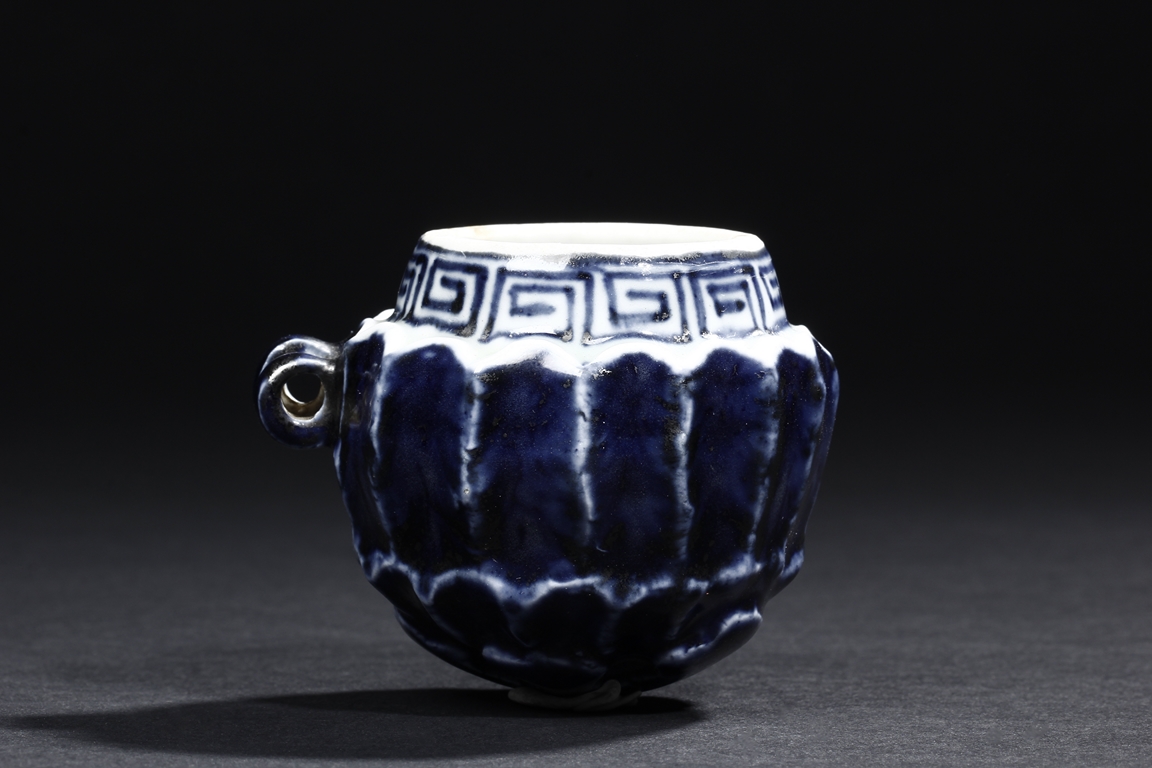 Of reverse conical floriform, the bird feeder's exterior painted and shaped in sections of blue, the neck with six key-fret patterns and six character "XUANDE" mark, the side with two looped handles close to each other to attach to the cage, and the bottom with a six-petal flower.Ming Dynasty Xuande period.