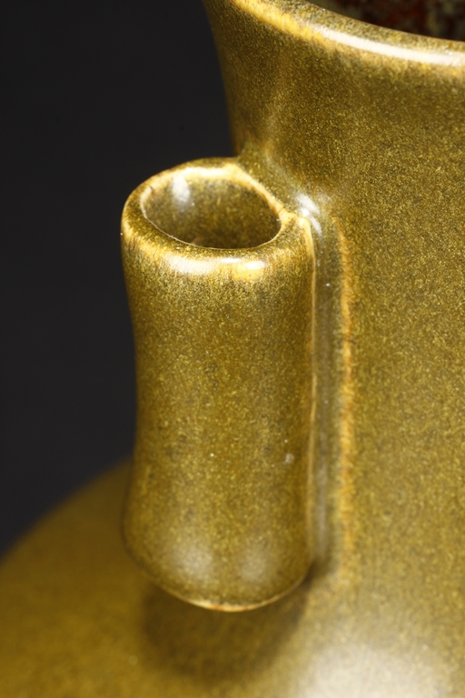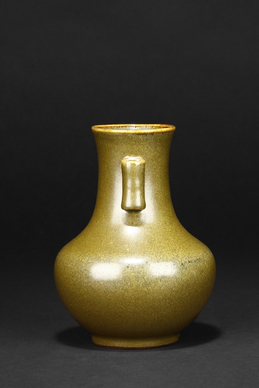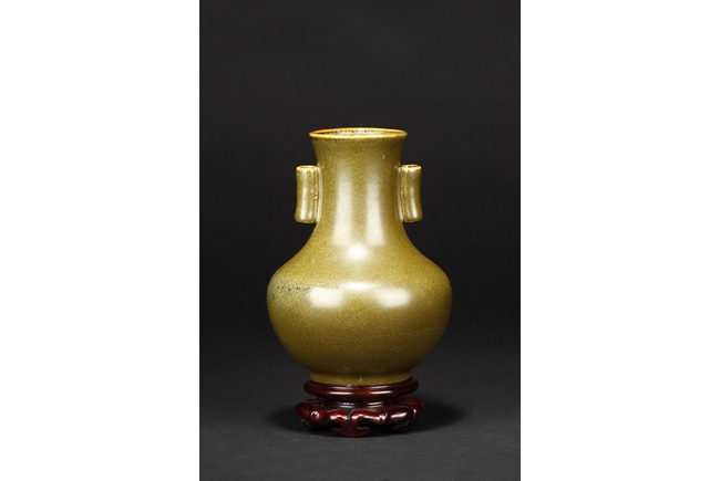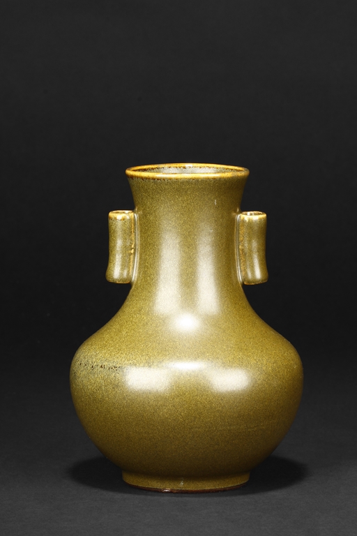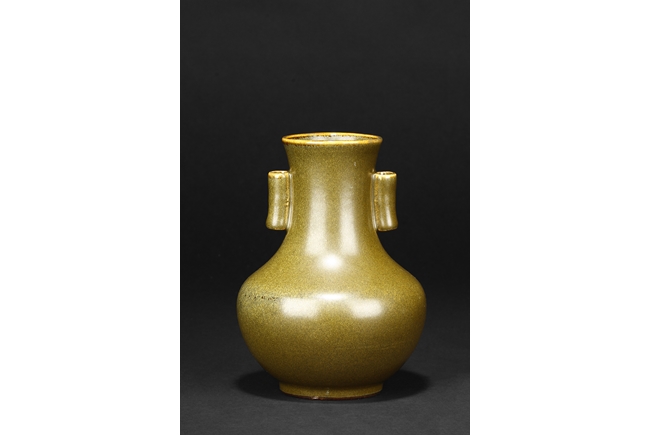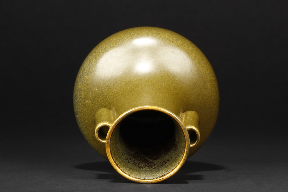 Of compressed baluster form, the vase raises from a tapering foot to a flaring neck applied with two handles and everted rim. It is overall covered in a monochrome tea-dust glaze. The bottom bears four character 'Daoguang' Mark. Qing Dynasty period.