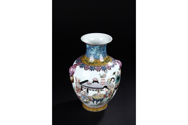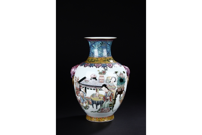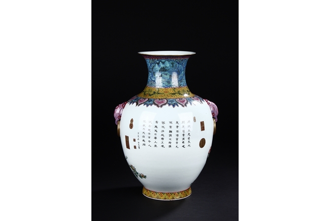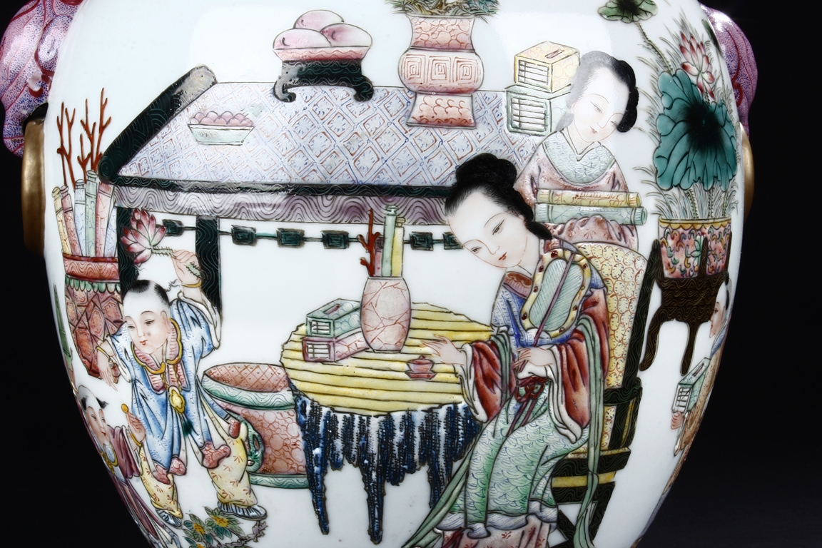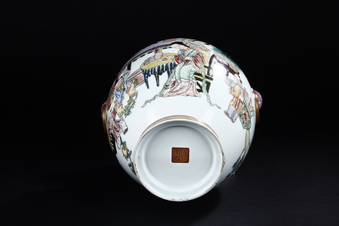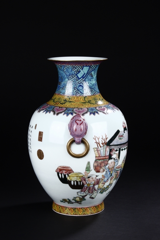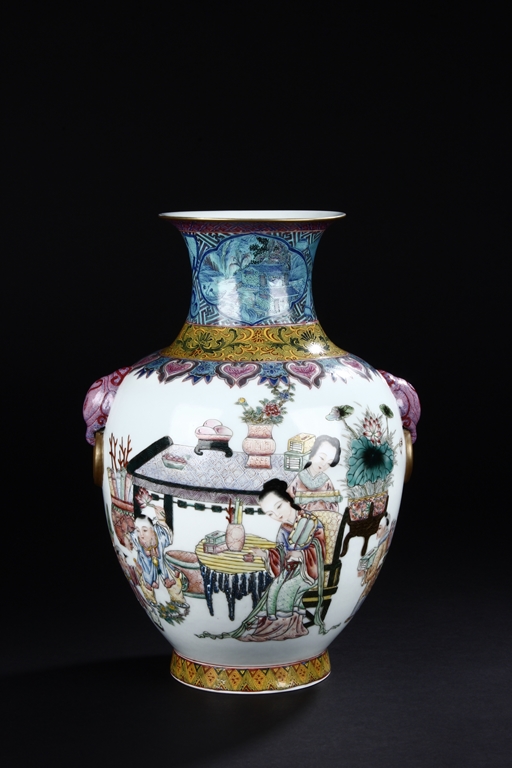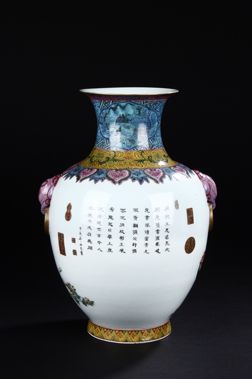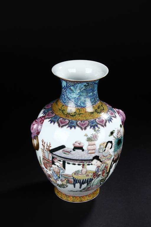 Of elegant baluster form, the vase body painted with two ladies and three children in a living room setting, below two colorful scrolling band of flower patterns, the sides moulded with ring handles extending from elephant mask, the reverse with poetry calligraphy and stamp marks, the neck with two roundels of riverside village landscape against swastika mark background, the bottom bears a four character "Ju Ren Tang Zhi" mark.