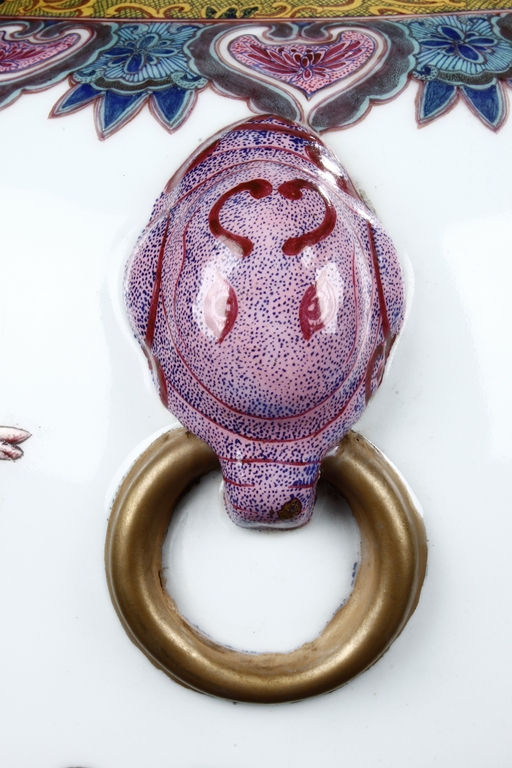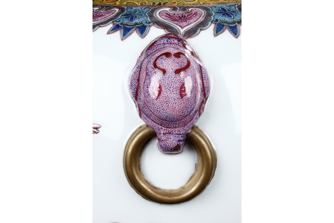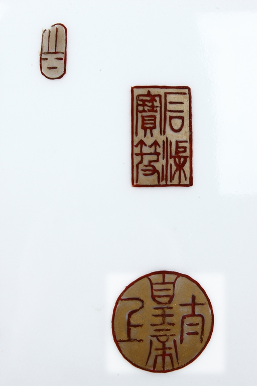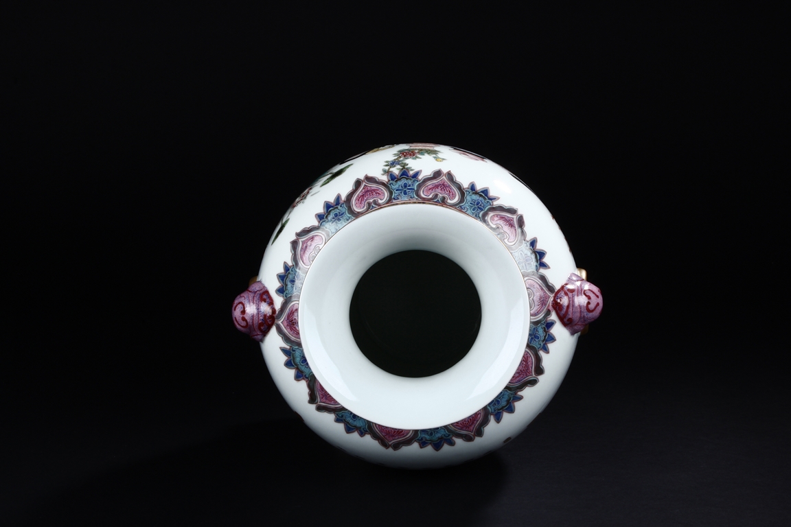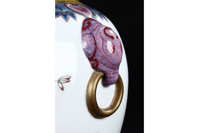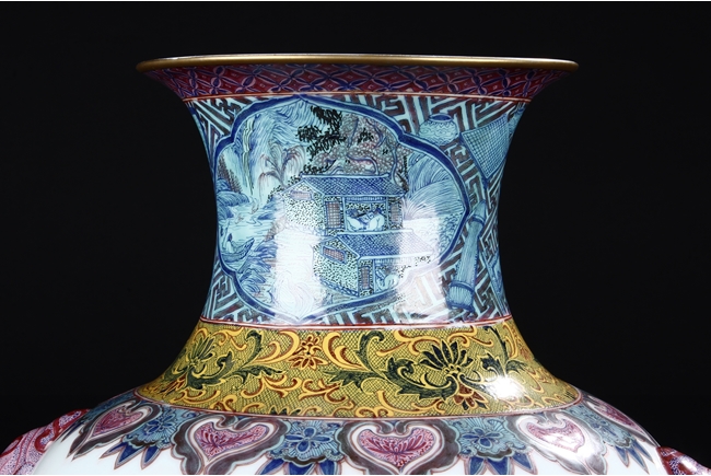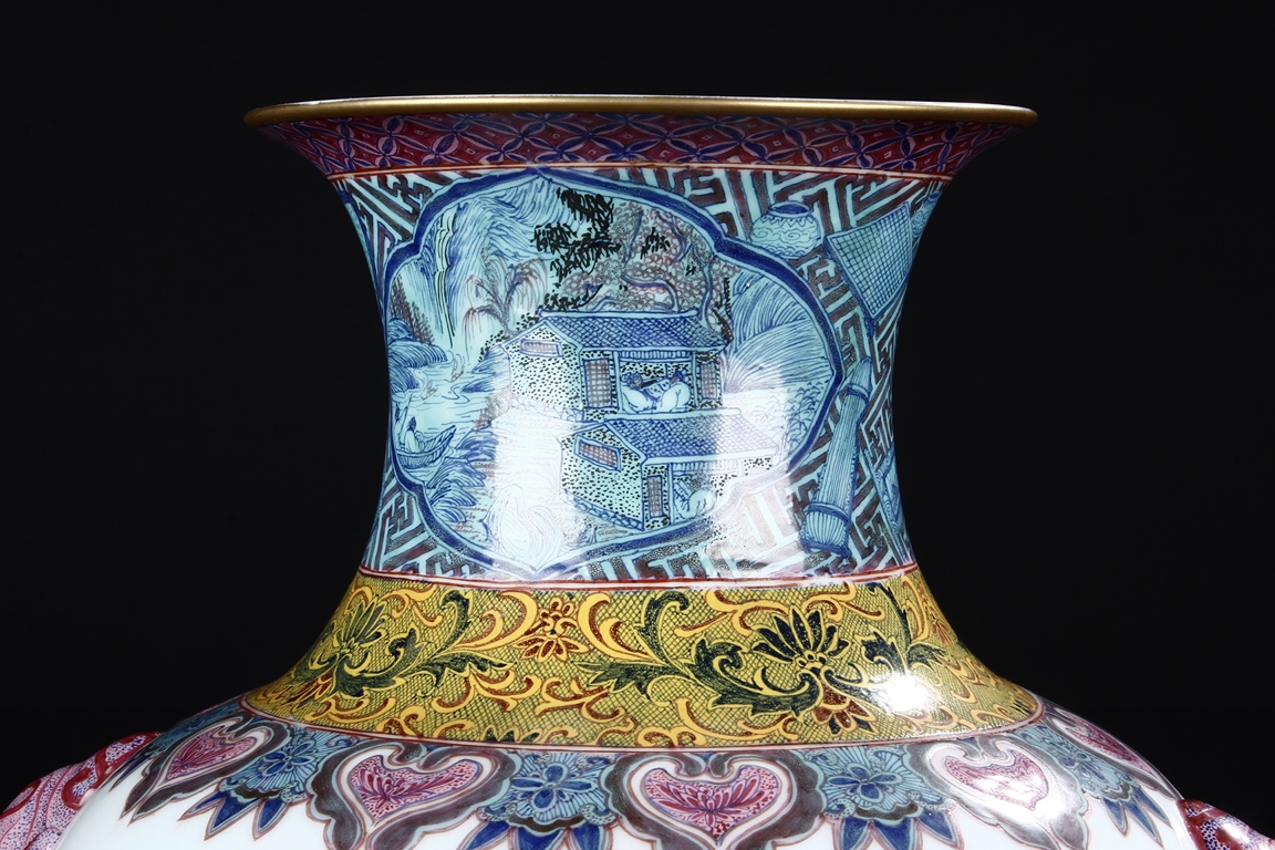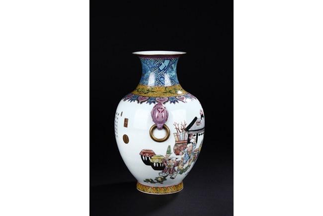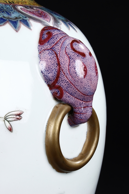 Of elegant baluster form, the vase body painted with two ladies and three children in a living room setting, below two colorful scrolling band of flower patterns, the sides moulded with ring handles extending from elephant mask, the reverse with poetry calligraphy and stamp marks, the neck with two roundels of riverside village landscape against swastika mark background, the bottom bears a four character "Ju Ren Tang Zhi" mark.