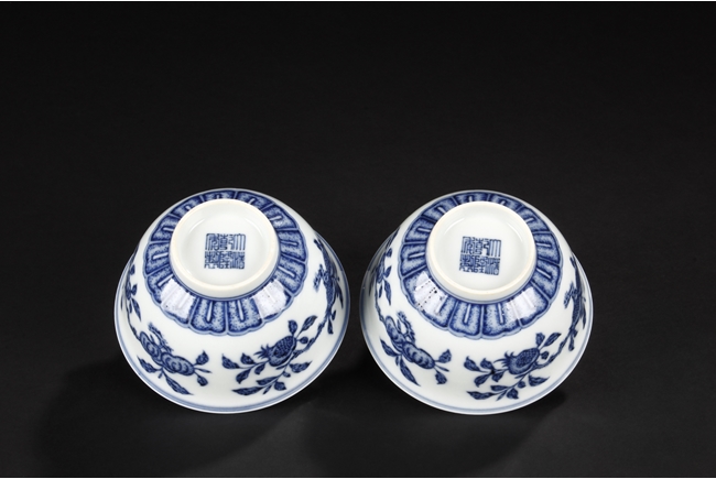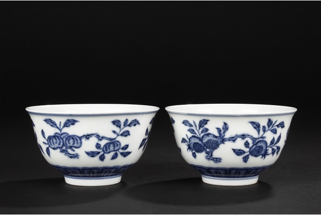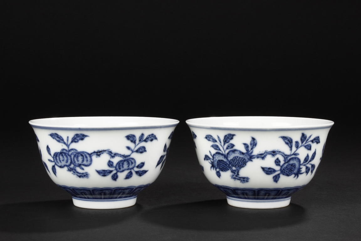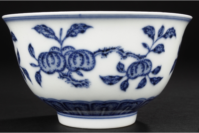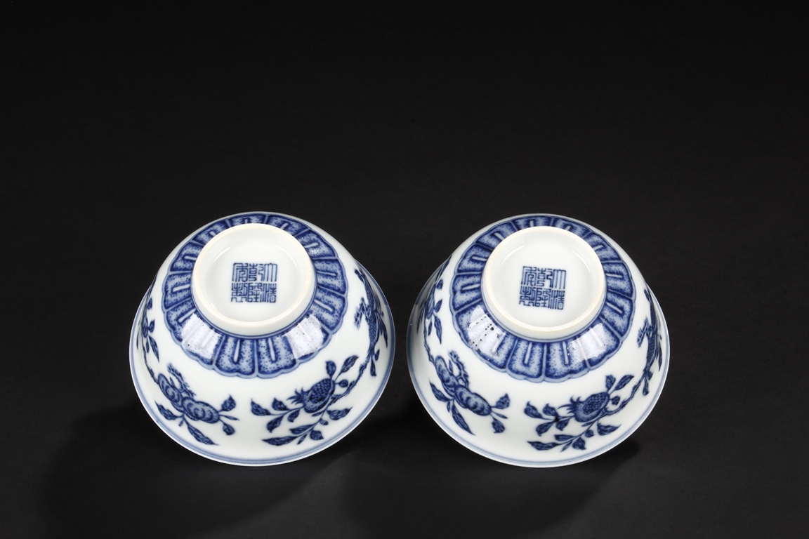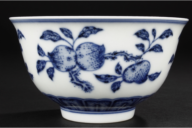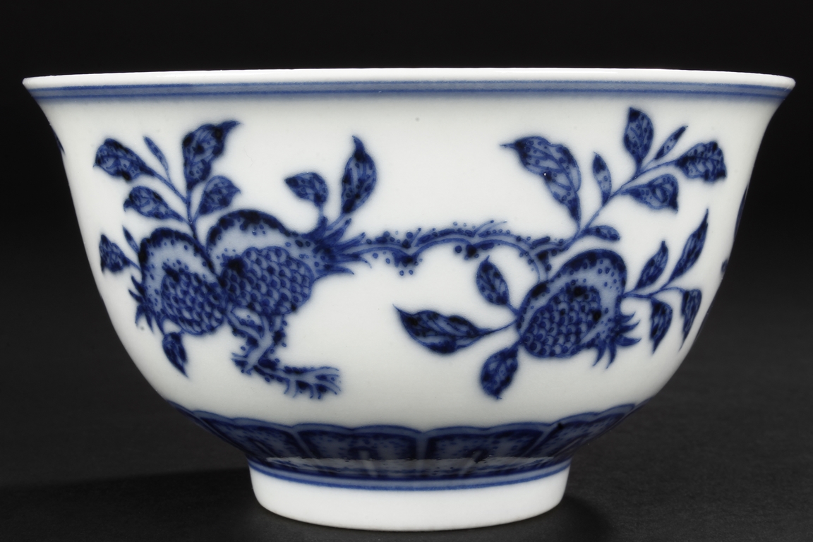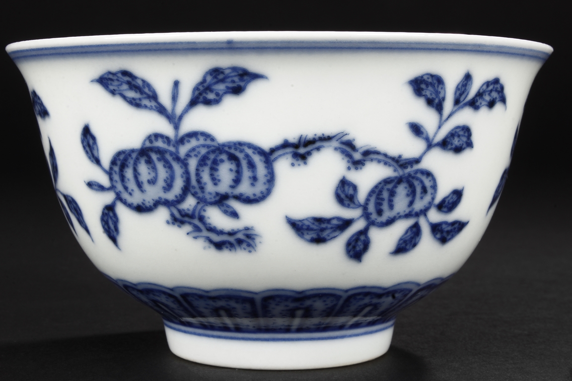 Rising from a slightly flaring round foot to an everted rim, the exterior is painted with different fruits and flower decorations, including pomegranate and melon. The bottom bears the six character mark 'Qianlong'. Qing Dynasty period.