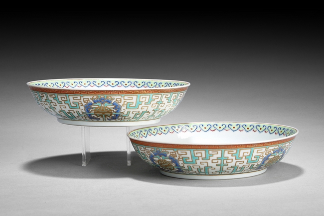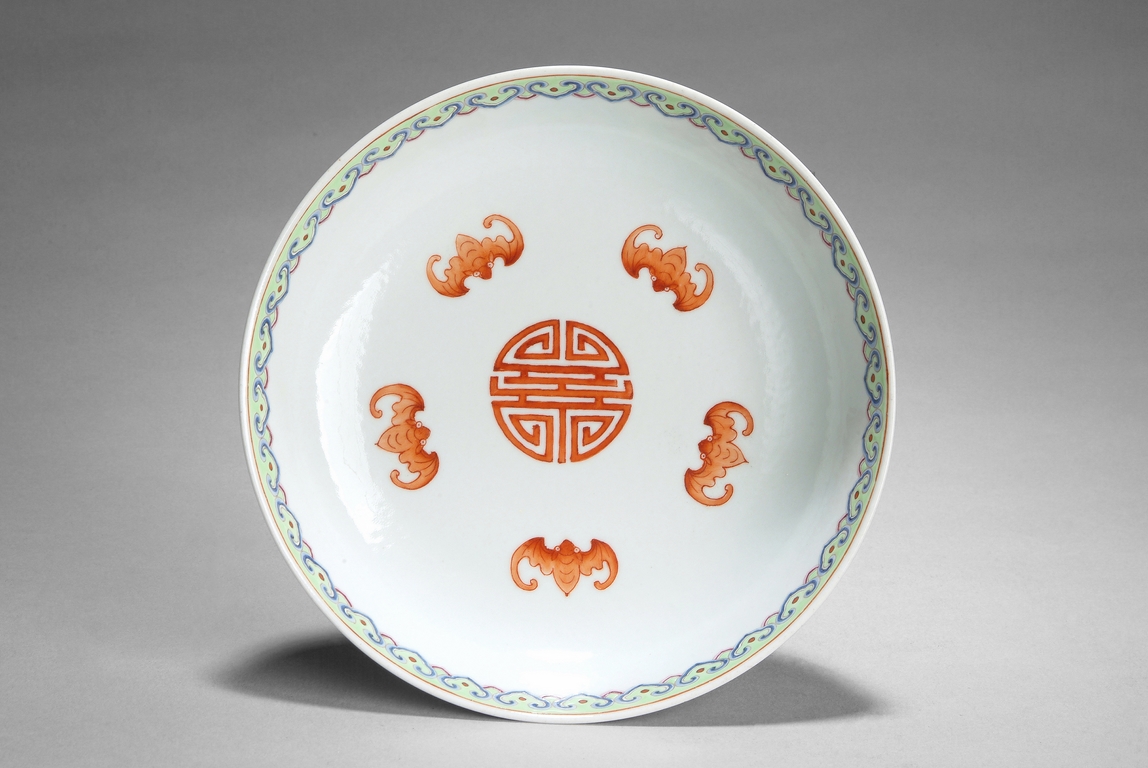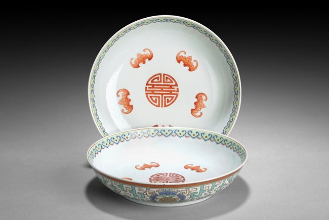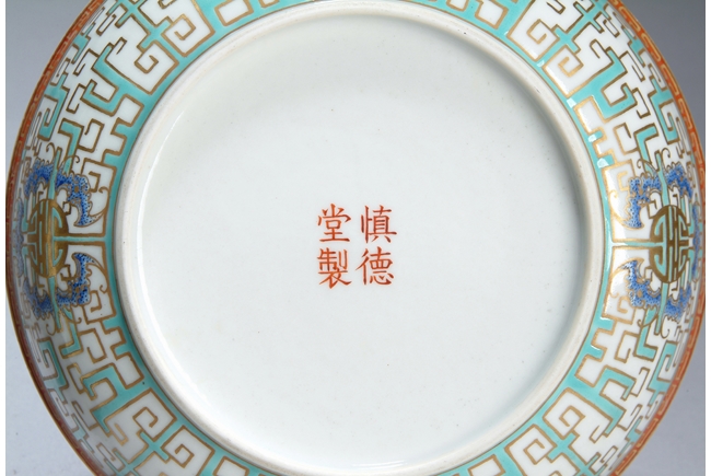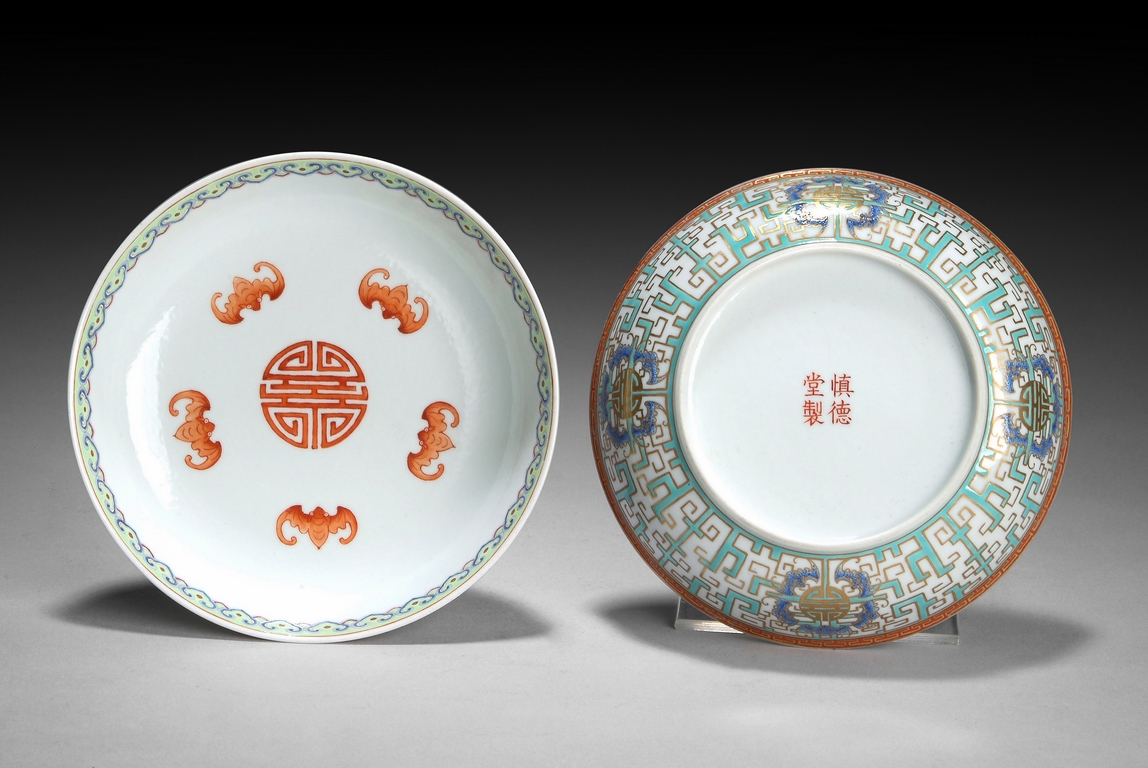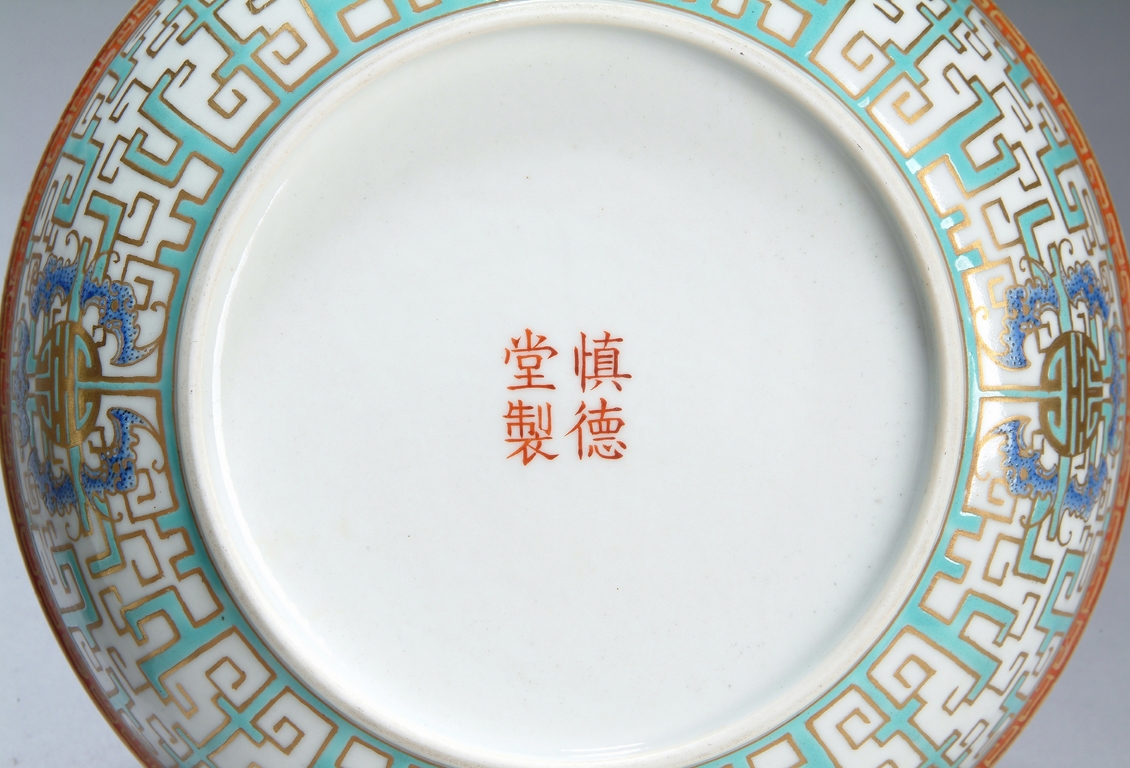This pair of famille rose dishes have designs of five bats around a Chinese stylized character Shou, which symbolizing fortune and longevity. The exterior and the rim has varied patterns as well. The base bear the four characters mark of "SHEN DE TANG ZHI". Qing Dynasty Period.