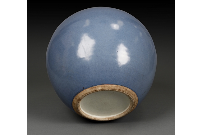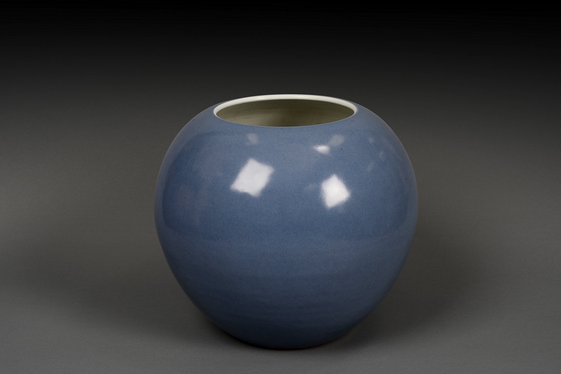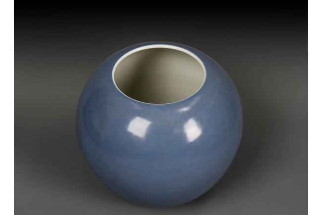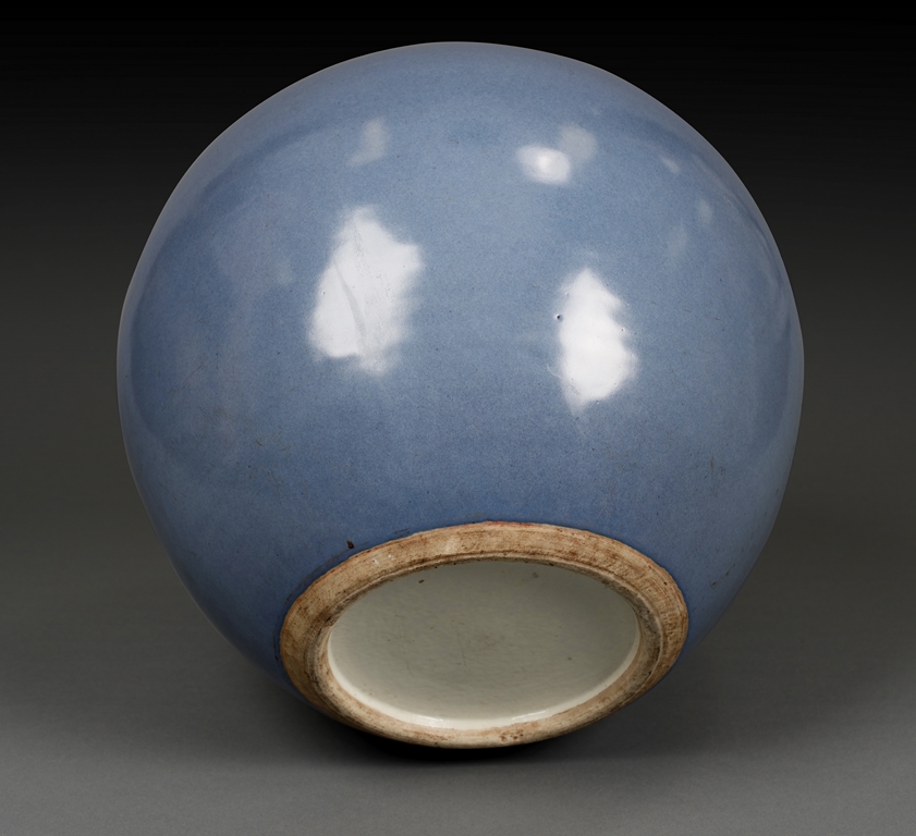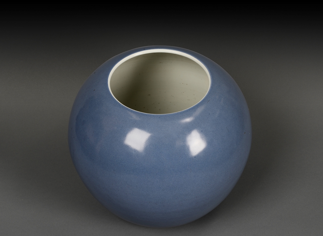 This large bulbous scroll pot is glazed overall in blue, with the interior and the base glazed in white color. Mid Qing Dynasty period.