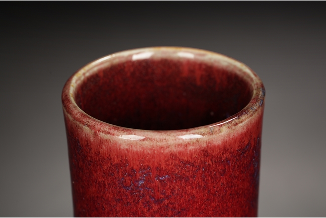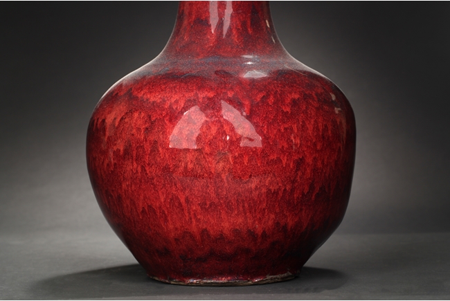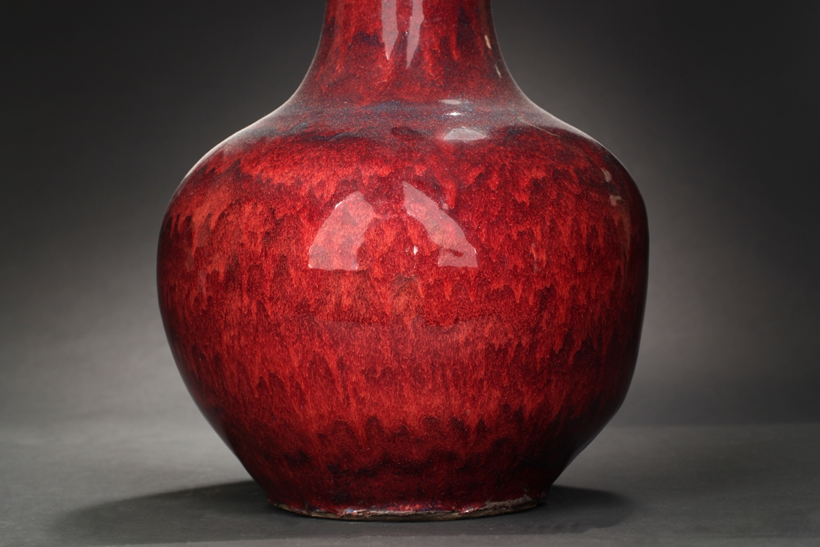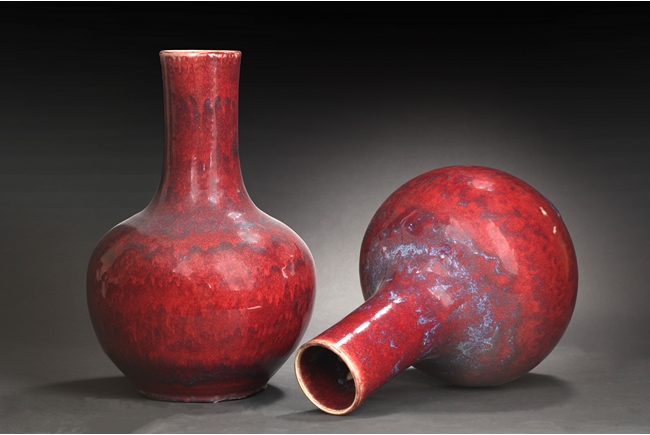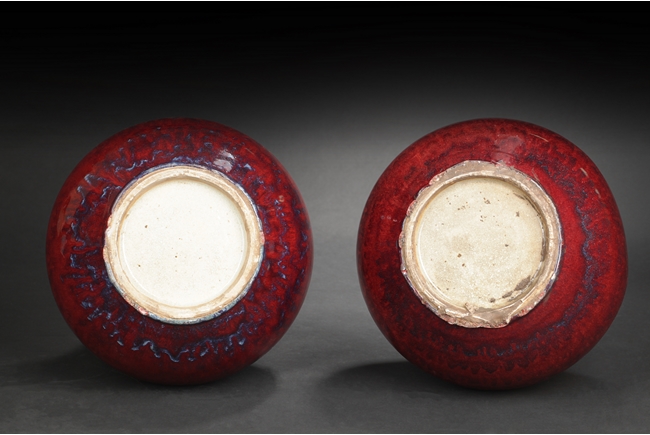 Of globular shape, each vase features tall and straight neck, a ovoid shaped bottom, and flambe glazed exterior with some blue hue. Mid Qing Dynasty period.