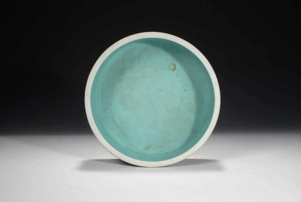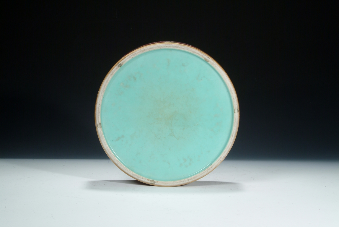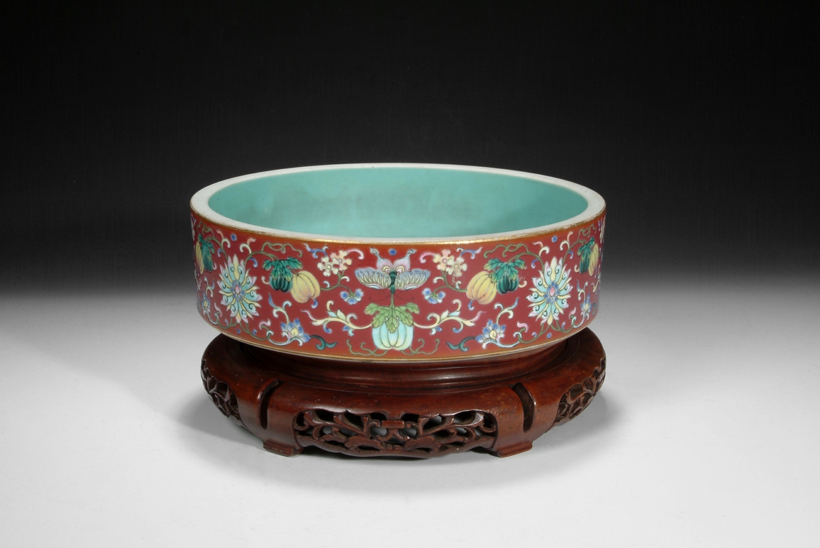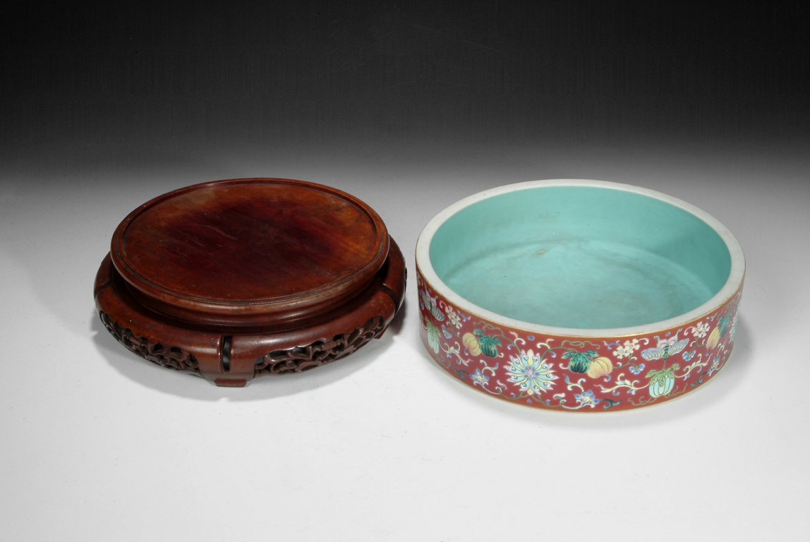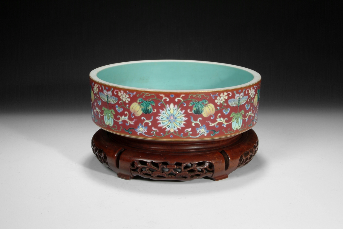 This famille rose washer is decorated with auspicious design of butterflies over melons on the exterior against the red glazed ground, which symbolizes the wish for prosperity of the family. Both interior and base are glazed in turquoise color. The rim is unglazed. The piece is completed with a carved openwork wood base. Qing Dynasty period.