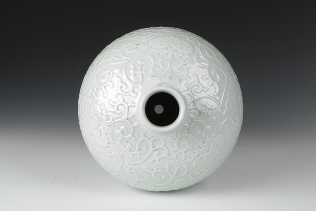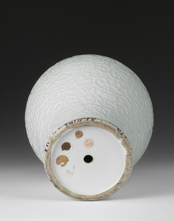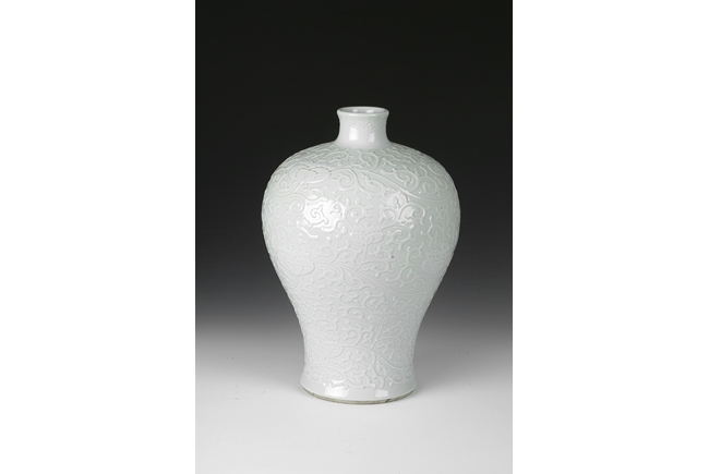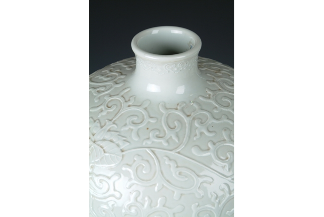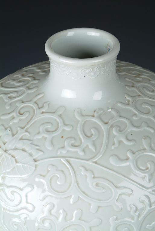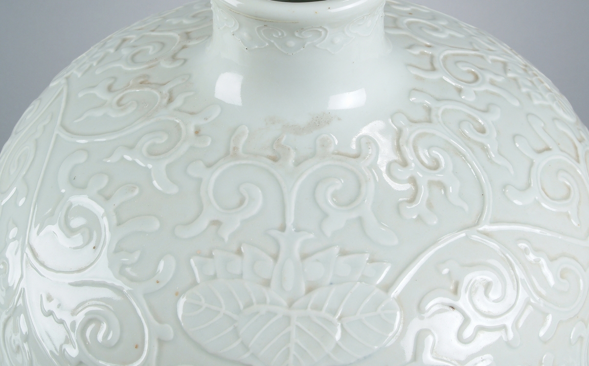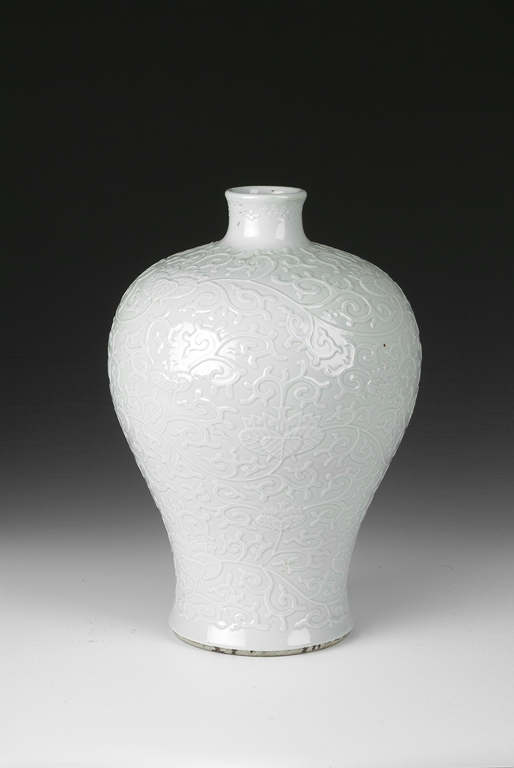 Of elegant baluster shape, well potted with tall, high-shouldered, tapering body below a short neck with lipped rim, covered overall in finely moulded lotus and vine patterns on top of white glaze, above the slightly splayed foot to expose the pale brown stoneware. Qing Dynasty period.