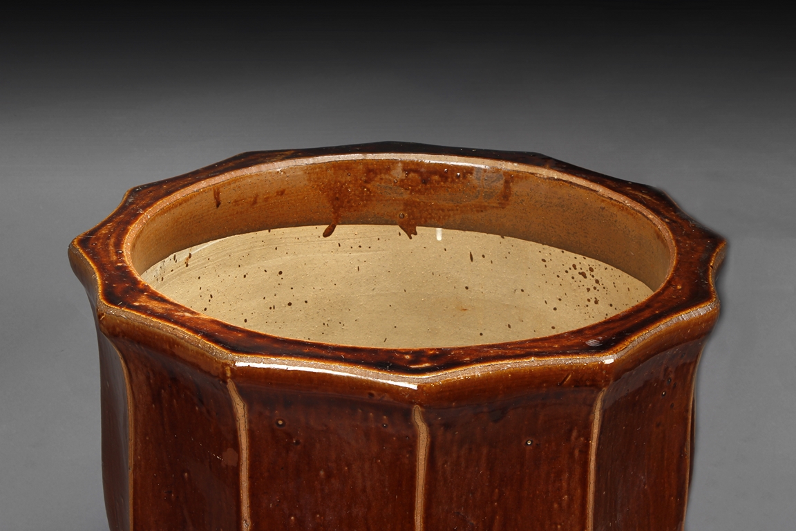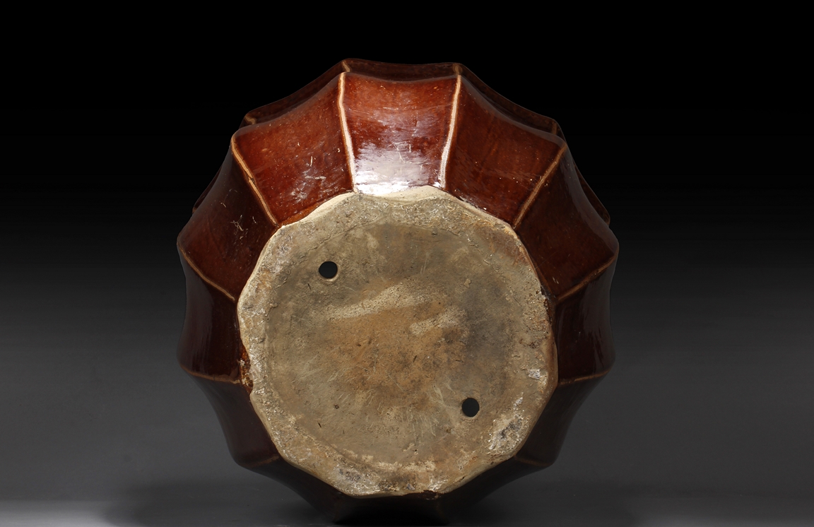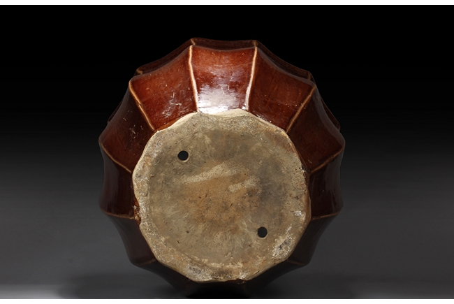 Of tapering floriform, the sides have 12 lobes divided equally, with slightly flaring lip. The bottom is unglazed with two holes. Covered overall in brown glaze.