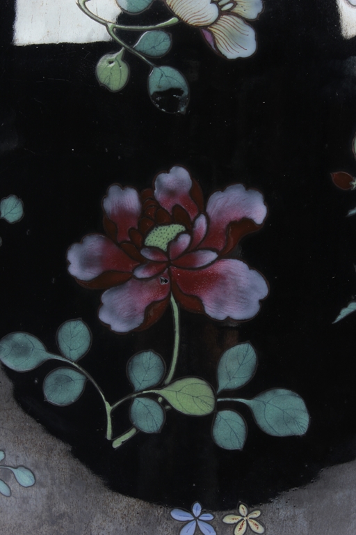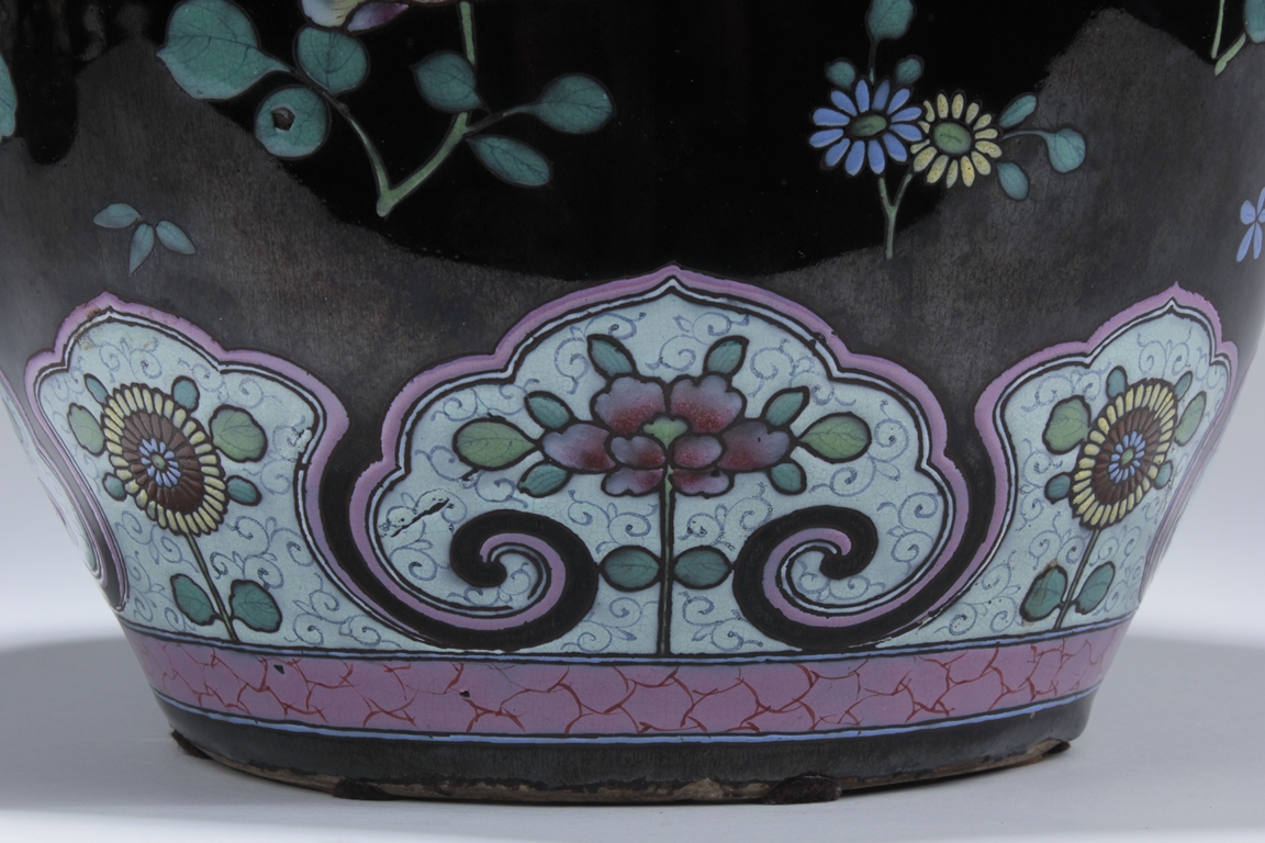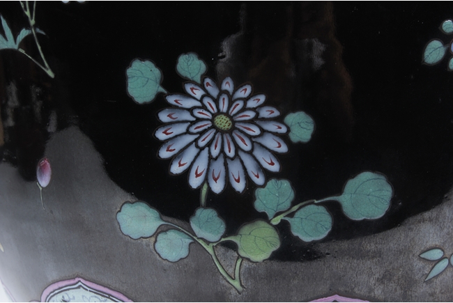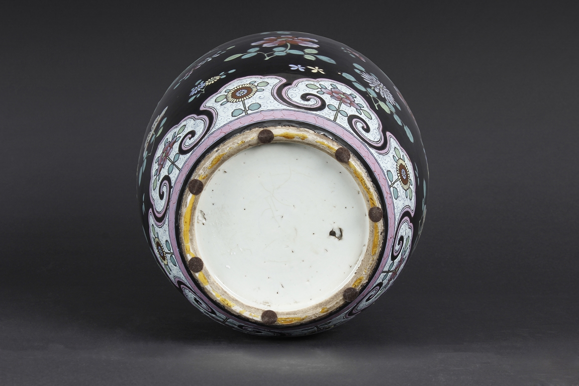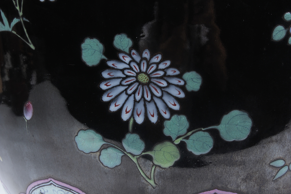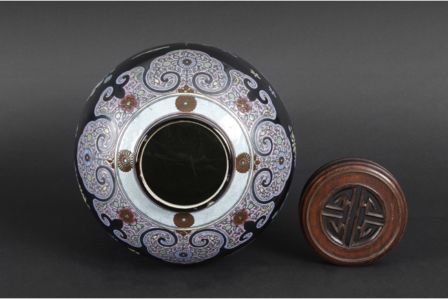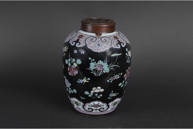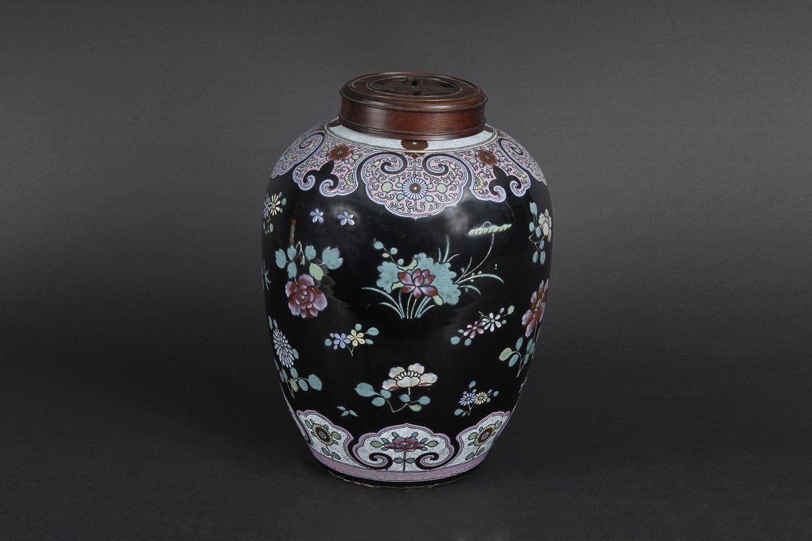 Of ovoid form, the exterior painted with a variety of flowers such as lotus, chrysanthemum, and peony, against rich black ground, in between scrolling band of ruyi head patterns encased with similar motif flowers, and includes an en-suite pierce carved wood cover.