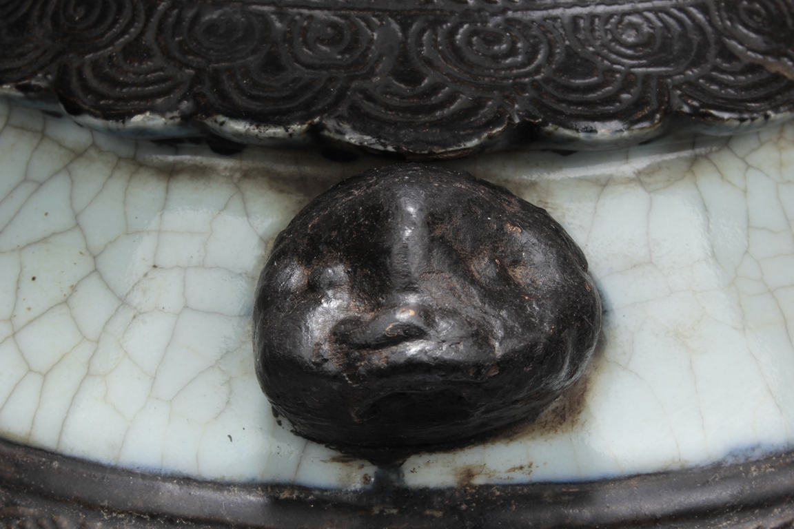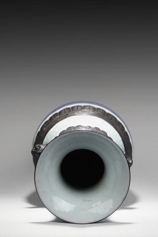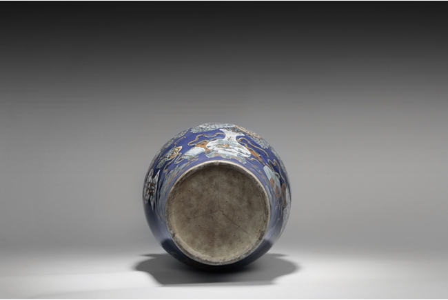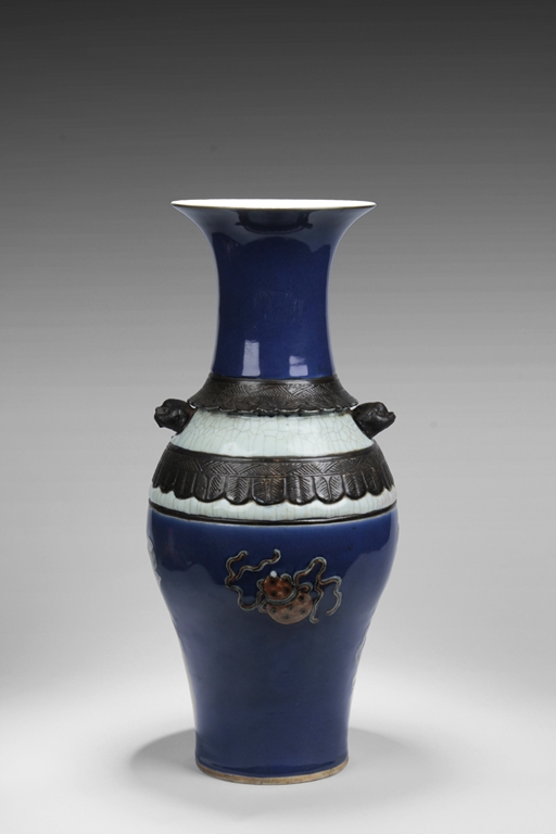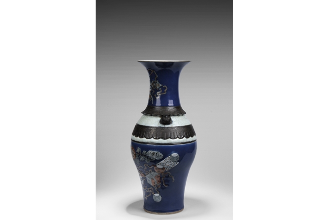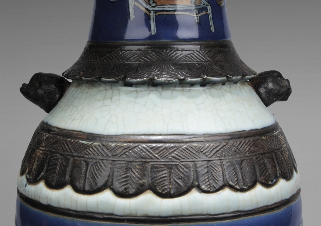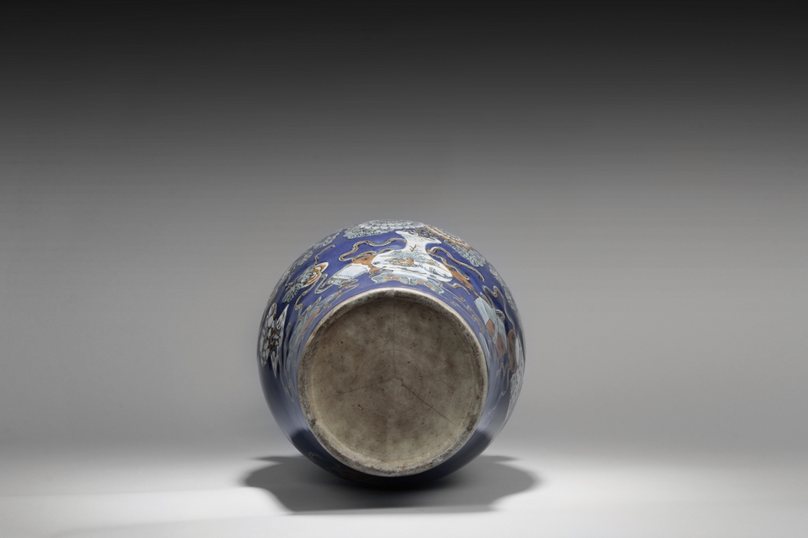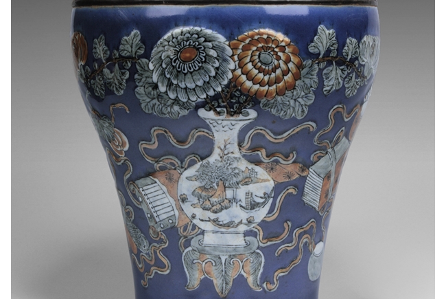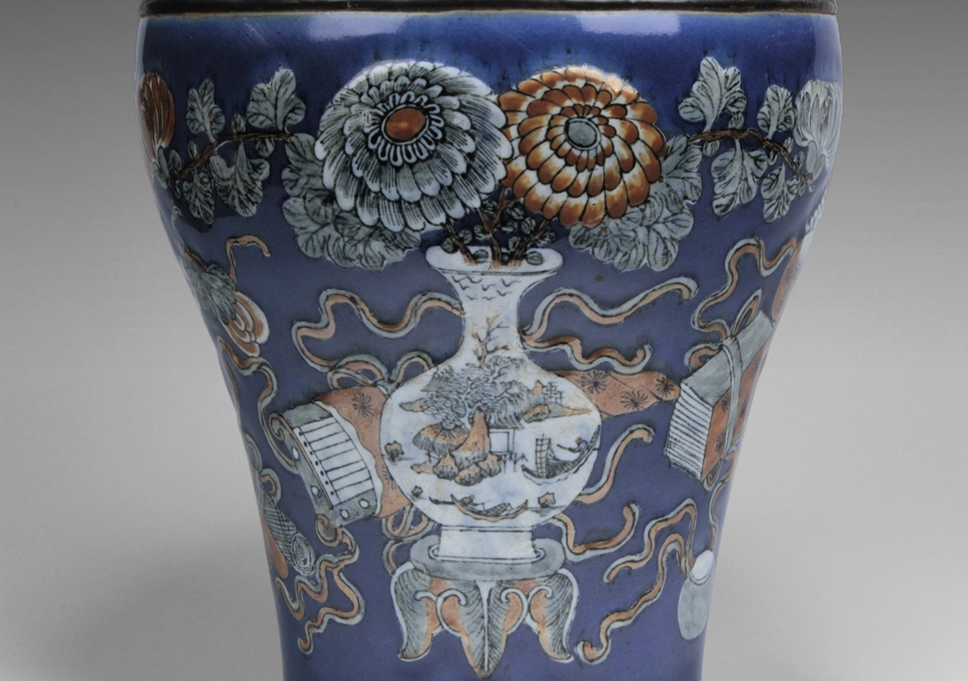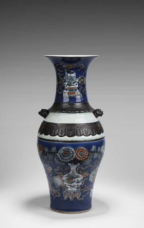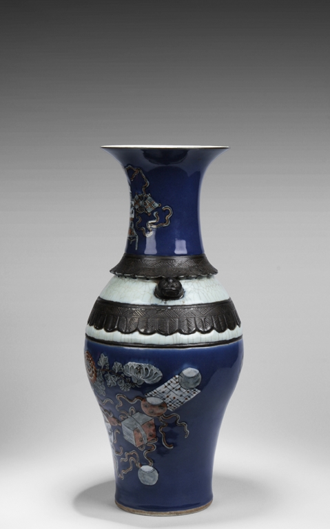 Of baluster form, the body depicts a flower vase full of chrysanthemum flowers at center, next to it placed with the 'Four Arts of the Chinese Scholar', including Guqin instrument, scrolls of painting, books of calligraphy, and weiqi board game; the back side depicts a double gourd, all on deep blue ground, beneath scrolling leaf band pattern and a pair of beast mask handles, and the waisted neck painted with a censer over blue ground rises to a flare rim. Qing Dynasty period.
