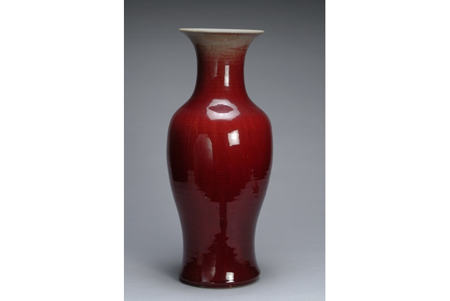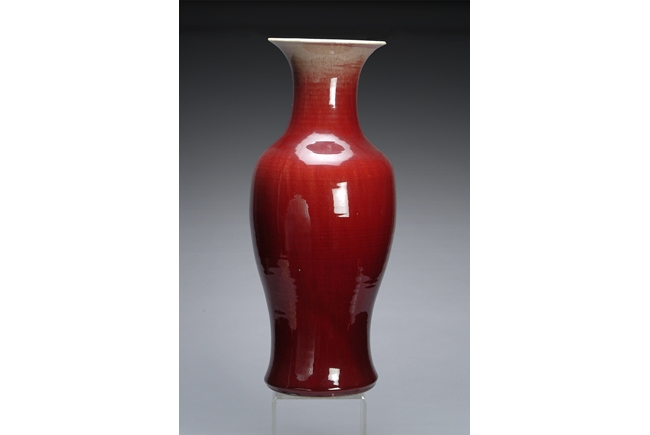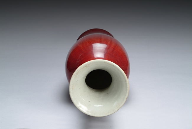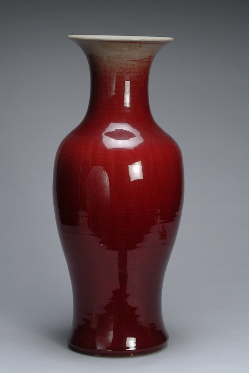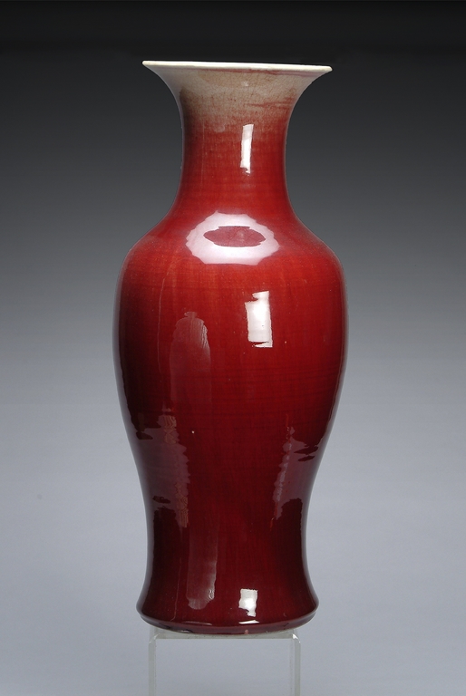 Of baluster form, this vase rises from a flaring base to a long slender neck. The exterior is monochrome red glazed with white glazed rim. Republic period.