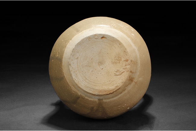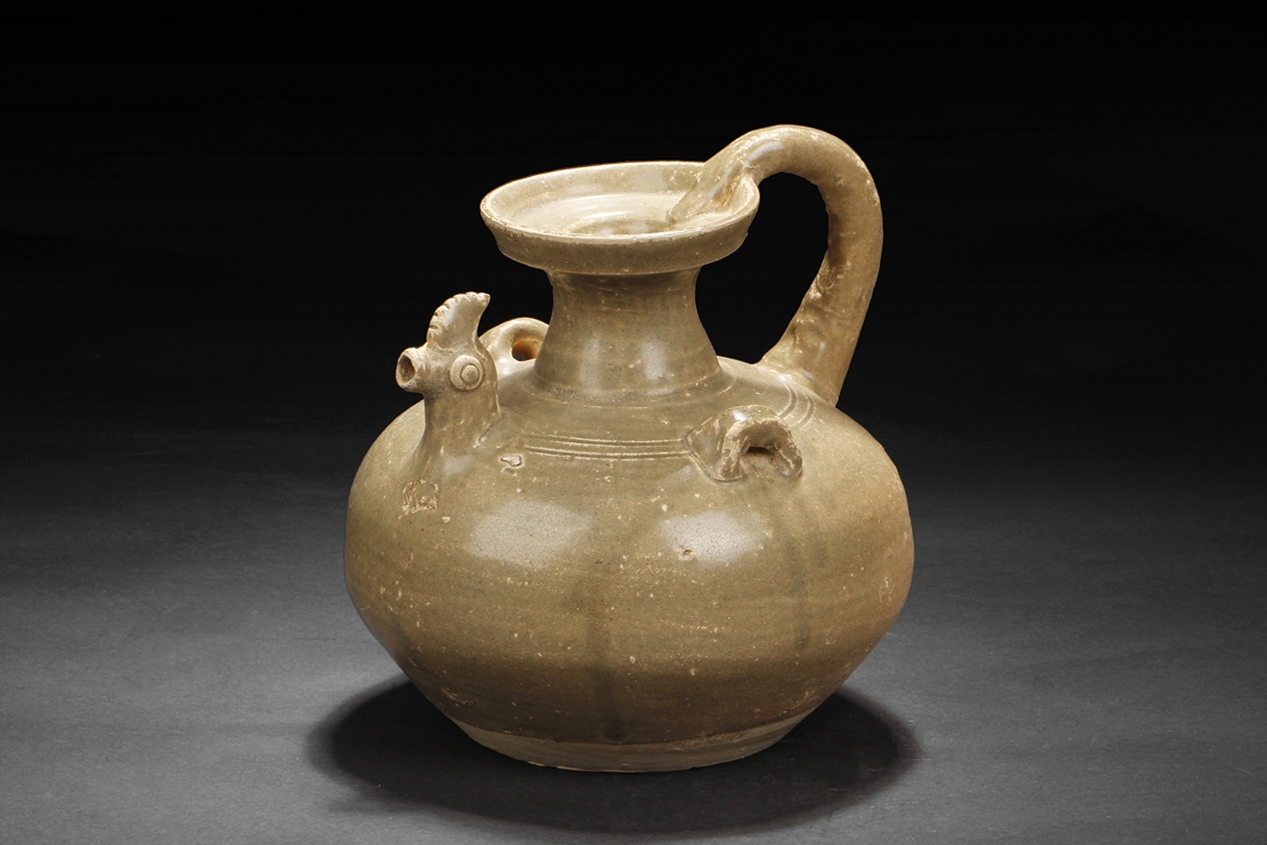 Of globular form, the pot glazed in greenish-brown color, the spout in the shape of a chicken's head, a pair of arched ring handles on the side, and a curved handle linked from pot's body to the top rim, bottom unglazed. 15/16th century.