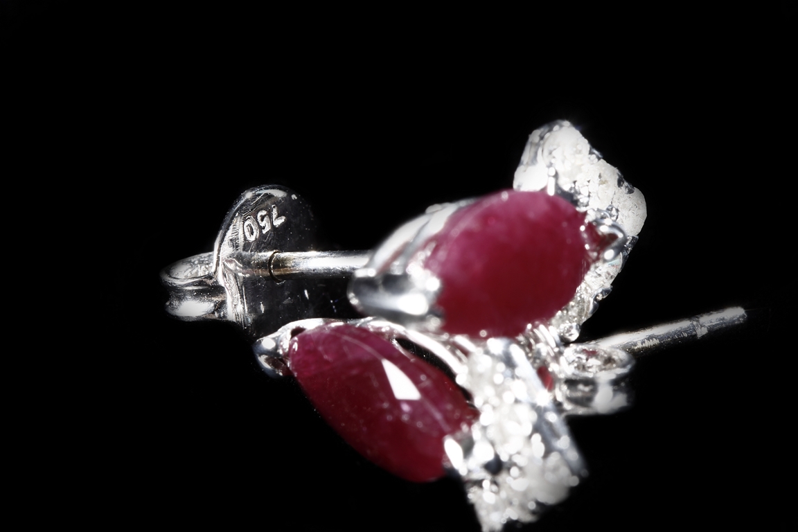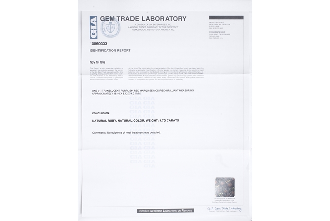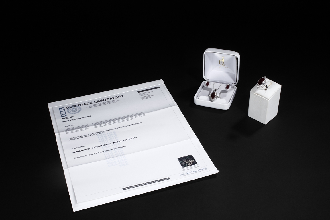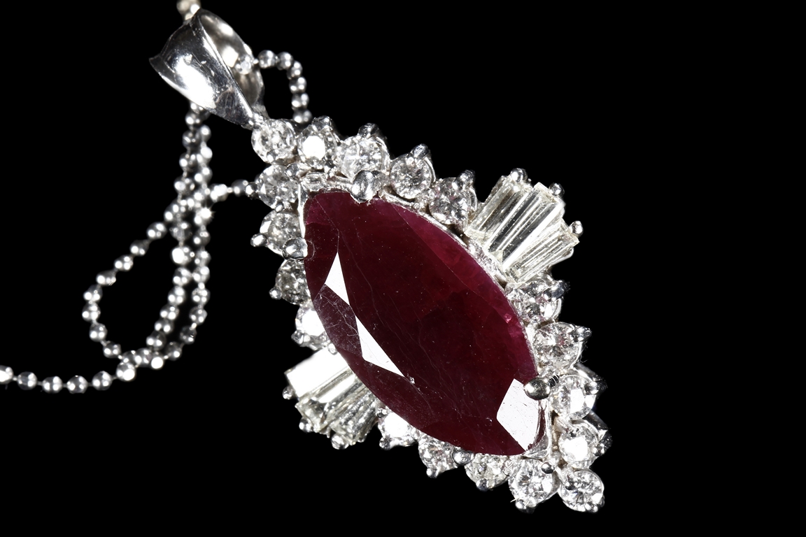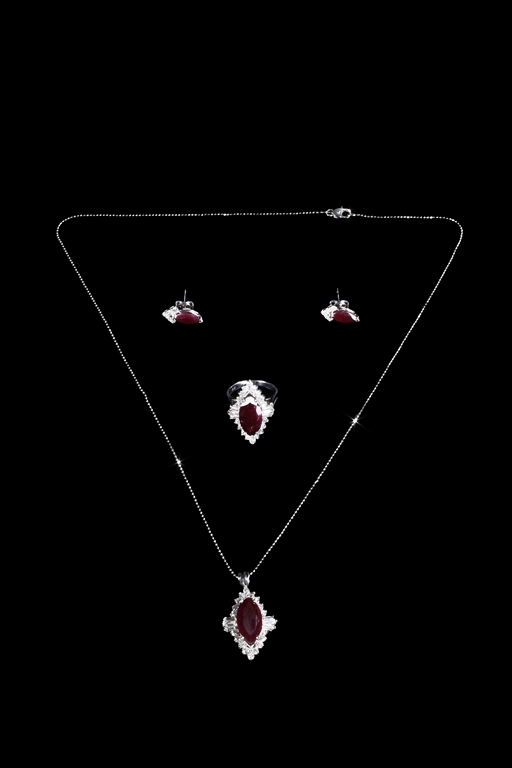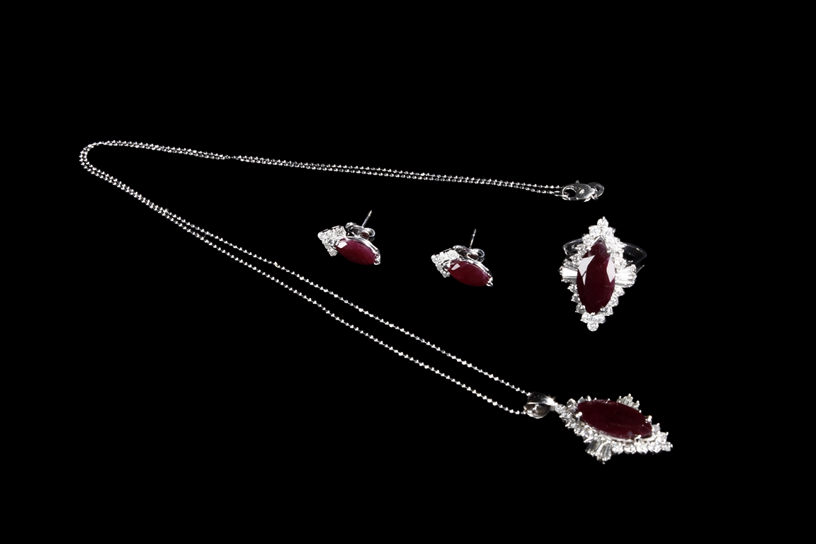 The set of ruby jewelry includes a necklace, a pair of earrings, and a ring. The necklace inset with a large 5.68 carat ruby on 14k white gold chain and 14k gold setting with 1.81 carat diamond. The ring inset with a large 4.70 carat marquise modified brilliant ruby on 14k white gold setting with 1.80 carat diamond. The pair of earrings inset with ruby totalling 1.81 carat on 18k white gold setting with 0.35 carat diamond. Includes GIA Report "10860333 for the ruby inset on ring.