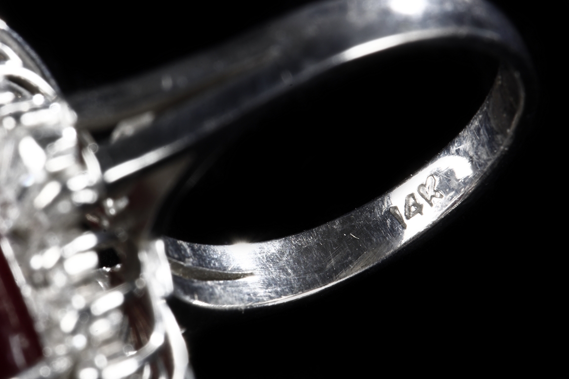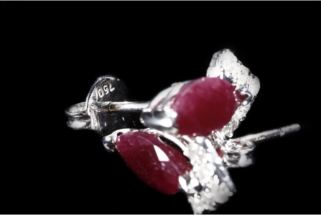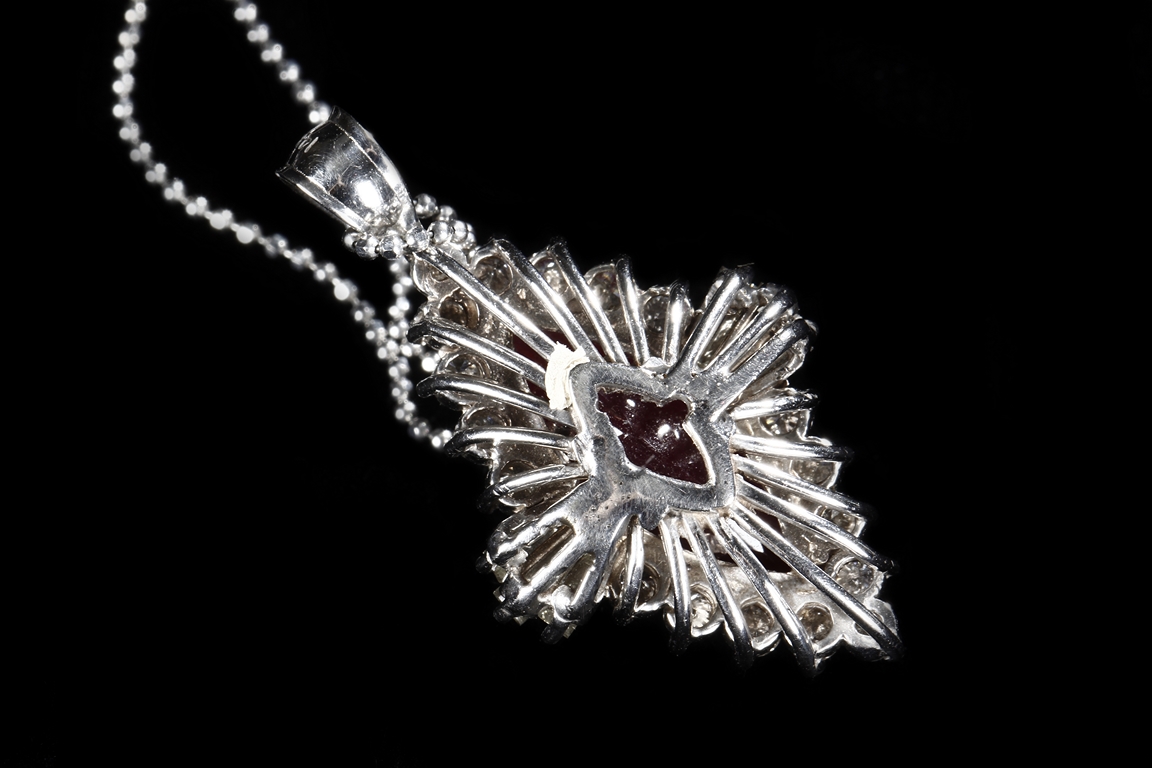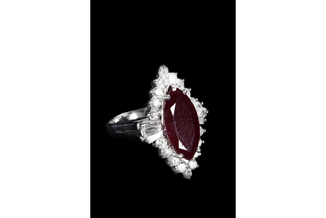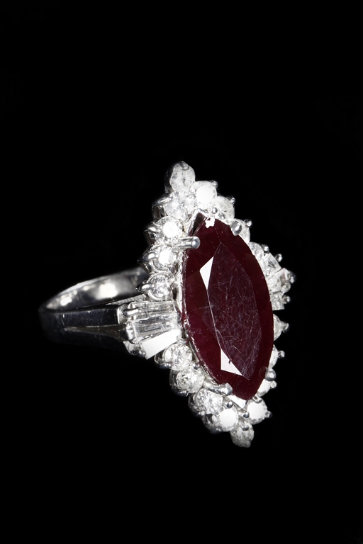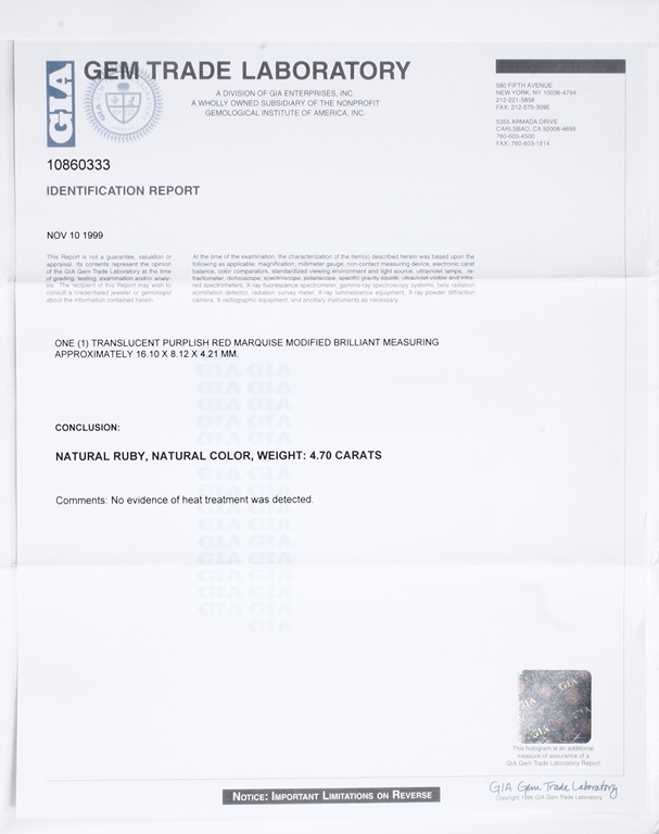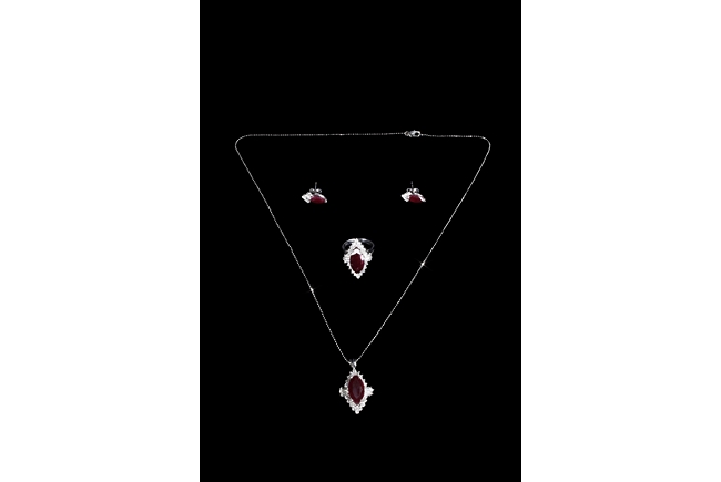 The set of ruby jewelry includes a necklace, a pair of earrings, and a ring. The necklace inset with a large 5.68 carat ruby on 14k white gold chain and 14k gold setting with 1.81 carat diamond. The ring inset with a large 4.70 carat marquise modified brilliant ruby on 14k white gold setting with 1.80 carat diamond. The pair of earrings inset with ruby totalling 1.81 carat on 18k white gold setting with 0.35 carat diamond. Includes GIA Report "10860333 for the ruby inset on ring.