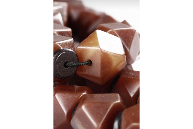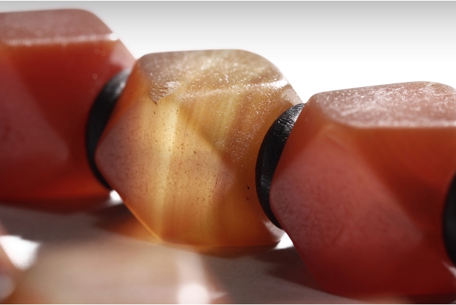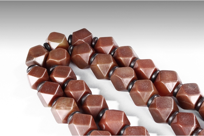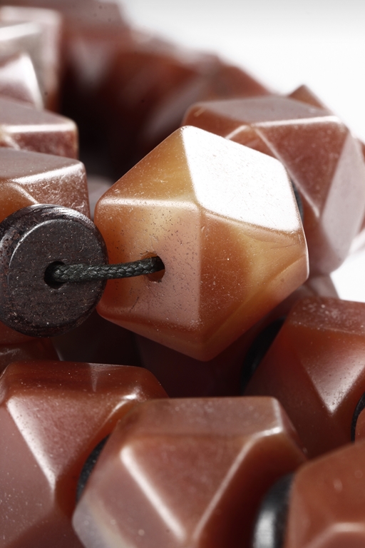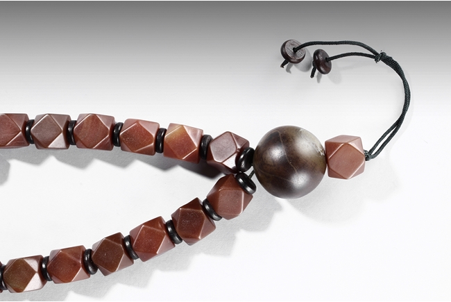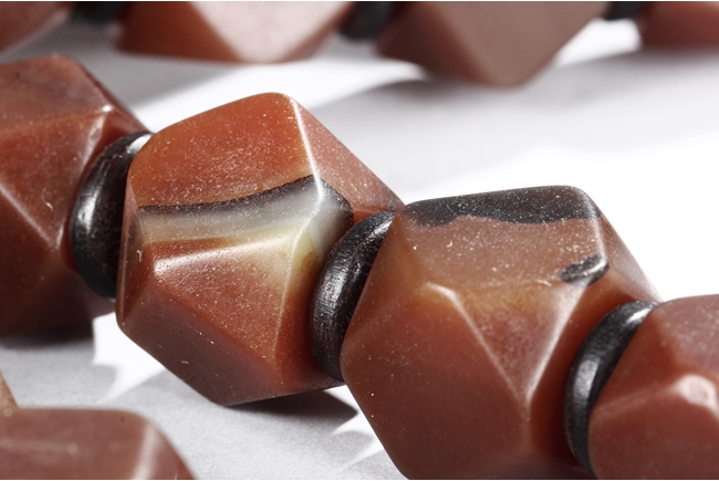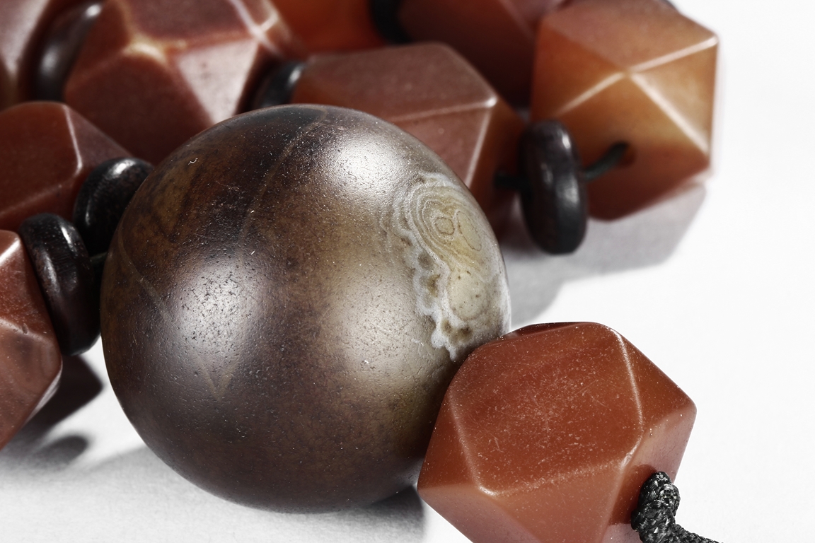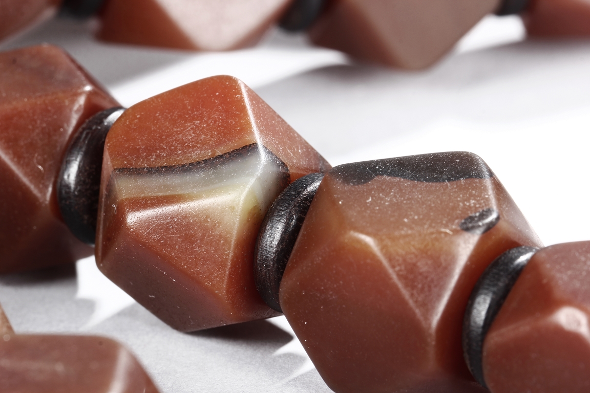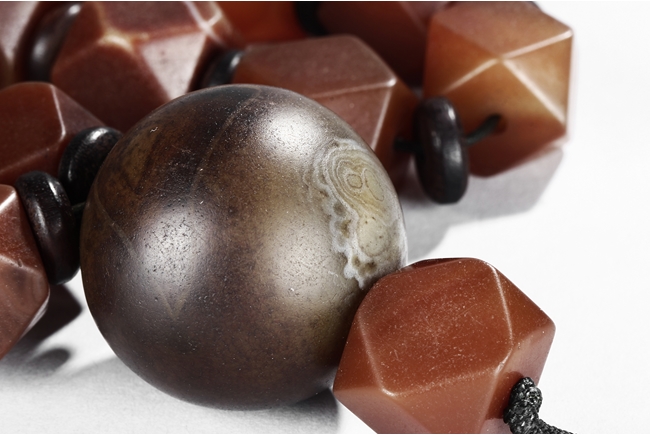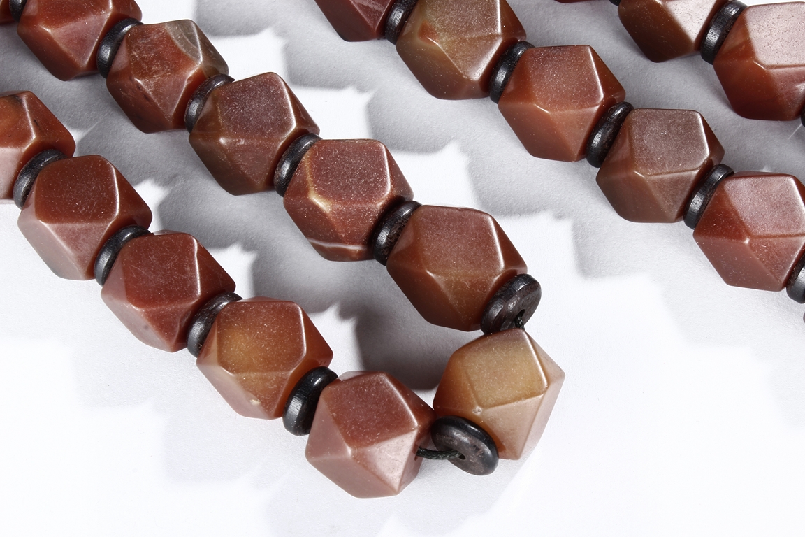 The agate of red-brown color, faceted into diamond and triangular shapes, with some in hexagonal and triangular shapes, each agate separated by a wooden ring, the end of necklace with a large round gemstone. Qing Dynasty period.