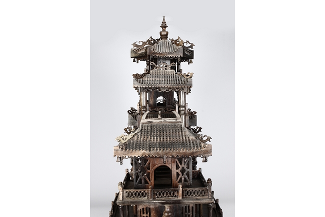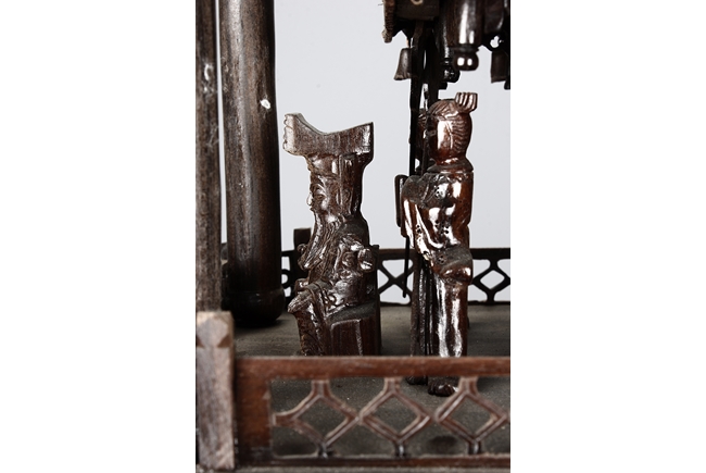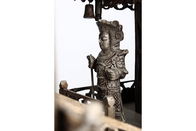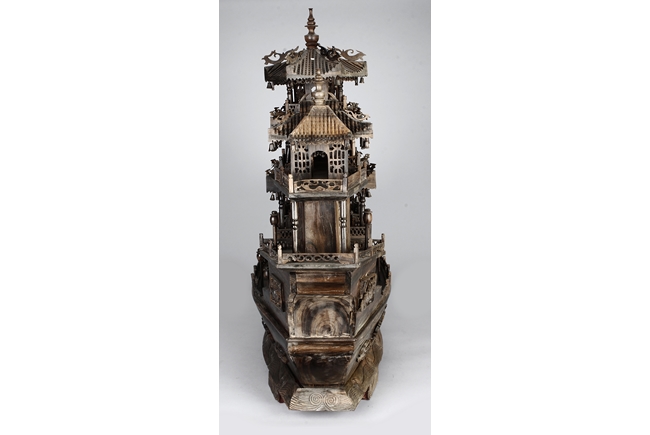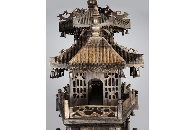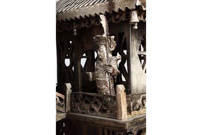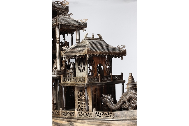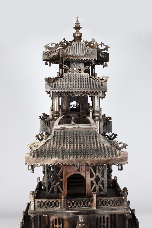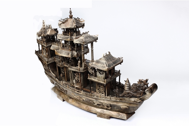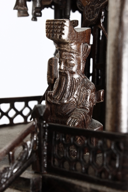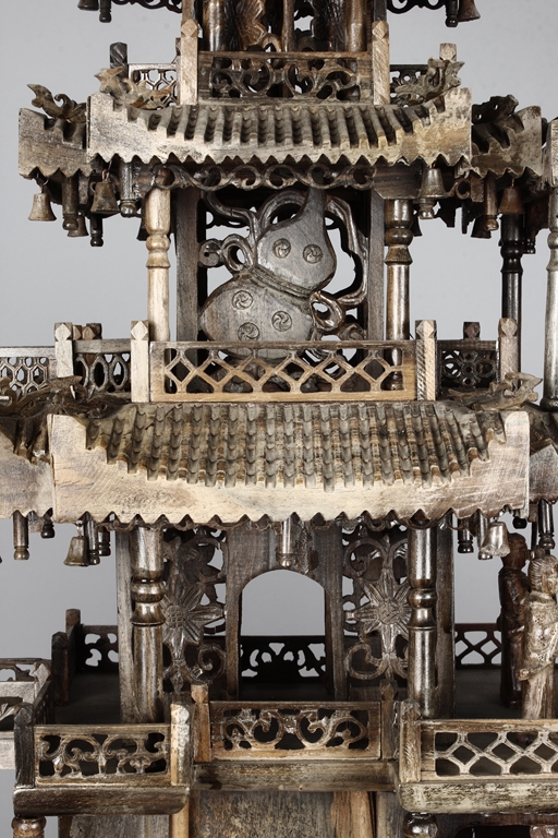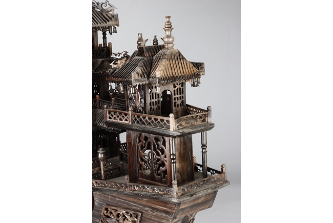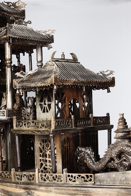 Finely carved and pierced as large boat with two dragons as prow and the deck surmounted with intricate pagodas with variously shaped Buddhist emblems openwork as windows, the structures linked to each other in bridges, with wooden figures upon the pagodas, and the hull is finely carved in low relief with various motifs of stylized foliate scroll and mythical beasts.