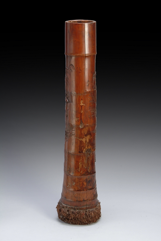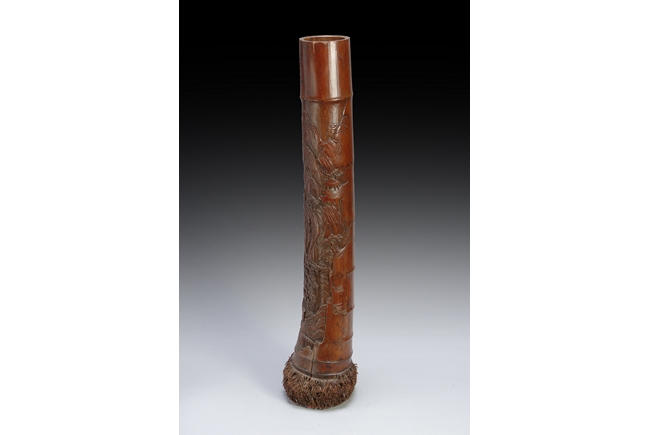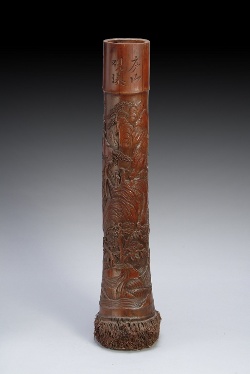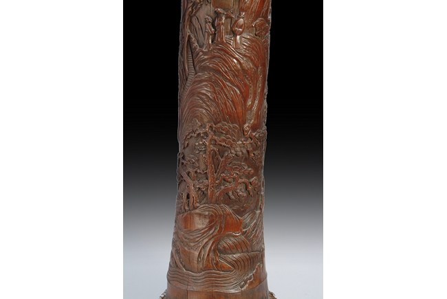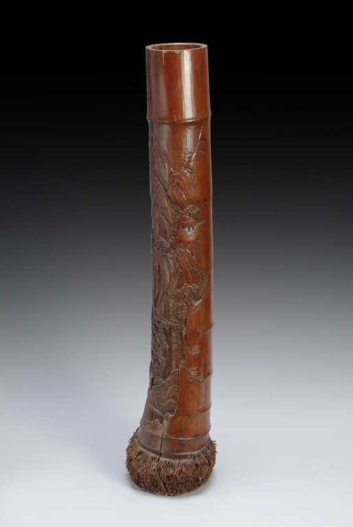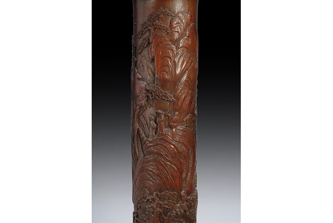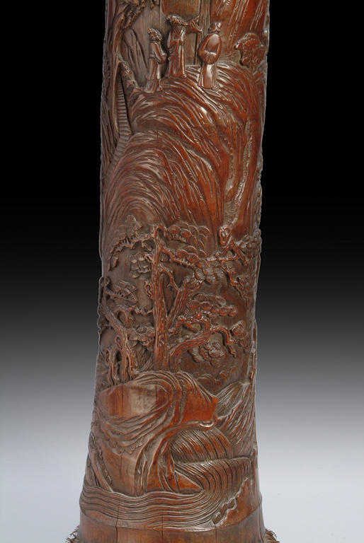This piece is carved meticulously out of a section of bamboo branch. It depicts a landscape scene with three scholars among pine groves and soaring mountain ranges. Early Republic period.